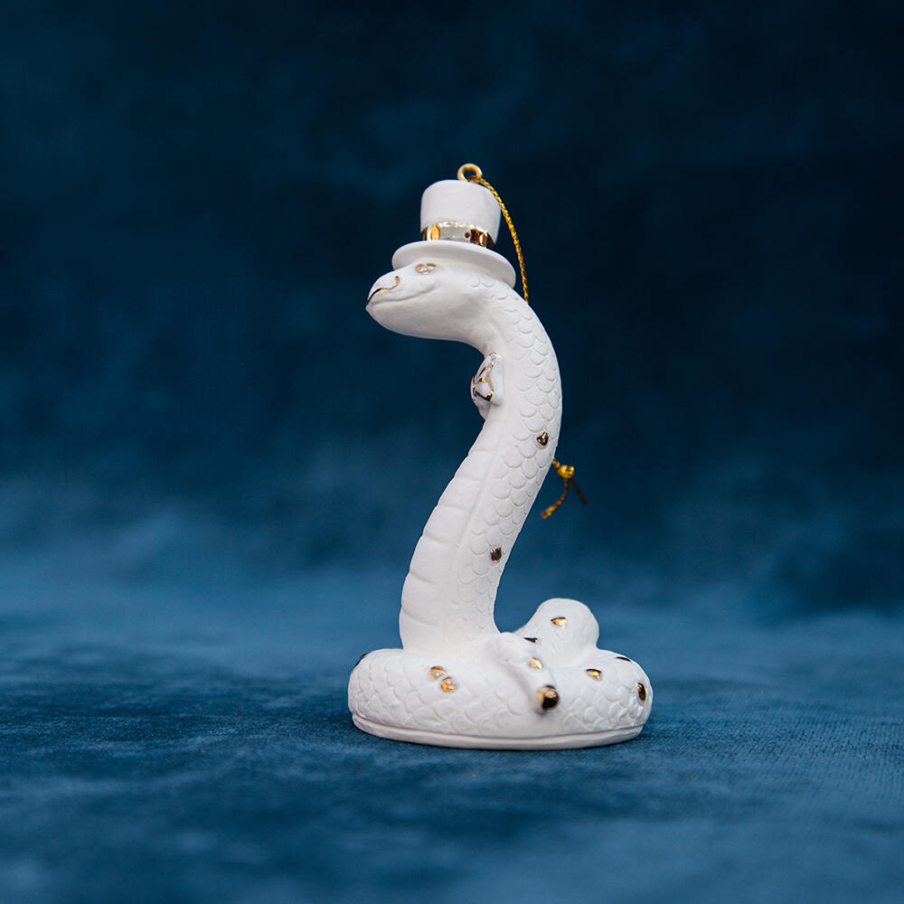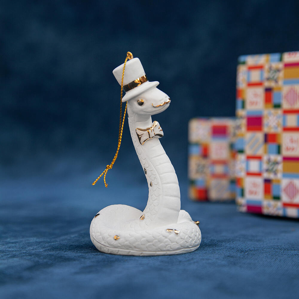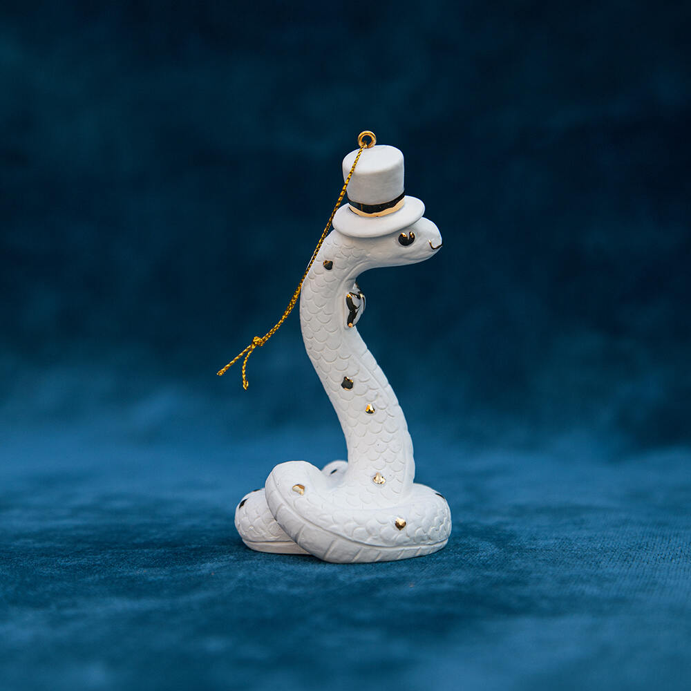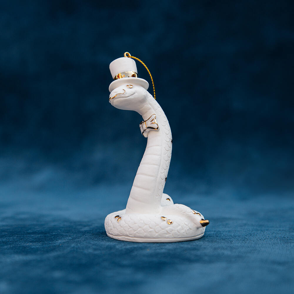 Фигурка “Змей в цилиндре” изготовлена из фарфора бисквита и украшена ручной художественной росписью золотом. Фигурка входит в коллекцию “Фарфор” и “Символы года” – настоящее произведение искусства, которое завораживает своей элегантностью и таинственностью. Белоснежная поверхность фигурки подчеркнута легкими штрихами золота, которые изящно украшают линии змеиного тела и вдохновляют на разгадку тайны, скрытой в его облике. Фигурка “Змей в Цилиндре” станет не только изысканным украшением вашей новогодней ели, но и необычным подарком для коллекционеров фарфора, который с особым шиком расскажет о вашем вкусе и оригинальности.