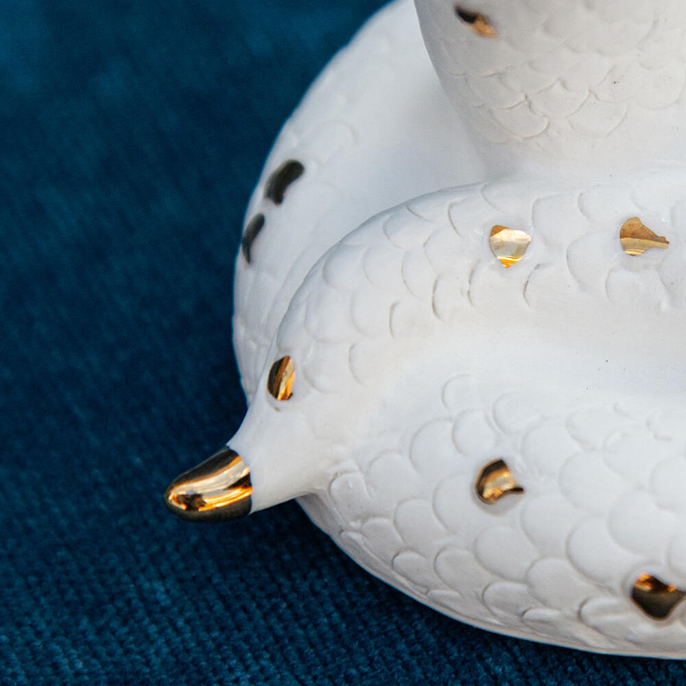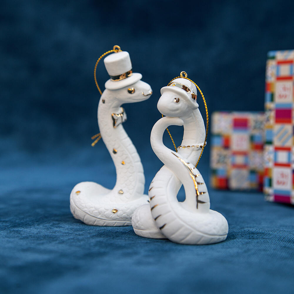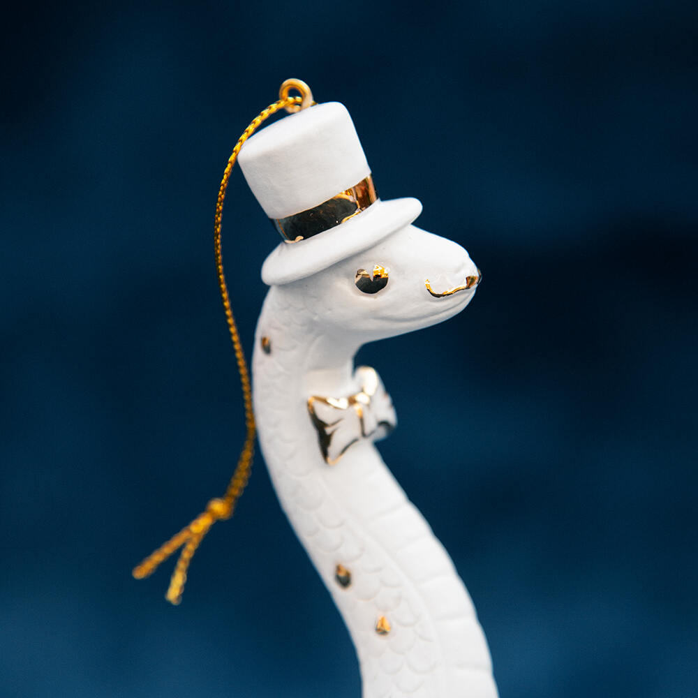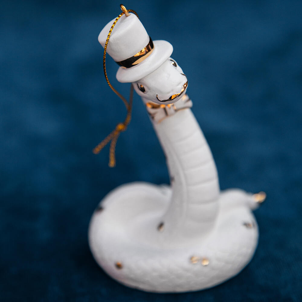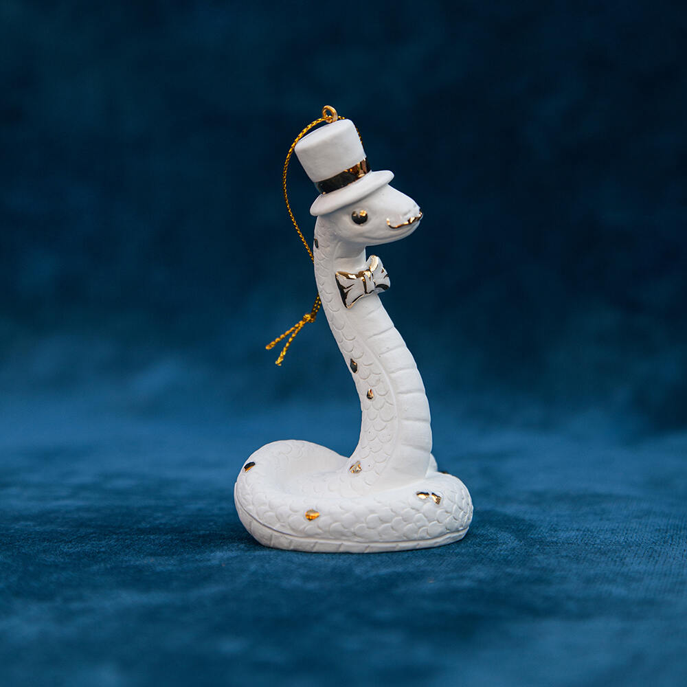 Фигурка “Змей в цилиндре” изготовлена из фарфора бисквита и украшена ручной художественной росписью золотом. Фигурка входит в коллекцию “Фарфор” и “Символы года” – настоящее произведение искусства, которое завораживает своей элегантностью и таинственностью. Белоснежная поверхность фигурки подчеркнута легкими штрихами золота, которые изящно украшают линии змеиного тела и вдохновляют на разгадку тайны, скрытой в его облике. Фигурка “Змей в Цилиндре” станет не только изысканным украшением вашей новогодней ели, но и необычным подарком для коллекционеров фарфора, который с особым шиком расскажет о вашем вкусе и оригинальности.