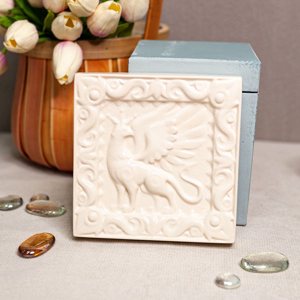 Изделие представляет керамический рельефный элемент квадратной формы, покрытый белой глазурью, на котором нанесено стилизованное изображение грифона – мифологического крылатого существа с туловищем льва и головой орла, которое имеет острые когти и белоснежные (или золотые) крылья. Грифон господствует в воздухе и на земле, олицетворяет мудрость, бдительность, уверенность и могущество. Выбранный цвет изразца придает дополнительную смысловую нагрузку изделию, поскольку белый цвет напрямую имеет отношение к духовности и символизирует доброе начало. Данное изделие может быть использовано как изразец, и как самостоятельный настенный декор. При этом смотрится стильно и эффектно, может использоваться в местах, где фантазия архитектора или дизайнера по интерьеру не ограничивается типовым решением, он позволяет сделать акцент, привлекающий взгляд, внести завораживающую изюминку в интерьер. Изразец также будет прекрасным подарком родным, близким, коллегам по работе.