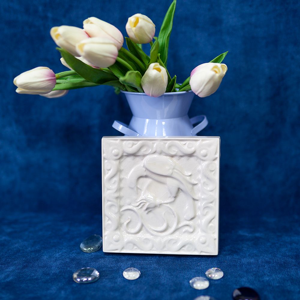 Изделие представляет керамический рельефный элемент квадратной формы, покрытый белой глазурью, на котором нанесено стилизованное изображение птицы, которая пьёт нектар из цветка. По фен шуй птицы символизируют новые возможности. Символы птиц, так же как и символы-цветы обладают внутренней универсальной энергией, приносят в дом удачу, процветание, благополучие и достаток. Выбранный цвет изразца придает дополнительную смысловую нагрузку изделию, поскольку белый цвет напрямую имеет отношение к духовности и символизирует доброе начало. Данное изделие может быть использовано как изразец, и как самостоятельный настенный декор. При этом смотрится стильно и эффектно, может использоваться в местах, где фантазия архитектора или дизайнера по интерьеру не ограничивается типовым решением, он позволяет сделать акцент, привлекающий взгляд, внести завораживающую изюминку в интерьер. Изразец также будет прекрасным подарком родным, близким, коллегам по работе.