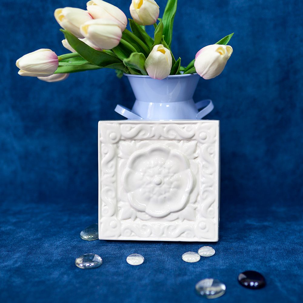 Изделие представляет керамический рельефный элемент квадратной формы, покрытый белой глазурью, на котором нанесено стилизованное изображение солнца. Солнце — источник жизни на нашей планете, поэтому с самой глубокой древности оно являлось прежде всего символом созидательной энергии. Ещё это знак мужского начала, знаний и интеллекта, величия и храбрости. При этом выбранный цвет усиливает символику изделия, поскольку При этом выбранный цвет придает дополнительную смысловую нагрузку изделию, поскольку белый цвет напрямую имеет отношение к духовности и символизирует доброе начало. Данное изделие может быть использовано как изразец, и как самостоятельный настенный декор. При этом смотрится стильно и эффектно, может использоваться в местах, где фантазия архитектора или дизайнера по интерьеру не ограничивается типовым решением, он позволяет сделать акцент, привлекающий взгляд, внести завораживающую изюминку в интерьер. Изразец также будет прекрасным подарком родным, близким, коллегам по работе.