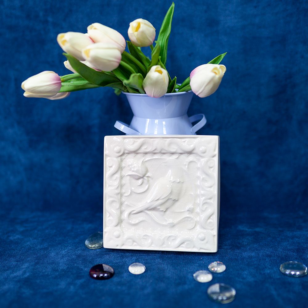 Изделие представляет керамический рельефный элемент квадратной формы, покрытый белой глазурью, на котором нанесено стилизованное изображение соловья, вестника майских дней, певца обновления, утра, певца садов. Соловей – это символ любви и радости, трепетной человеческой души. Оберегает брачные узы, приносит мир в дом. При этом выбранный цвет придает дополнительную смысловую нагрузку изделию, поскольку белый цвет напрямую имеет отношение к духовности и символизирует доброе начало. Данное изделие может быть использовано как изразец, и как самостоятельный настенный декор. При этом смотрится стильно и эффектно, может использоваться в местах, где фантазия архитектора или дизайнера по интерьеру не ограничивается типовым решением, он позволяет сделать акцент, привлекающий взгляд, внести завораживающую изюминку в интерьер. Изразец также будет прекрасным подарком родным, близким, коллегам по работе.