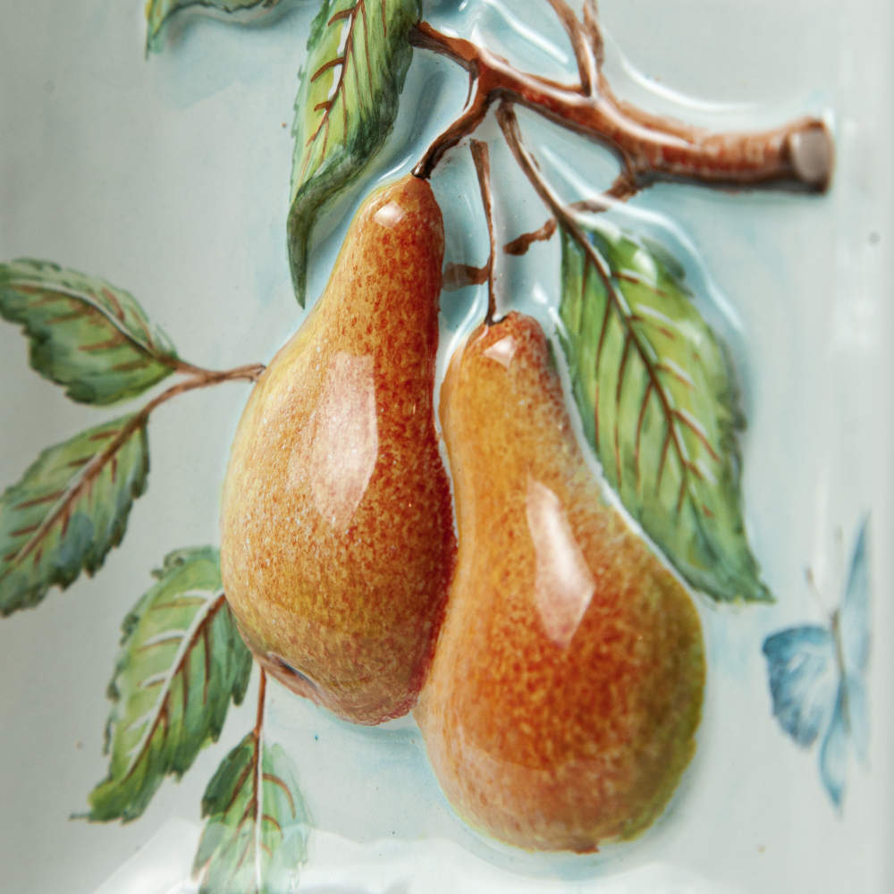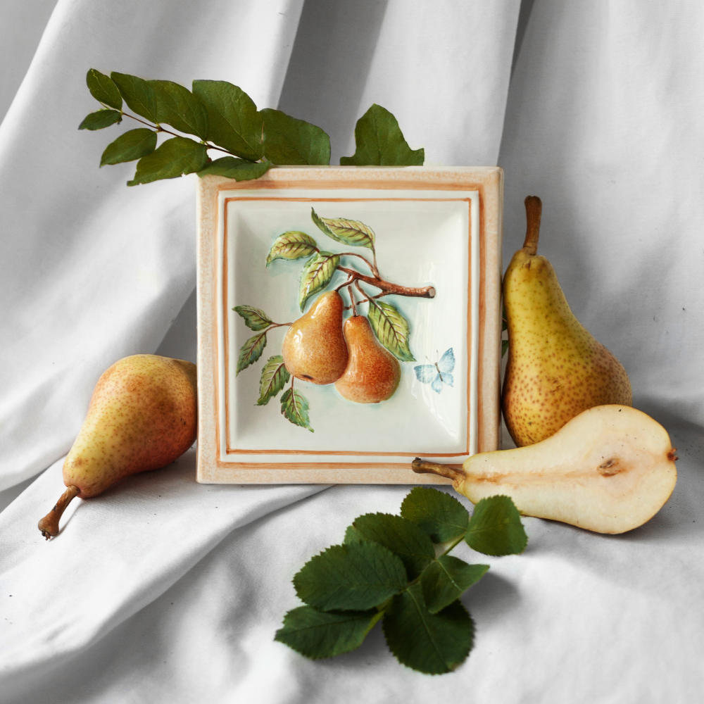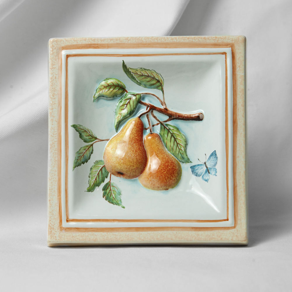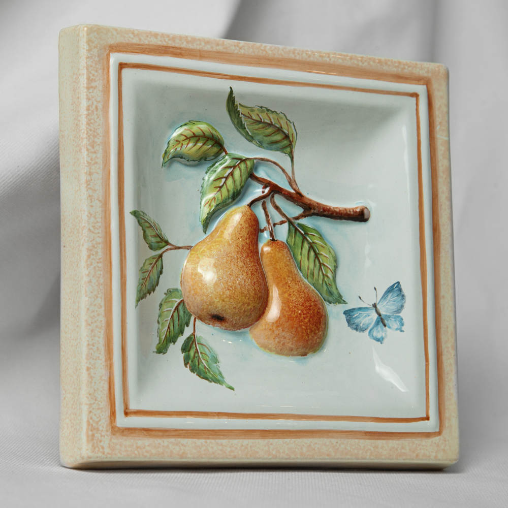 Изделие представляет керамический рельефный элемент квадратной формы, расписанный вручную, с объемным изображением ветки с красивыми, сочными грушами в центре. Груша –символ долговечности и верной любви. Грушевое дерево, дарящее людям чудесные плоды, было известно нашим предкам за три тысячелетия до нашей эры. Данное изделие может быть использовано как самостоятельный настенный декор, и как изразец. Декор смотрится ярко и эффектно, может использоваться в местах, где фантазия архитектора или дизайнера по интерьеру не ограничивается типовым решением, он позволяет сделать акцент, привлекающий взгляд, внести завораживающую изюминку в интерьер. Декор также будет прекрасным подарком родным, близким, коллегам по работе.