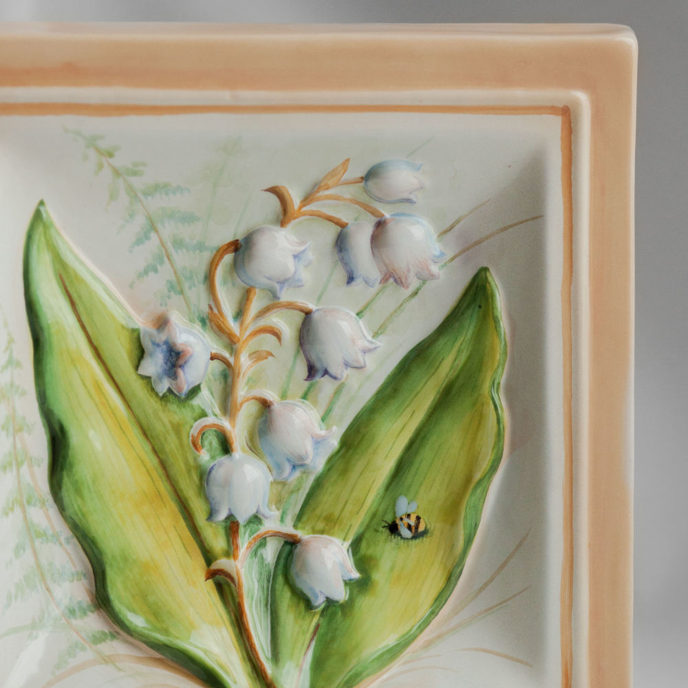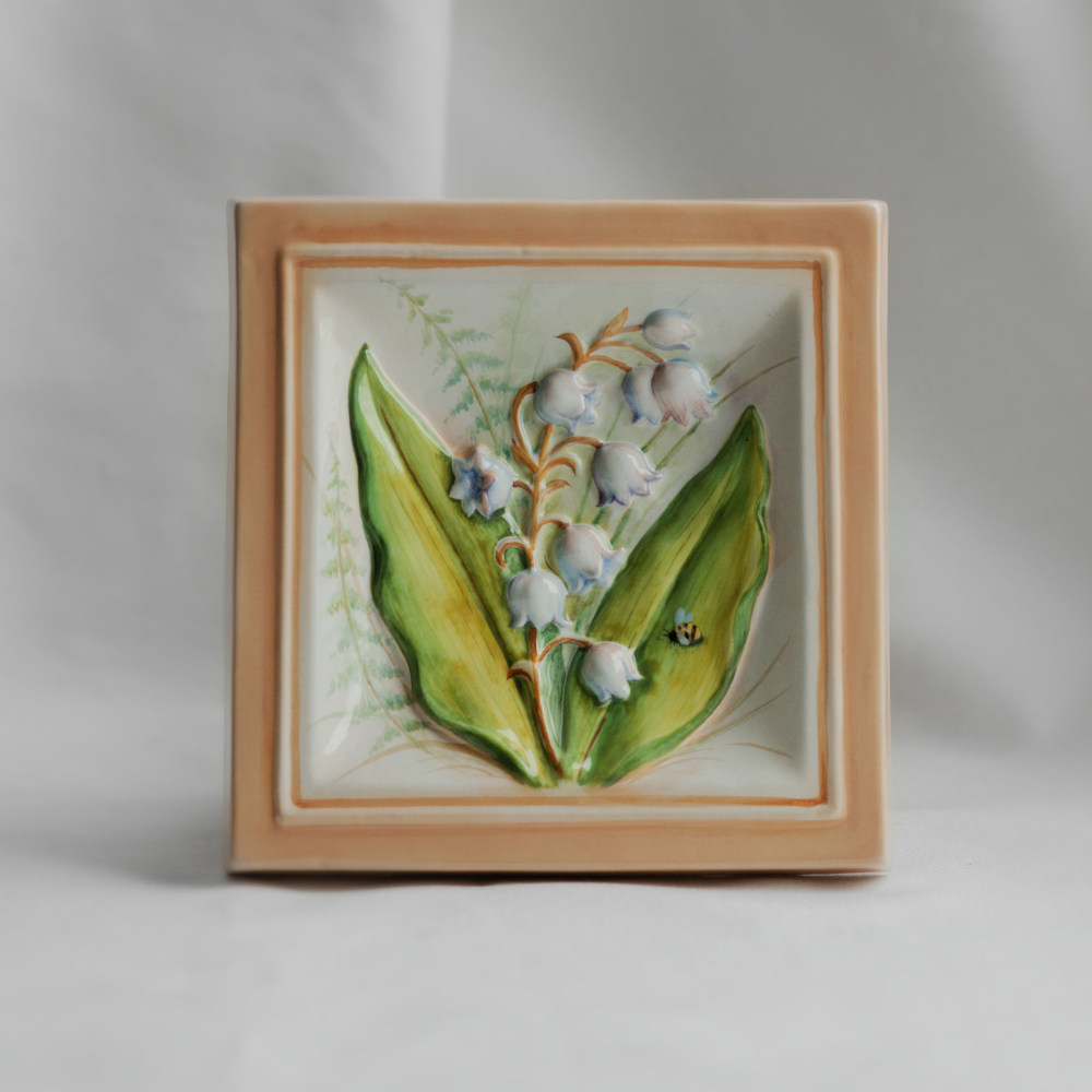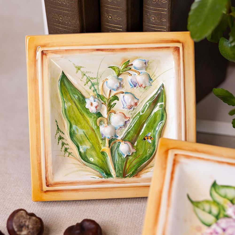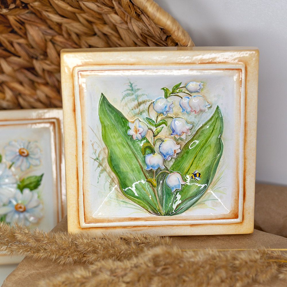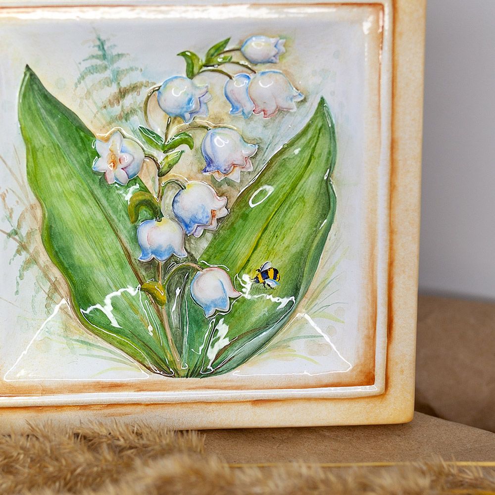 Изделие представляет керамический рельефный элемент квадратной формы, расписанный вручную, с объемным изображением ландышей в центре. Красивый нежный цветок оттенен едва заметными листьями папоротника, на листке можно заметить пчелу, которую привлёк насыщенный запах цветов. Ландыши символизируют чистоту, мечту, радость, исполнение желаний, смирение, скромность и возвращение к счастью. Данное изделие может быть использовано как самостоятельный настенный декор, и как изразец. Декор смотрится ярко и эффектно, может использоваться в местах, где фантазия архитектора или дизайнера по интерьеру не ограничивается типовым решением, он позволяет сделать акцент, привлекающий взгляд, внести завораживающую изюминку в интерьер. Декор также будет прекрасным подарком родным, близким, коллегам по работе.