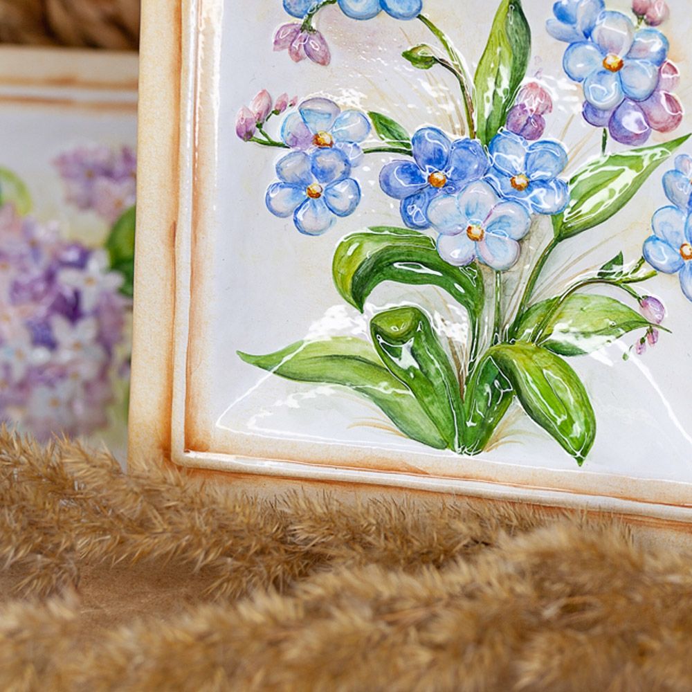 Изделие представляет керамический рельефный элемент квадратной формы, расписанный вручную, с объемным изображением прелестных незабудок, с нежно голубыми, как бирюза, лепестками и ярко-желтой, точно из золота сделанной, серединкой. Символика незабудки у всех народов одинакова и неизменна. Незабудка – цветок памяти и верности. Данное изделие может быть использовано как самостоятельный настенный декор, и как изразец. Декор смотрится ярко и эффектно, может использоваться в местах, где фантазия архитектора или дизайнера по интерьеру не ограничивается типовым решением, он позволяет сделать акцент, привлекающий взгляд, внести завораживающую изюминку в интерьер. Декор также будет прекрасным подарком родным, близким, коллегам по работе.