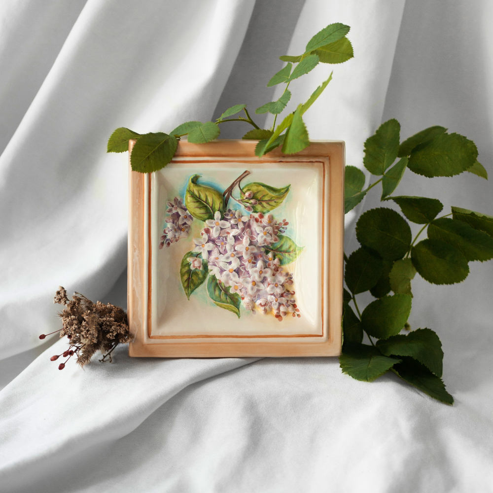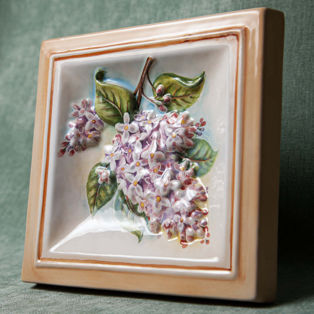 Изделие представляет керамический рельефный элемент квадратной формы, расписанный вручную, с объемным изображением сирени в центре. Сирень считается символом весны и радости. Запах сирени, заполняющий все вокруг в мае, дурманит и пьянит. Также она символизирует нежное отношение к тому, кому дарят сирень. Данное изделие может быть использовано как самостоятельный настенный декор, и как изразец. Декор смотрится ярко и эффектно, может использоваться в местах, где фантазия архитектора или дизайнера по интерьеру не ограничивается типовым решением, он позволяет сделать акцент, привлекающий взгляд, внести завораживающую изюминку в интерьер. Декор также будет прекрасным подарком родным, близким, коллегам по работе.