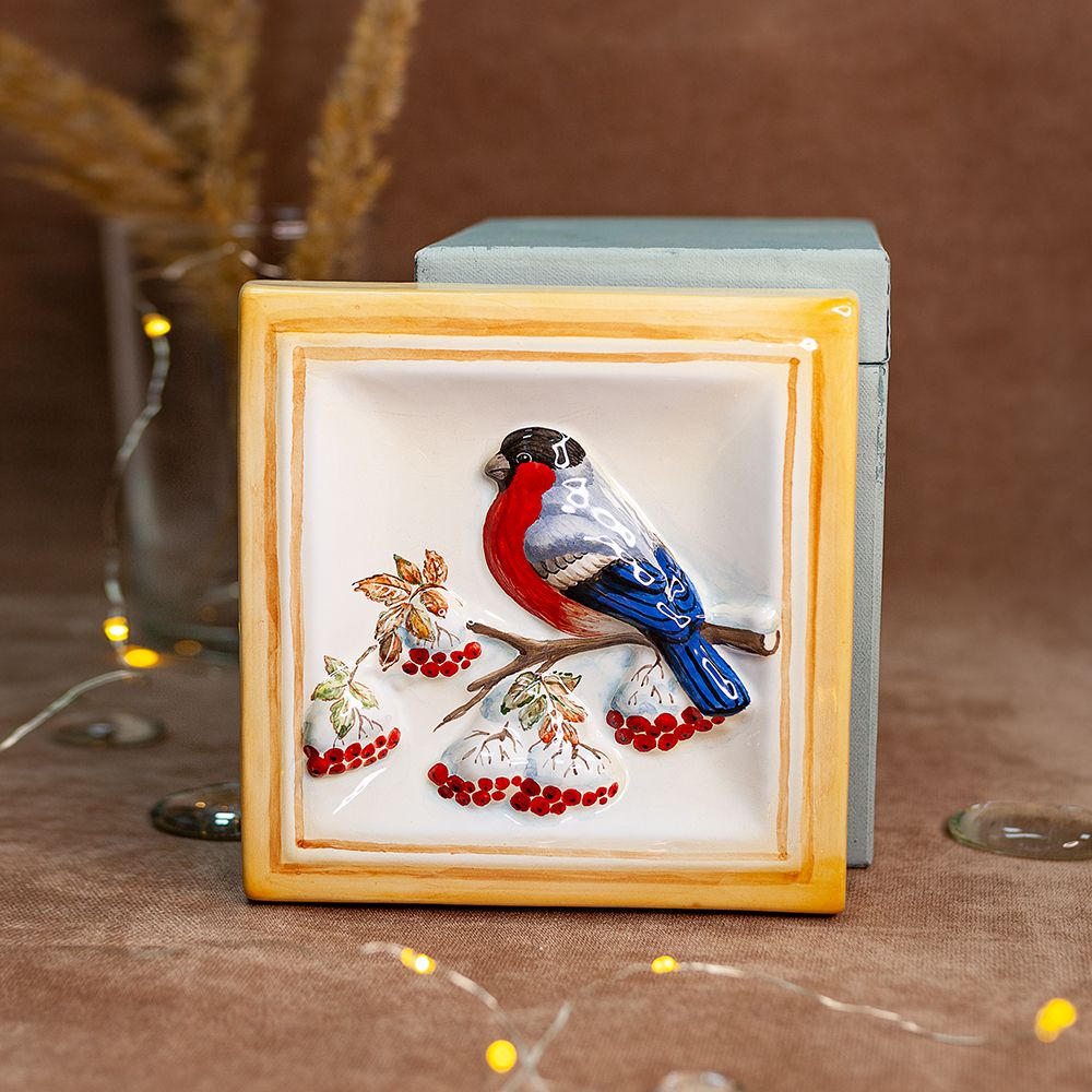 Изделие представляет керамический рельефный элемент квадратной формы, расписанный вручную, с объемным изображением снегиря с грудкой цвета алой зари, сидящего на заснеженной ветке красной рябины. Снегирь – символ настоящей русской зимы. Декор смотрится ярко и очень эффектно, он позволяет сделать акцент, привлекающий взгляд, внести завораживающую изюминку в интерьер. Данное изделие может быть использовано как самостоятельный настенный декор, и как изразец. Декор также будет прекрасным подарком родным, близким, коллегам по работе.