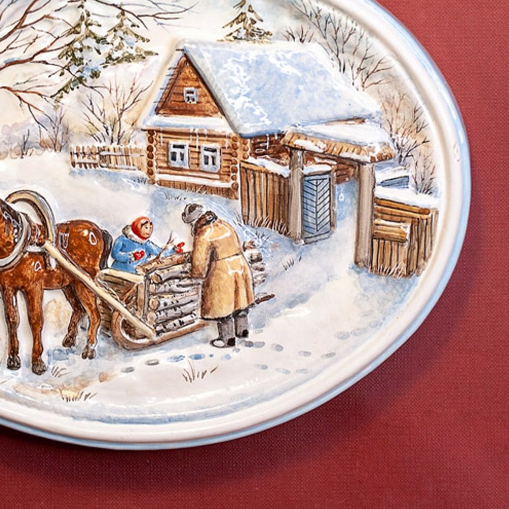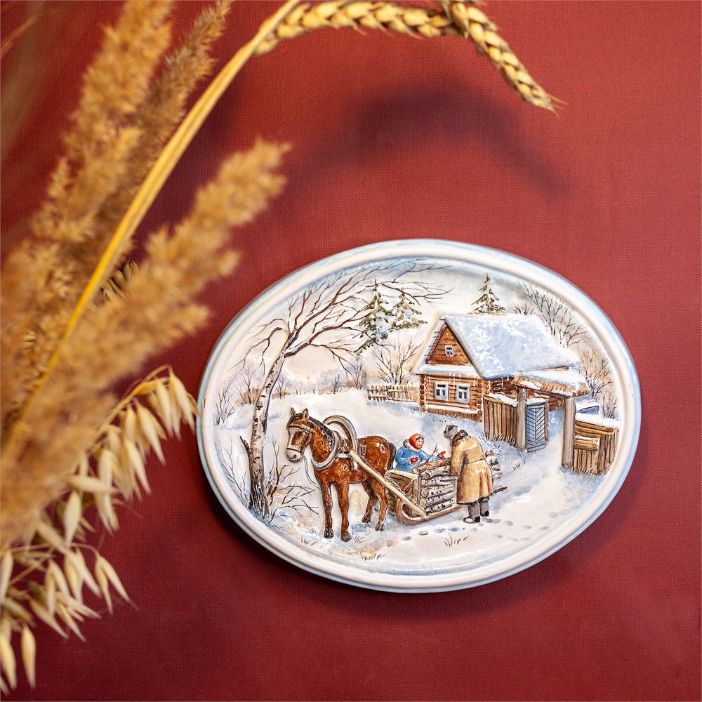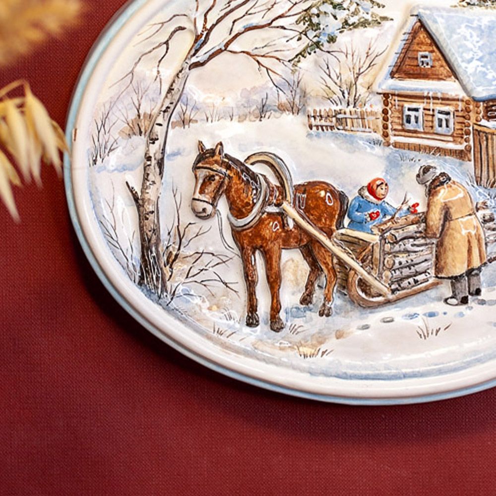 Рельеф “”Зимушка – зима”” изготовлен в технике майолика и украшен ручной художественной росписью. Мастером очень тонко изображена жизнь русской деревни – самобытные жители и их повседневный быт, домик в деревне, лошадка запряженная в сани привезла из лесу дров. Каждая деталь и фигура на изделии, заставляет задуматься и воссоздает образы повседневной жизни нашего народа. Этот керамический рельеф станет не только великолепным украшением для интерьера, но и настоящим произведением искусства, которое будет радовать своего владельца душевным теплом и ностальгией за прошлыми временами. Он станет уникальным подарком, который подчеркнет изысканный вкус и внимательное отношение к традициям и наследию.”