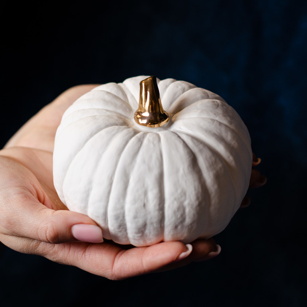 Белоснежное исполнение привычной тыквы придает изделию особую оригинальность, а матовая поверхность фарфора бисквита превосходно передает ее натуральный рельеф. Золотые акценты добавляют фигуре торжественности, подчеркивая ее нарядный и праздничный внешний вид.