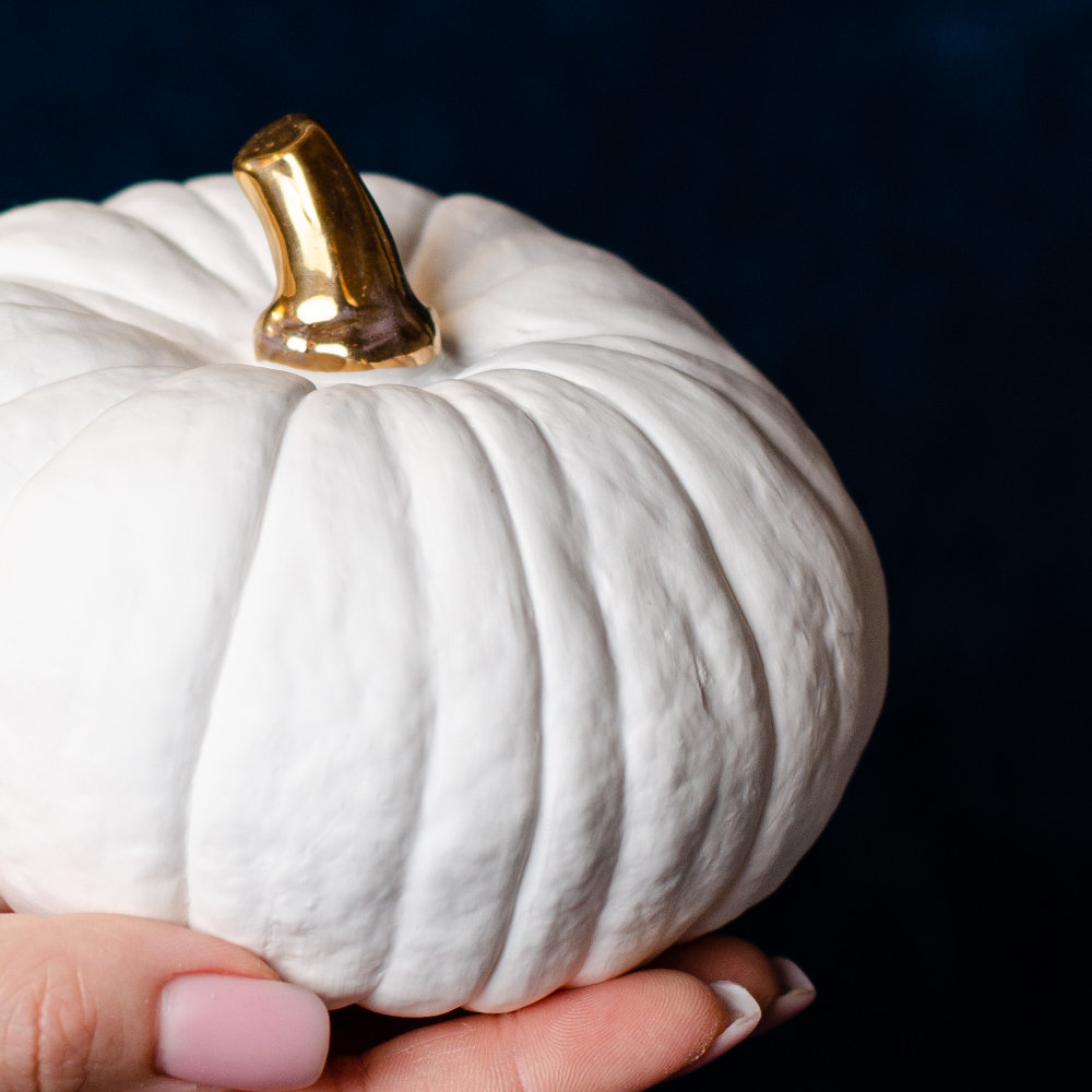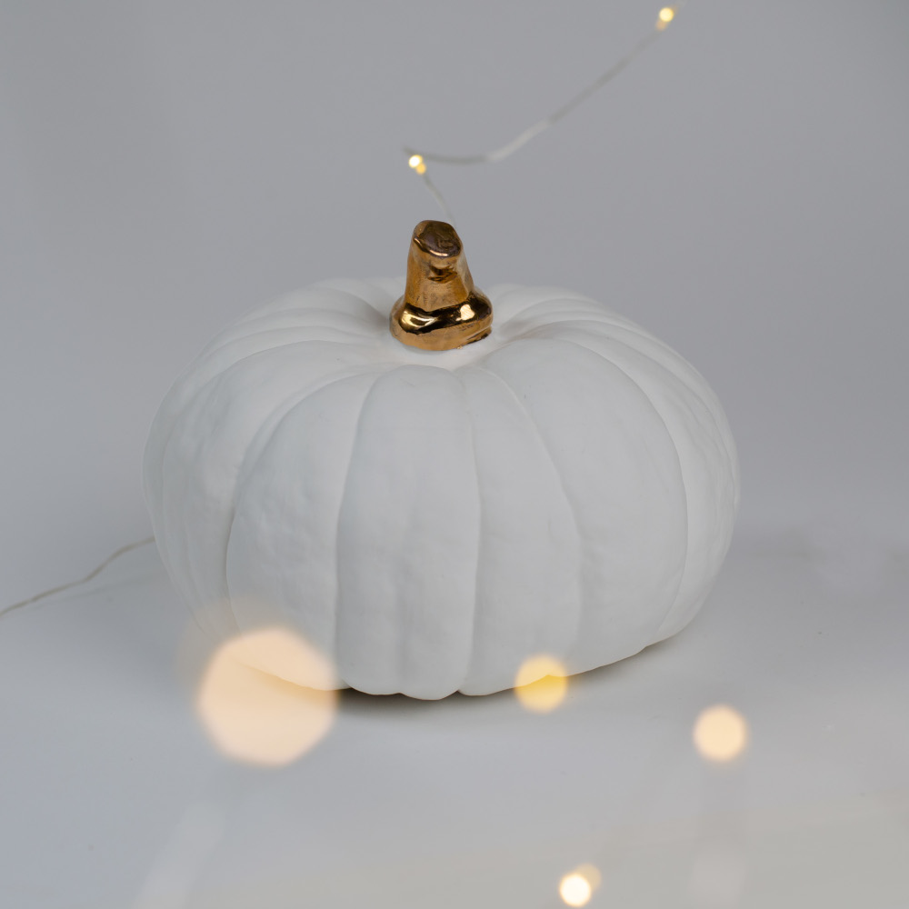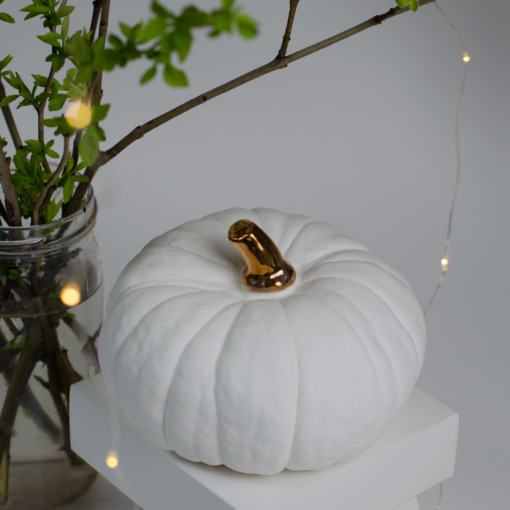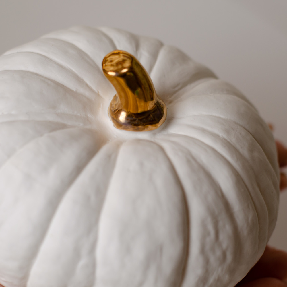 Интерьерная фигура “Тыква” выполнена из фарфора бисквита и украшена золотой росписью.