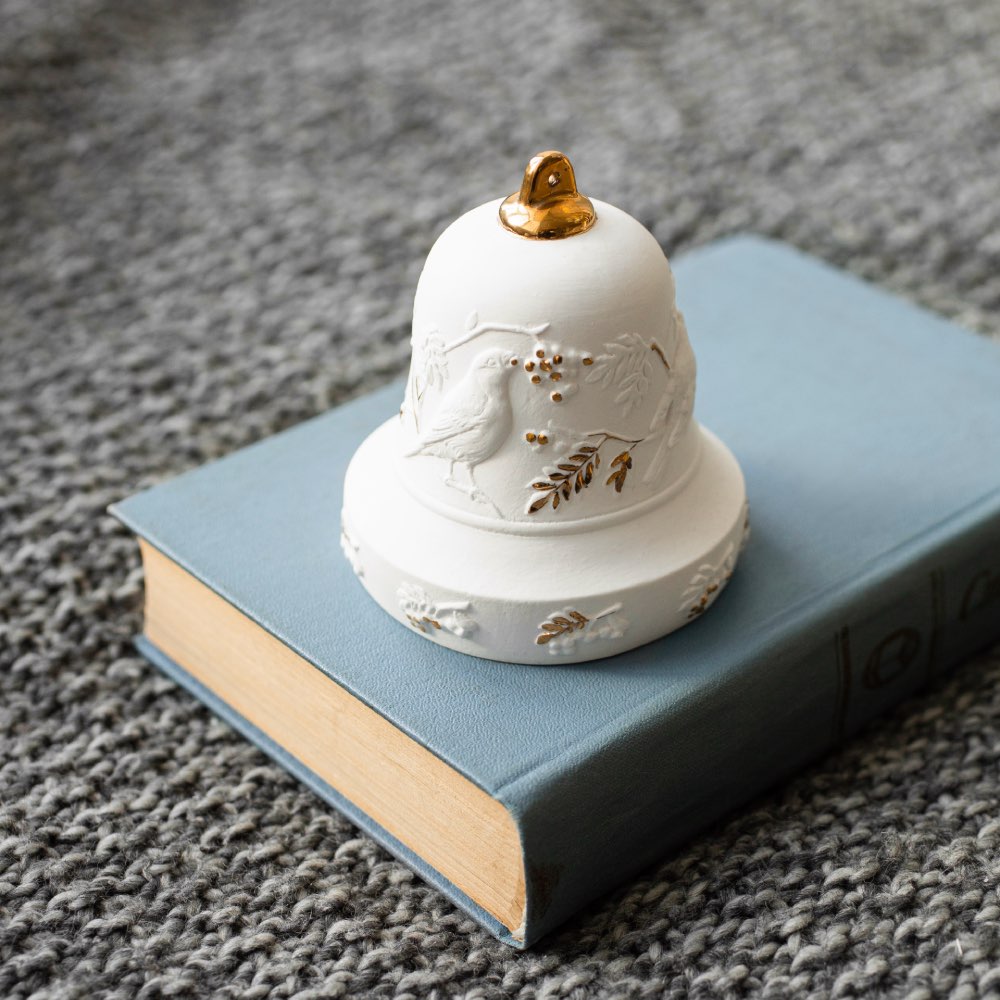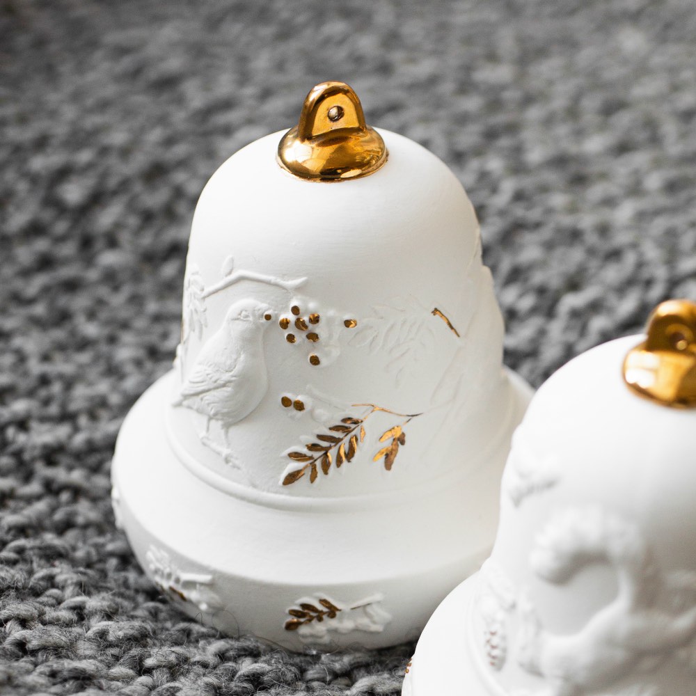 Изделие ручной работы, представляет собой колокол со снегирями, покрытый золотом, который несомненно не оставит равнодушными взрослых и детей. Фарфоровый колокол станет замечательным украшением для новогодней ёлки, и также будет прекрасным подарком. А вы уже слышали его звон?
