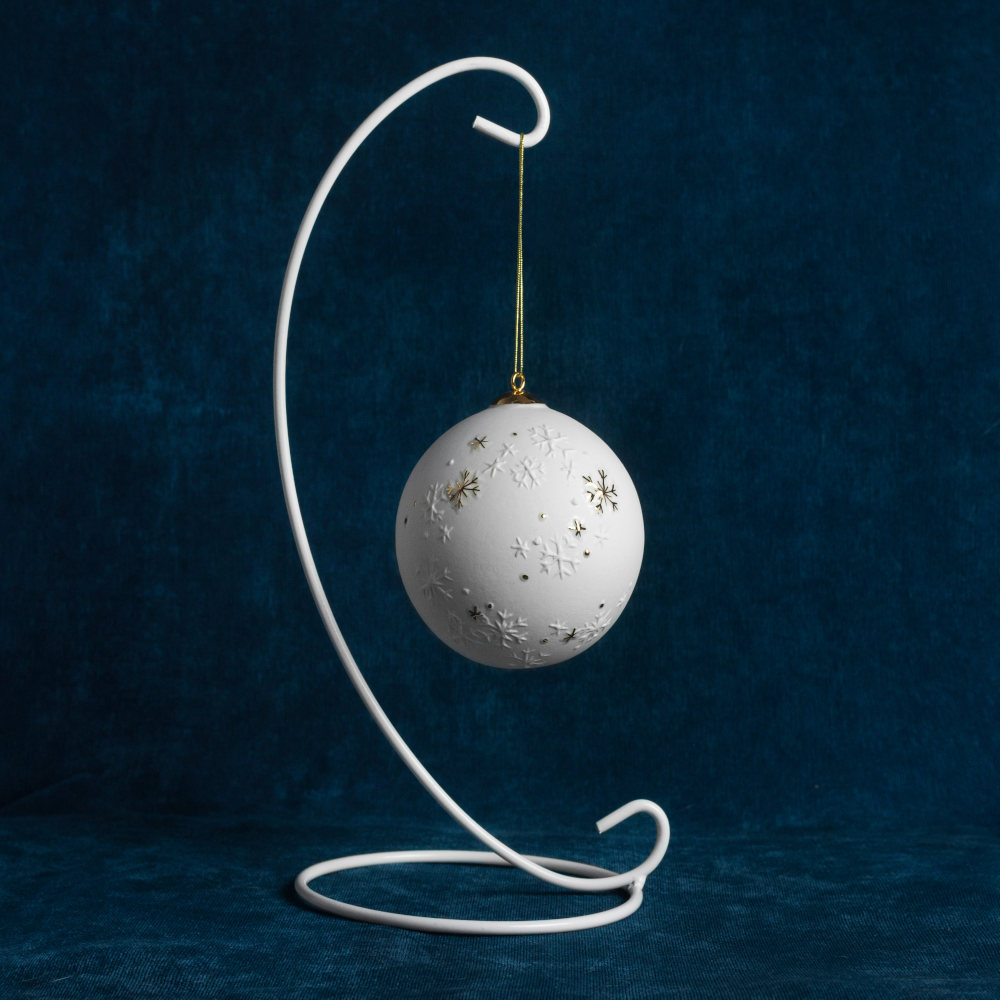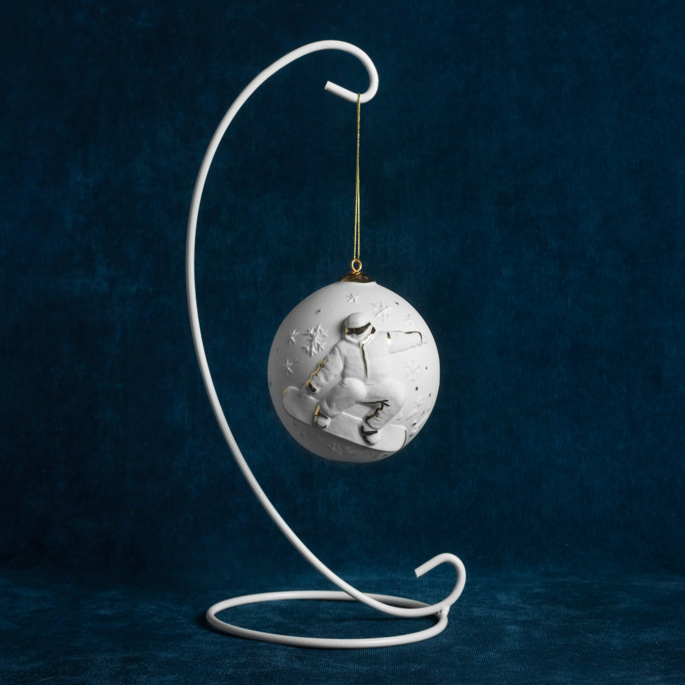 Елочный шар “Сноубордист” изготовлен из фарфора бисквита, с рельефным изображением сноубордиста на доске, украшенный тонкой золотой прорисовкой. Шар входит в новогоднюю спортивную коллекцию шаров и олицетворяет эстетику зимних видов спорта. Красота белоснежного фарфора переплетается с динамикой движений спортсмена и олицетворяет красоту самого изделия вплетенную в каждый штрих. В прошлом, фарфор считался предметом роскоши, доступным только богатым людям и аристократам. Его дарили на праздники и передавали по наследству. Шар представлен в элегантной подарочной упаковке и украсит собой не только вашу ёлку и рождественские гирлянды – это запоминающийся подарок как на Новый год и Рождество, как для любителей спорта, так и для коллекционеров фарфоровых изделий ручной работы.