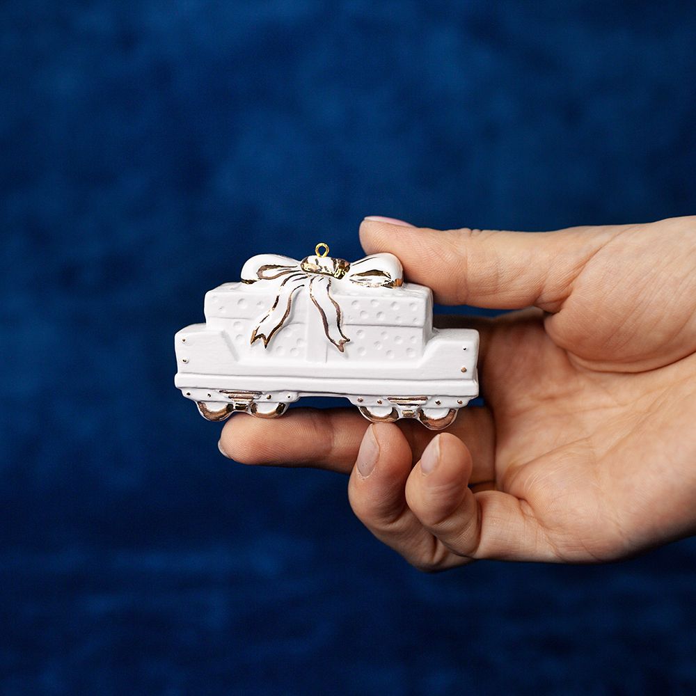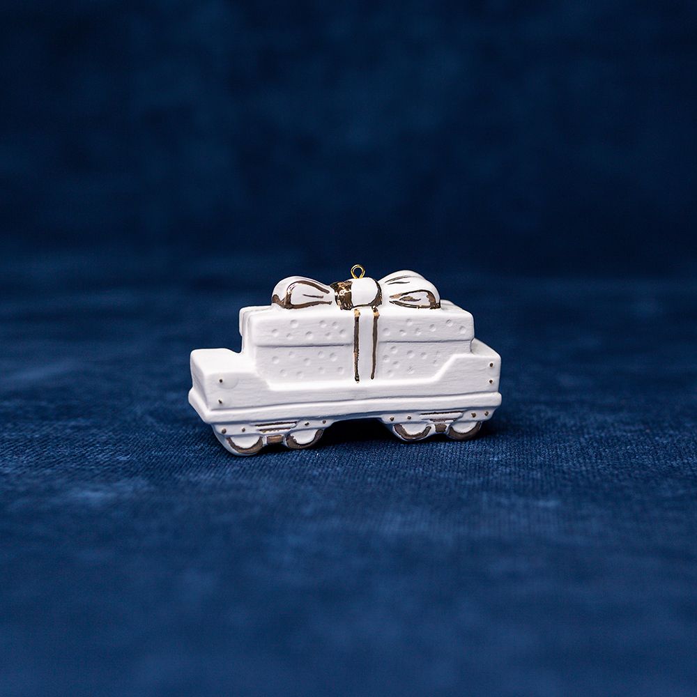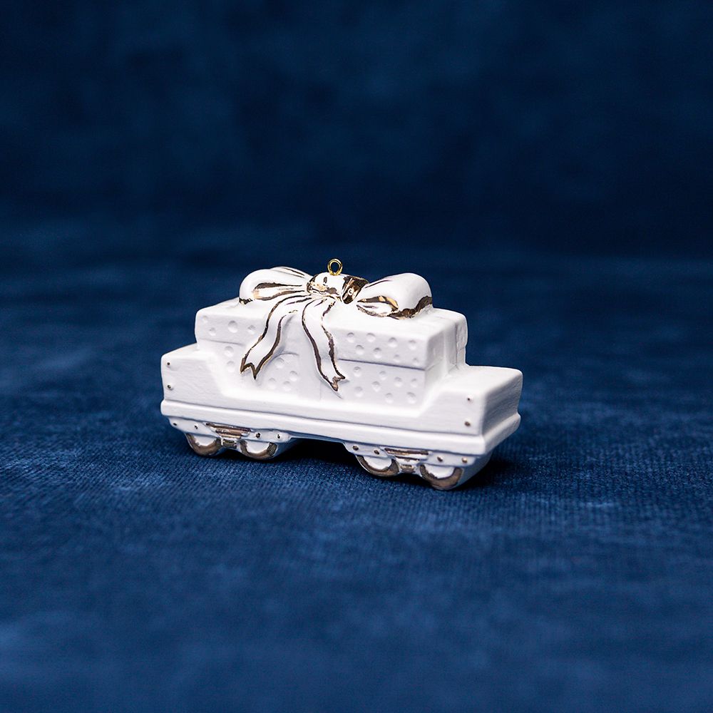 Ёлочная игрушка Вагончик с большим подарком (фарфор, золото)