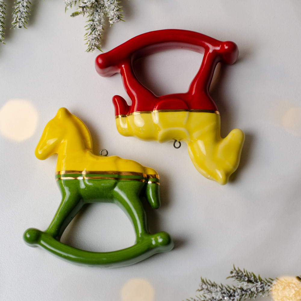 Фигурка-подвеска «Лошадка-качалка» выполнена из белой глины, декорирована яркими цветными глазурями и утончённой золотой росписью.