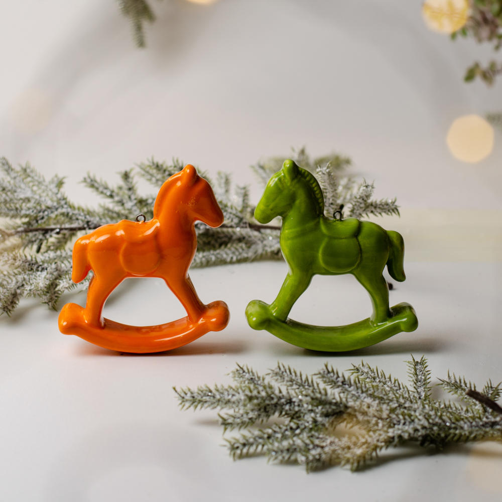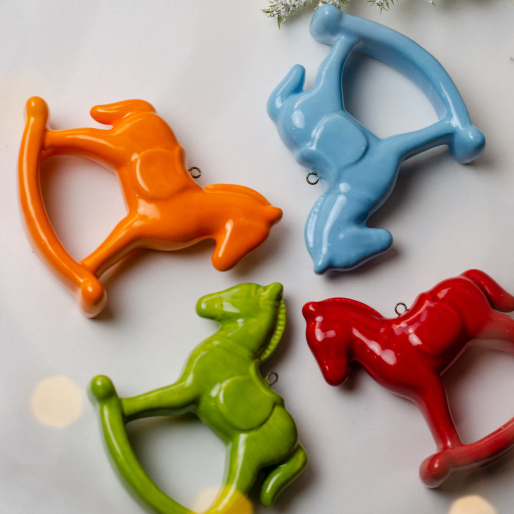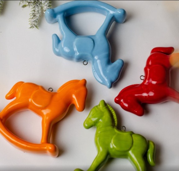 Фигурка подвес “Лошадка качалка” изготовлена из белой глины и украшена цветными глазурями.