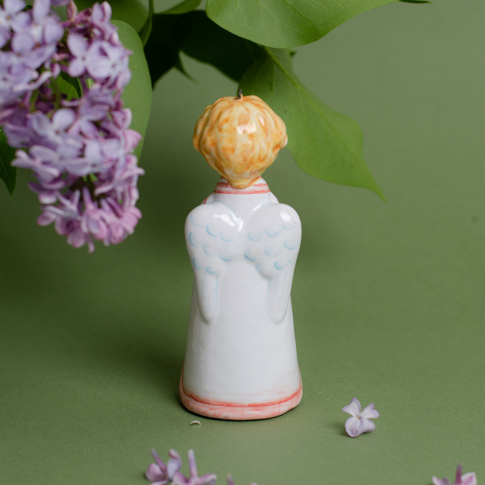 Это изделие ручной работы представляет собой фигурку ангела ручной работы, которая расписана художником нежными и легкими оттенками. Гармоничное сочетание цветов приносит особое настроение ожидания чуда. Ангел представлен в простом и понятном облике, со светлыми волосами и нежной улыбкой. Станет прекрасным подарком на именины, свадьбы, Новый год, Рождество, Пасху и другие праздники. Принято считать, что Ангелы избавляют от опасности, помогают преодолеть трудности, наполняют нашу жизнь миром и любовью. Наш Ангел словно излучает тепло. Изображения ангела принято дарить на удачу, так же Ангелы избавляют от опасности. Ангел станет украшением Вашей коллекции керамики, и возможно, прошепчет о том, почему он неизменно улыбается.