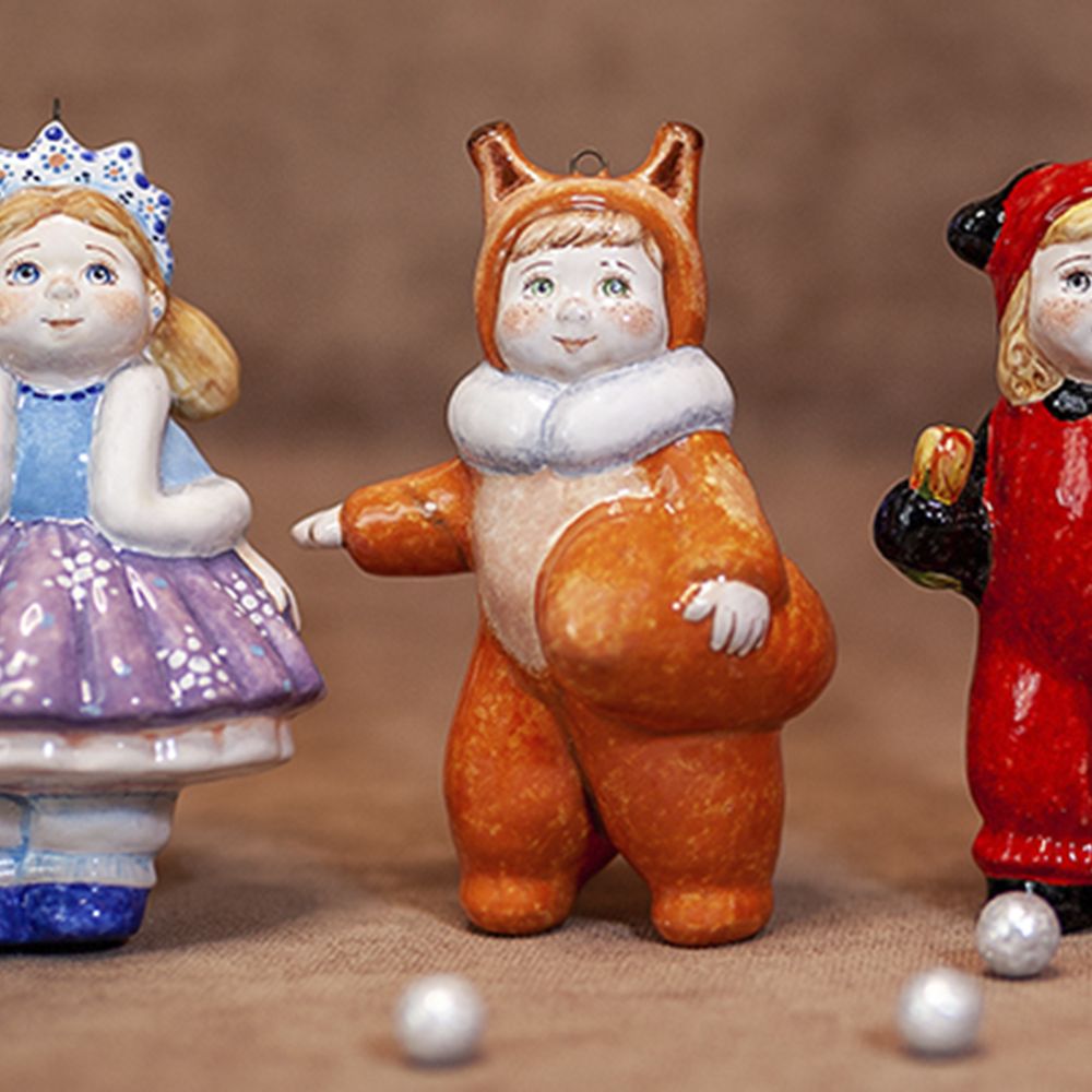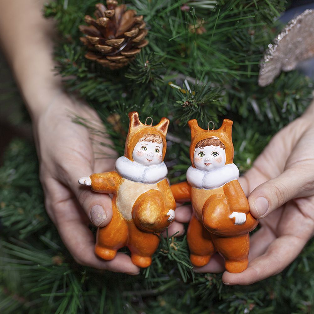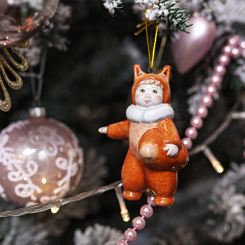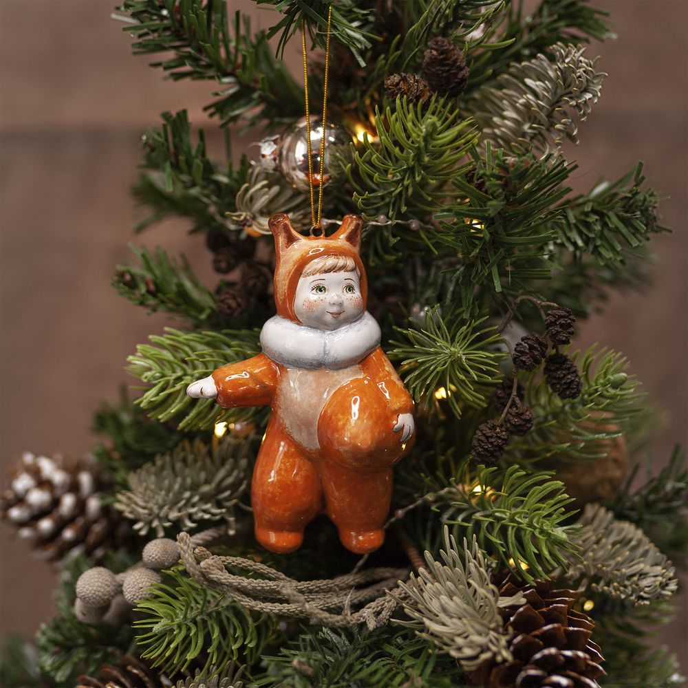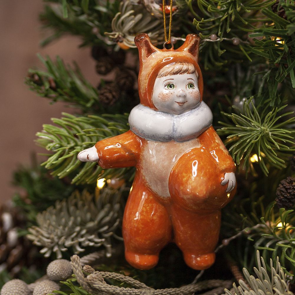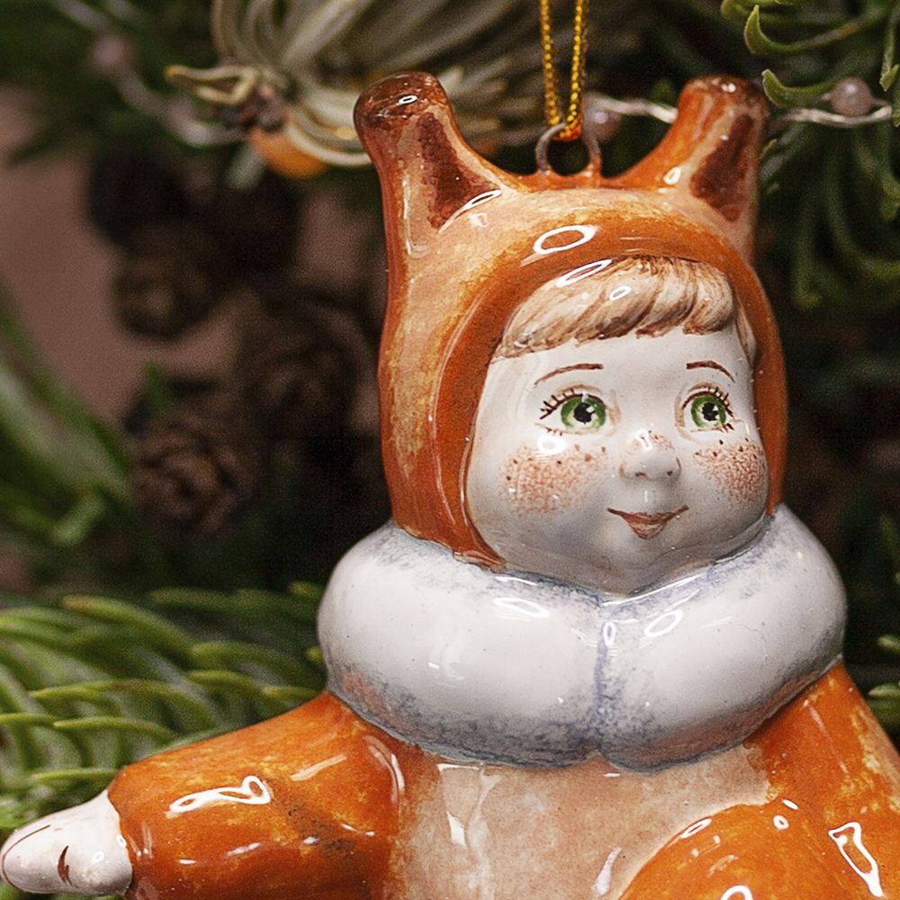 Изделие входит в коллекцию Ёлка и представляет фигурку малыша в костюме белочки. Мы видим активного, энергичного ребенка. Зеленые глаза, веснушки на щеках и носу, яркий рыжий костюмчик с белым пушистым воротничком притягивают взгляд. Это милое изделие будет прекрасным украшением новогодней елочки, идеальным подарком на рождение ребенка, украсит интерьер детской, порадует коллекционеров.