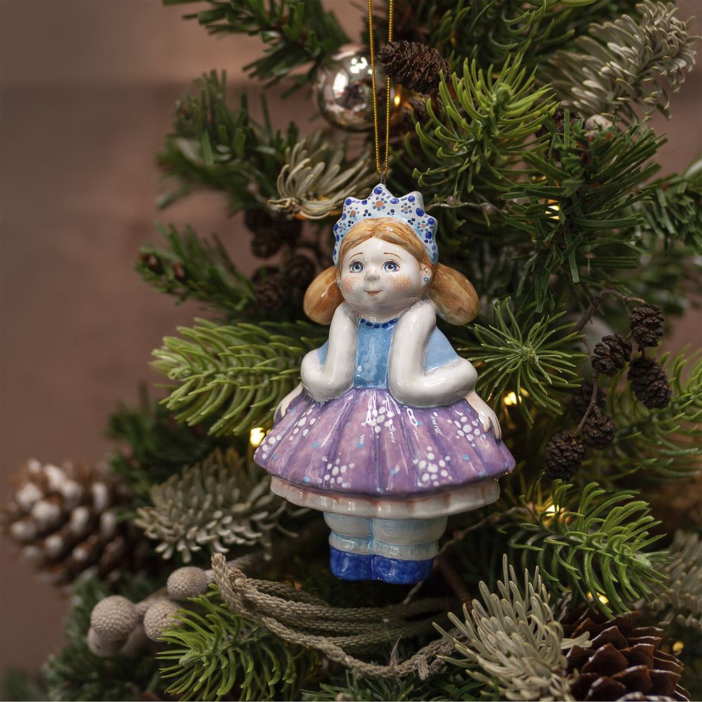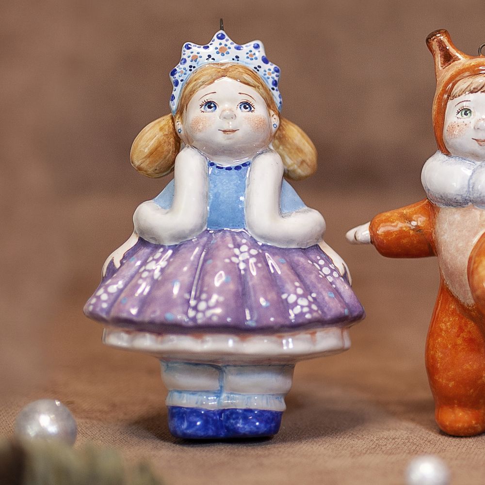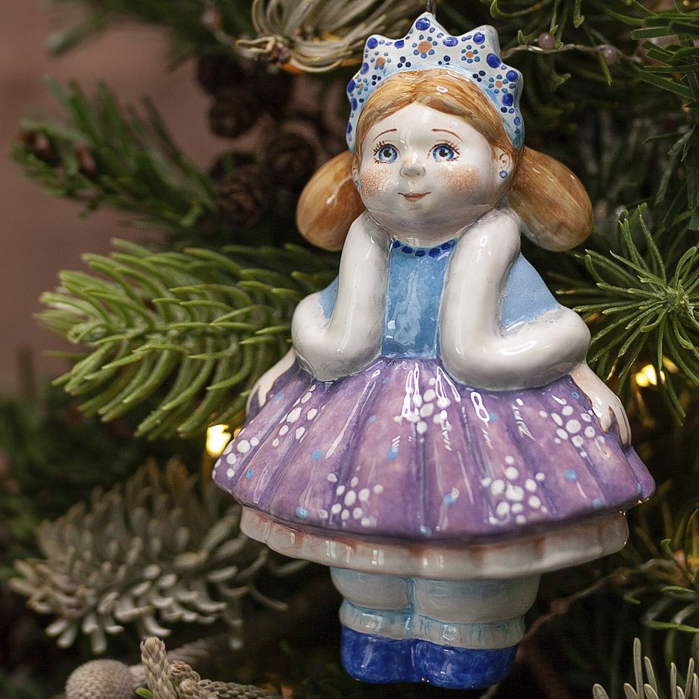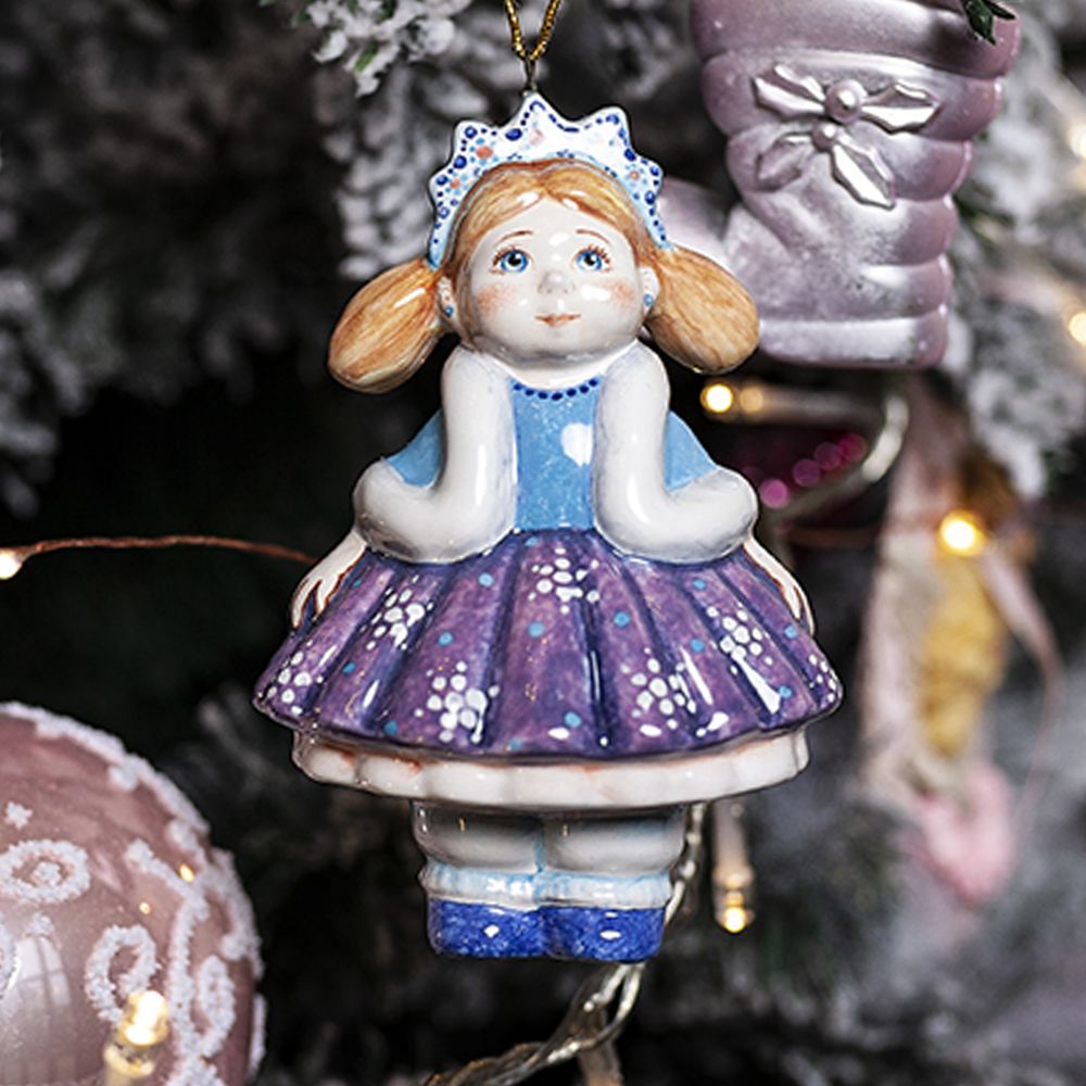 Изделие входит в коллекцию Ёлка и представляет фигурку малышки в стильном костюме снежинки. Безмятежное спокойствие и сдержанная улыбка на лице, торчащие из под ободка хвостики, накидка, отороченная мехом и пышная юбочка делают малышку такой реальной, что не оторвать глаз. Эта Снежинка будет восхитительным украшением новогодней елочки, милым подарком по любому поводу, украсит интерьер детской, порадует коллекционеров.