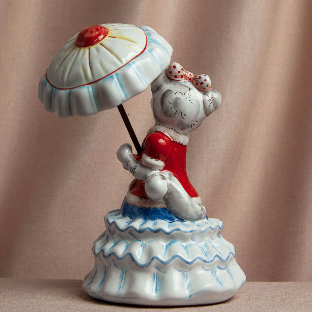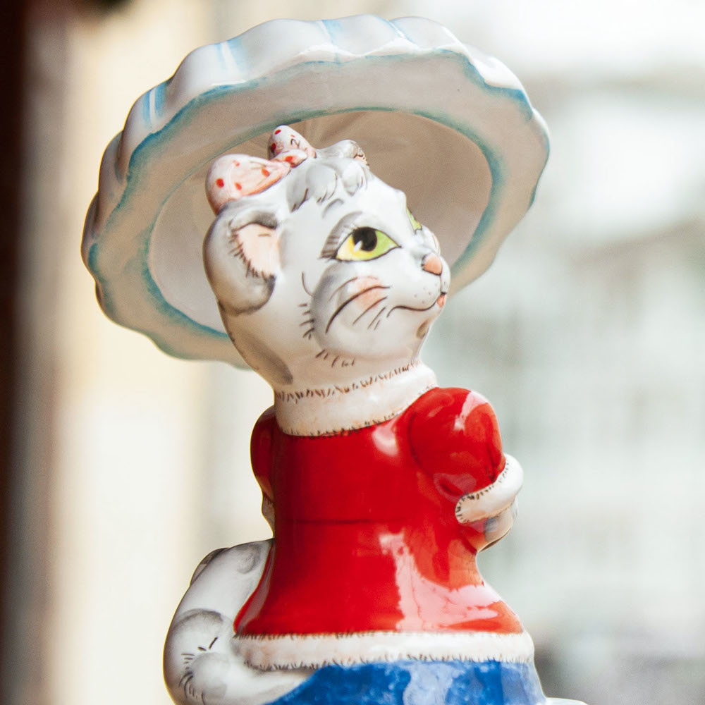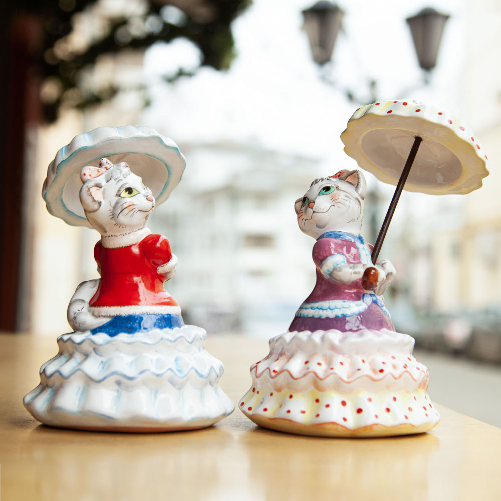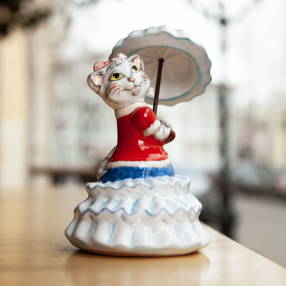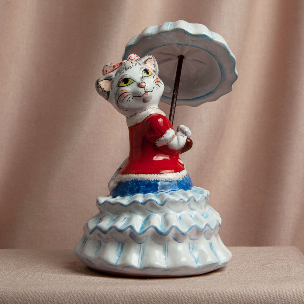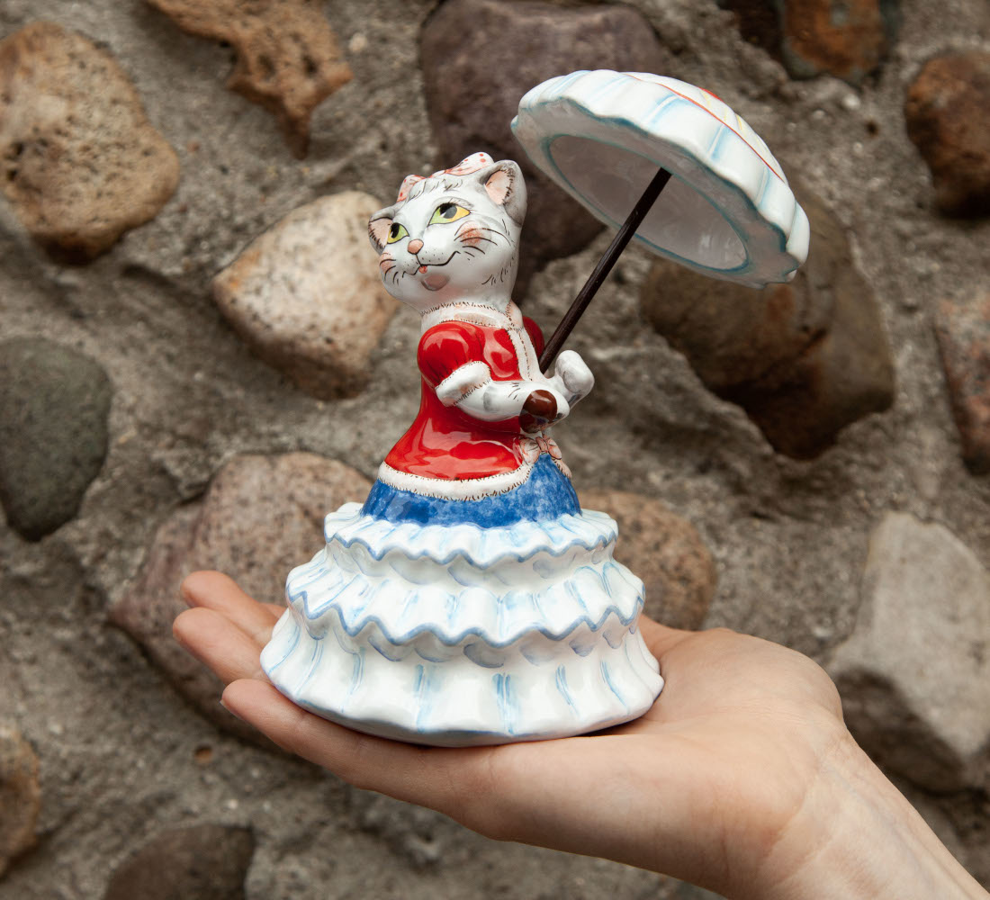 Изделие представляет собой фигурку очаровательной кошки в нарядном платье с эффектным зонтиком в лапках. Мордочка кошечки очень выразительна, осанка благородна. Кому то она напоминает кошечку из детских потешек, кому-то героиню знаменитого Кошкиного дома, кто-то видит в ней просто гламурную киску. Но она никого не оставляет равнодушным. Это изделие прекрасно украсит интерьер детской, гостиной, спальни, порадует любителей кошек, и просто будет стильным подарком на день рожденье или праздник.