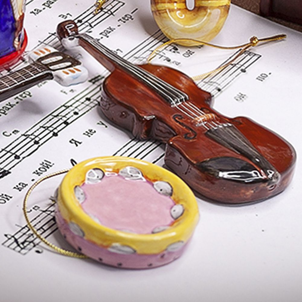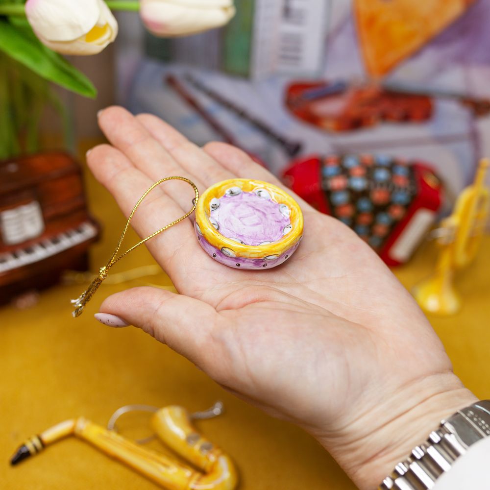 Ёлочная игрушка Бубен ручной работы, входит в коллекцию Музыкальные инструменты. Художник изобразил узнаваемый инструмент нарядным золотистым цветом, с яркой розовой мембраной. Бубен использовали и в народных танцах, и в оркестре. Керамика с помощью мастерства художника оживает, и как будто наполняется задорным перезвоном бубенцов. Бубен станет прекрасным подарком людям, имеющим отношение к музыке, а также тем, кому вы хотите передать положительные эмоции и радость, будет чудесным украшением новогодней елочки, порадует коллекционеров.