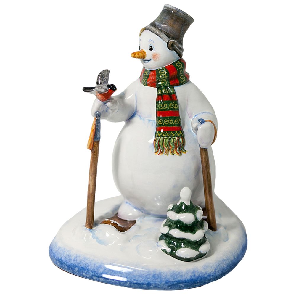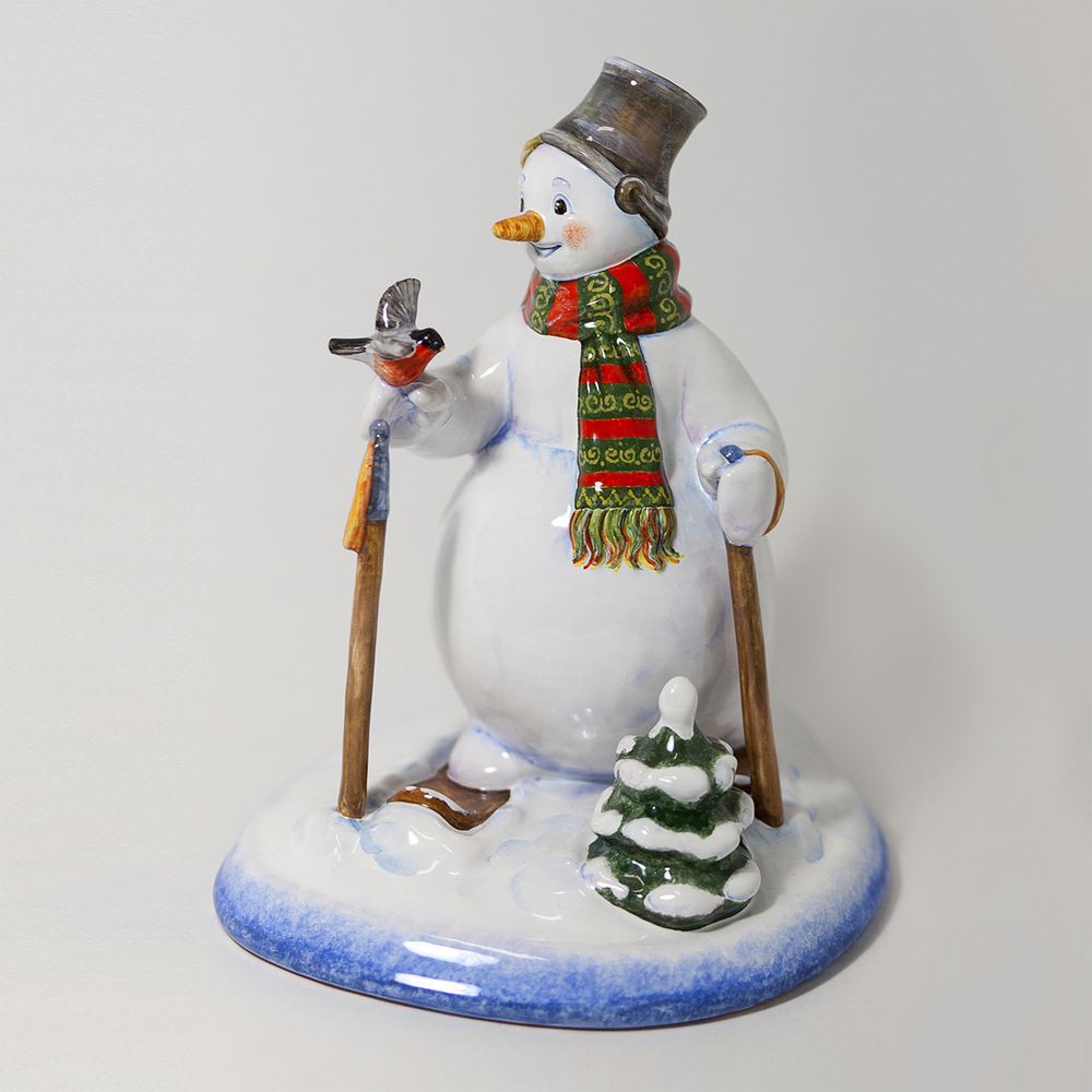 Это изделие ручной работы представляет собой фигурку Снеговика и входит в коллекцию «Новый год». Снеговик – это настоящий дух зимы! Русская зима преображает мир своим морозным дыханием. Все становится похожим на чудесную сказку, вот и наш художник изобразил забавного снежного человечка, передвигающимся на лыжах по белому снегу. Красногрудый снегирь сопровождает веселого Снеговика. Эта композиция обладает притягательностью, от неё так и веет добротой, она принесет вам радость и обещание зимней сказки, будет украшением вашего дома, замечательным подарком вашим друзьям и близким, который сохранит дивные мгновения зимнего торжества на долгие годы.