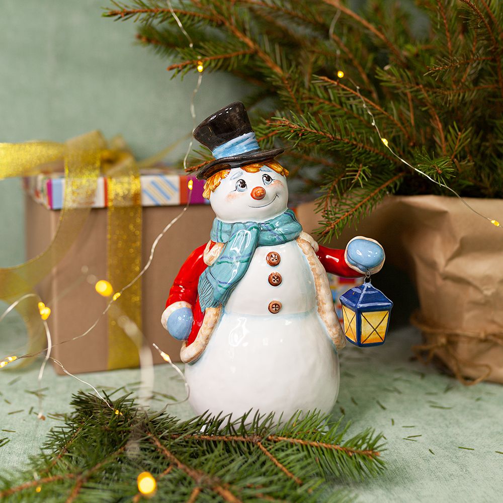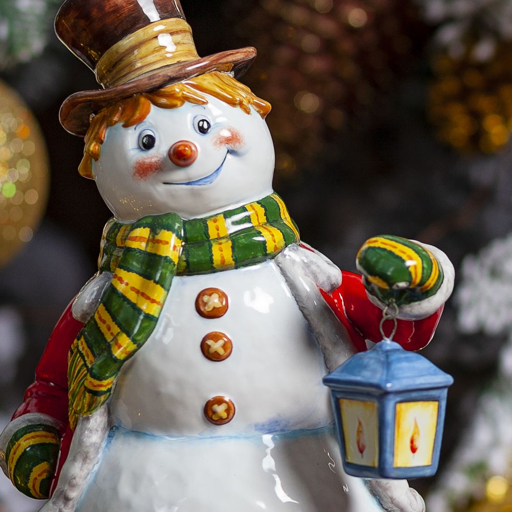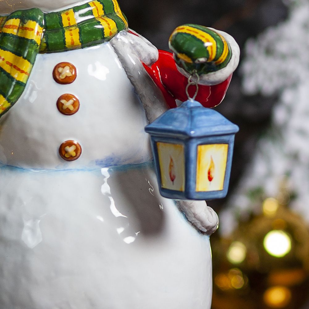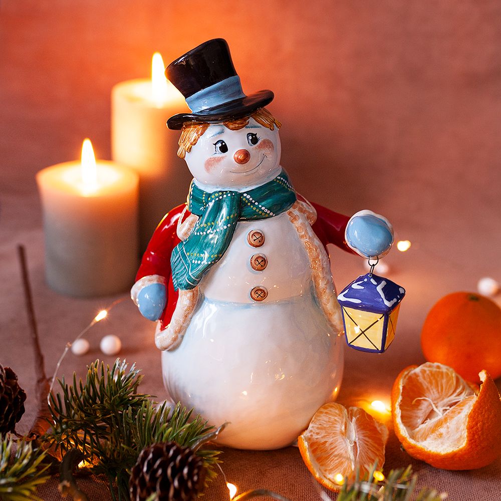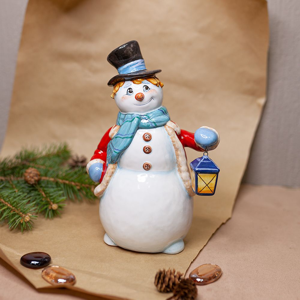 Это изделие ручной работы входит в коллекцию «Новый год» и представляет собой фигурку доброго улыбчивого Снеговика в ярко красном полушубке с заплаткой, шляпе – цилиндре, полосатом шарфе и с зажженным фонарем в руке. Композиция смотрится ярко и эффектно, она принесет вам радость и обещание зимней сказки, будет украшением вашего дома, замечательным подарком вашим друзьям и близким, который сохранит дивные мгновения зимнего торжества на долгие годы.