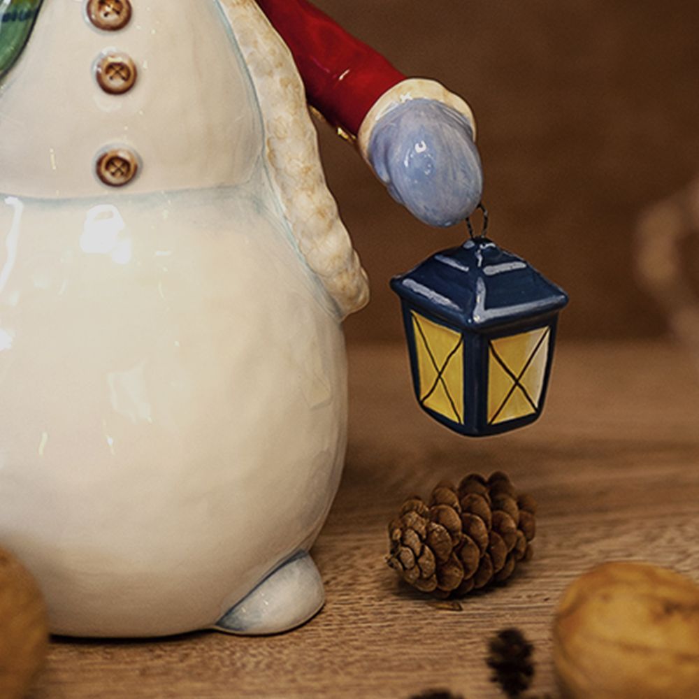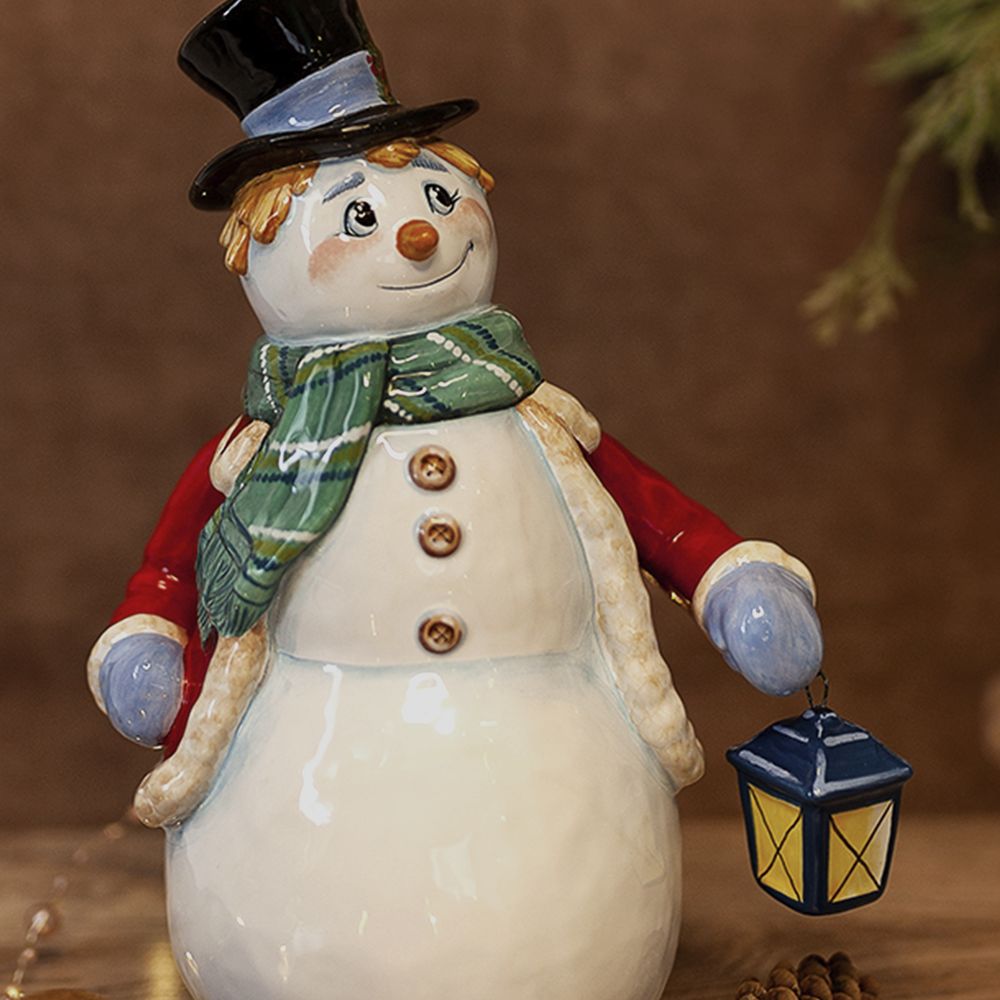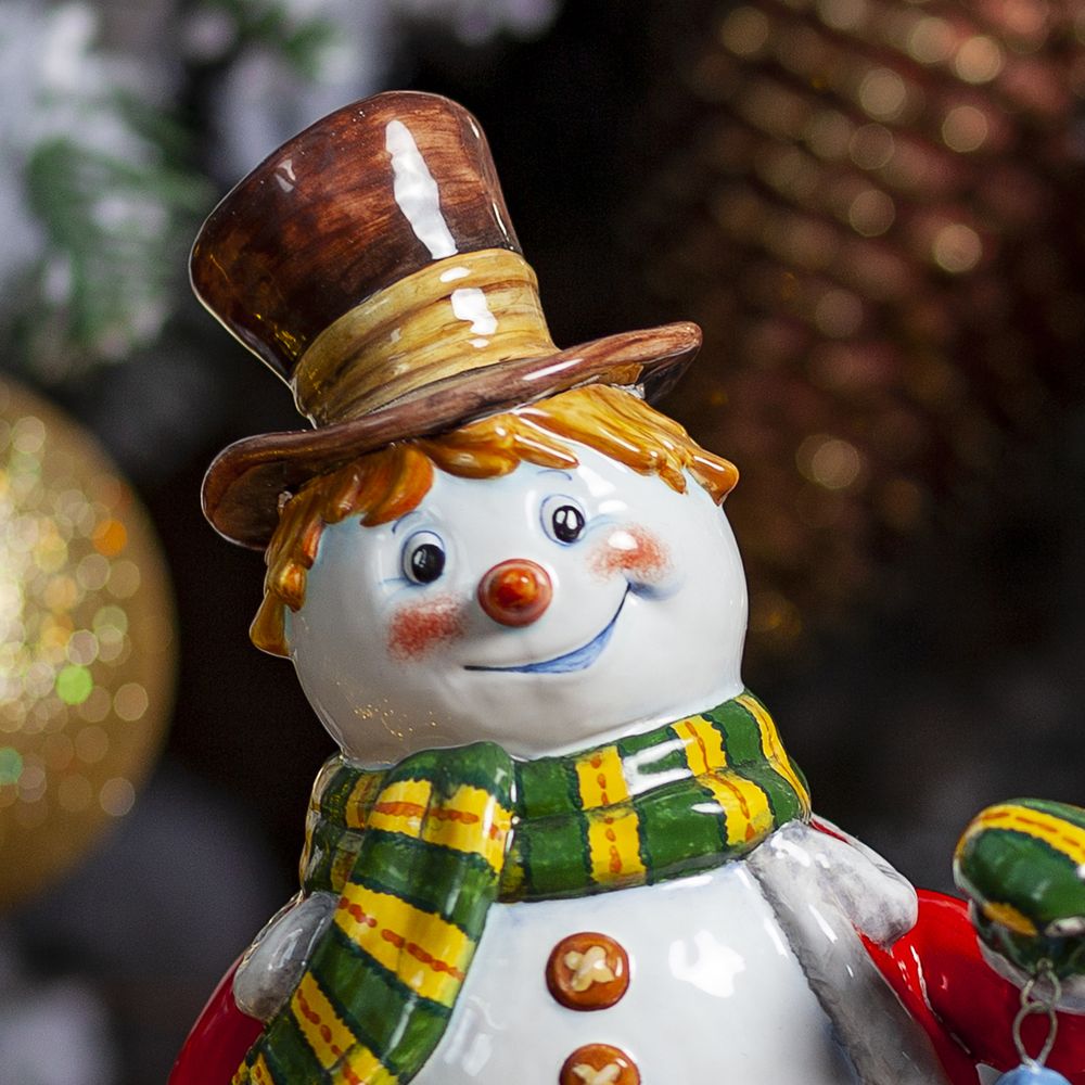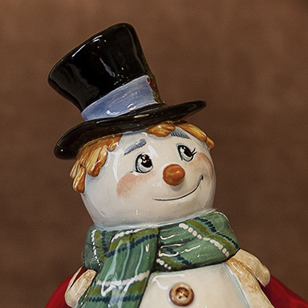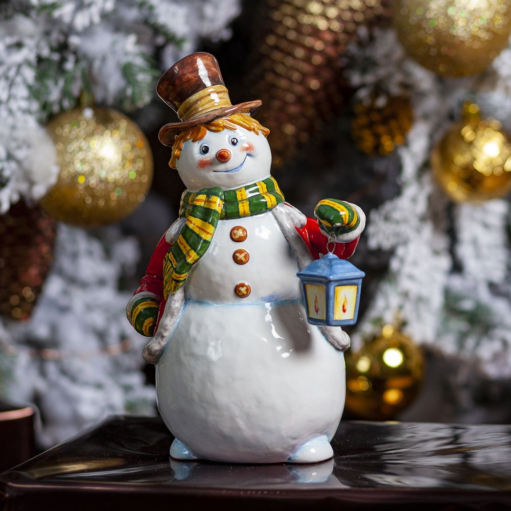 Это изделие ручной работы входит в коллекцию «Новый год» и представляет собой фигурку доброго улыбчивого Снеговика в ярко красном полушубке с заплаткой, шляпе – цилиндре, полосатом шарфе и с зажженным фонарем в руке. Композиция смотрится ярко и эффектно, она принесет вам радость и обещание зимней сказки, будет украшением вашего дома, замечательным подарком вашим друзьям и близким, который сохранит дивные мгновения зимнего торжества на долгие годы.
