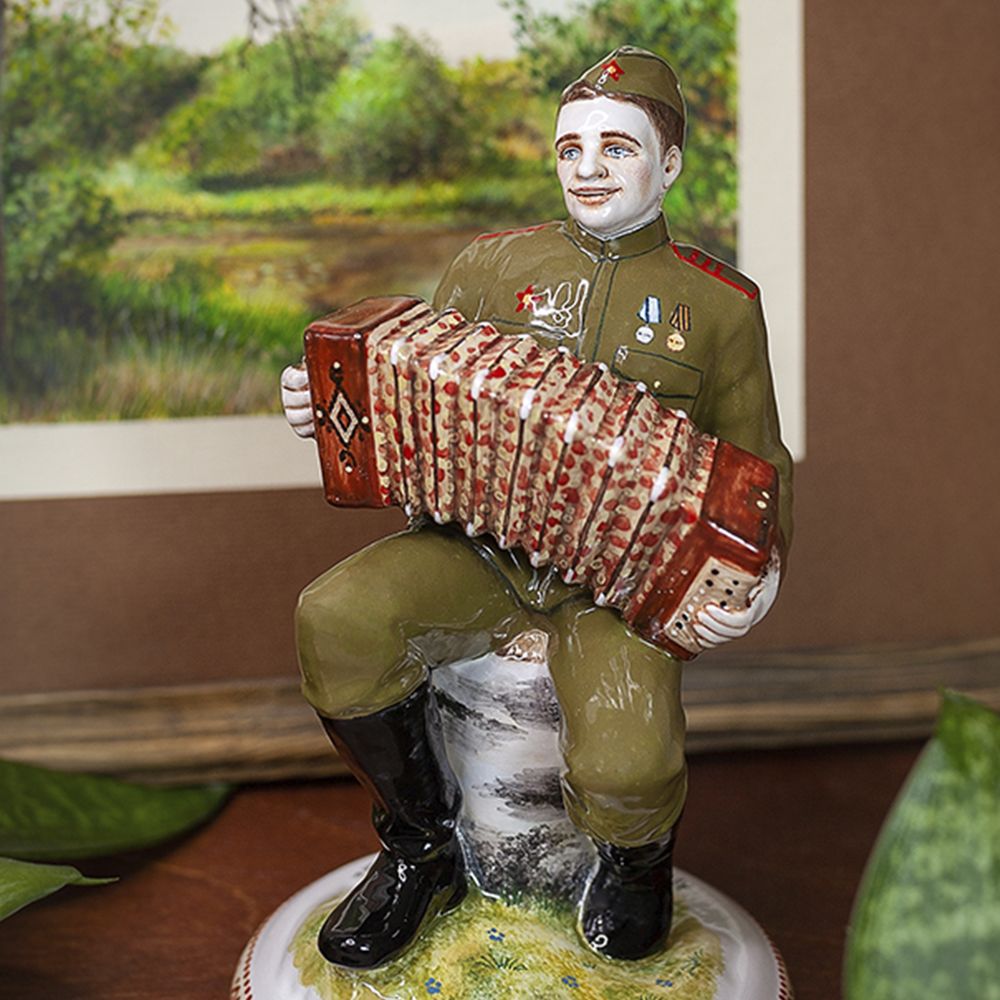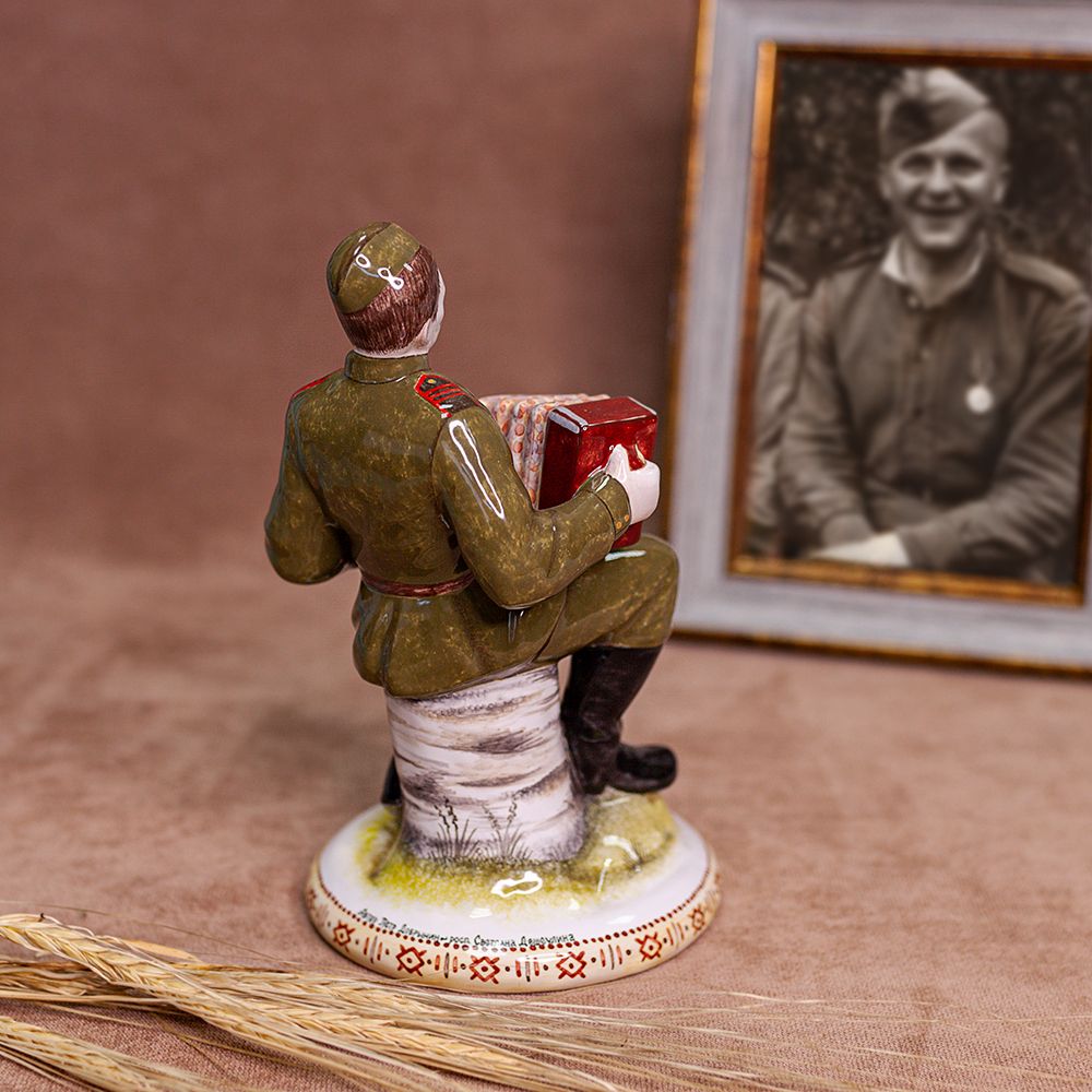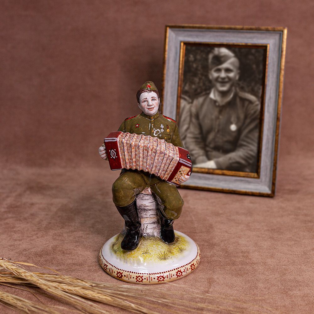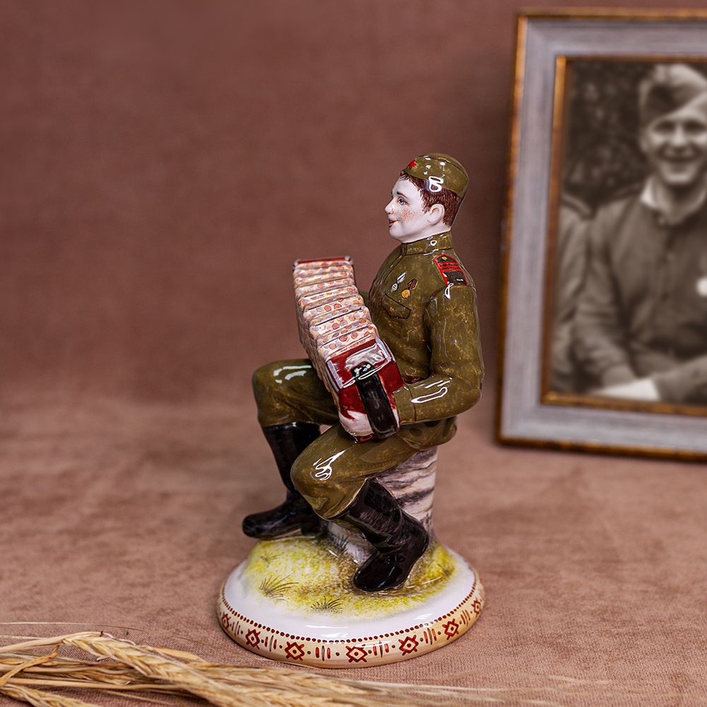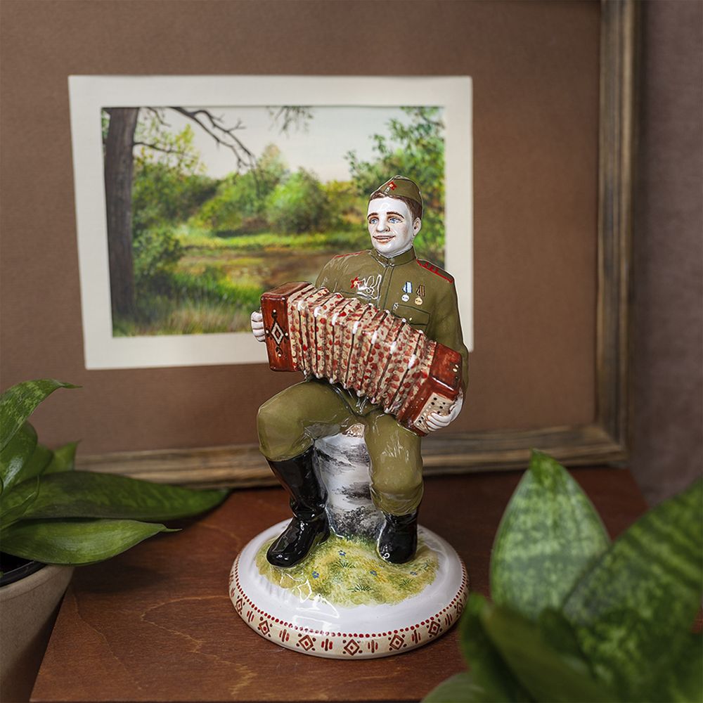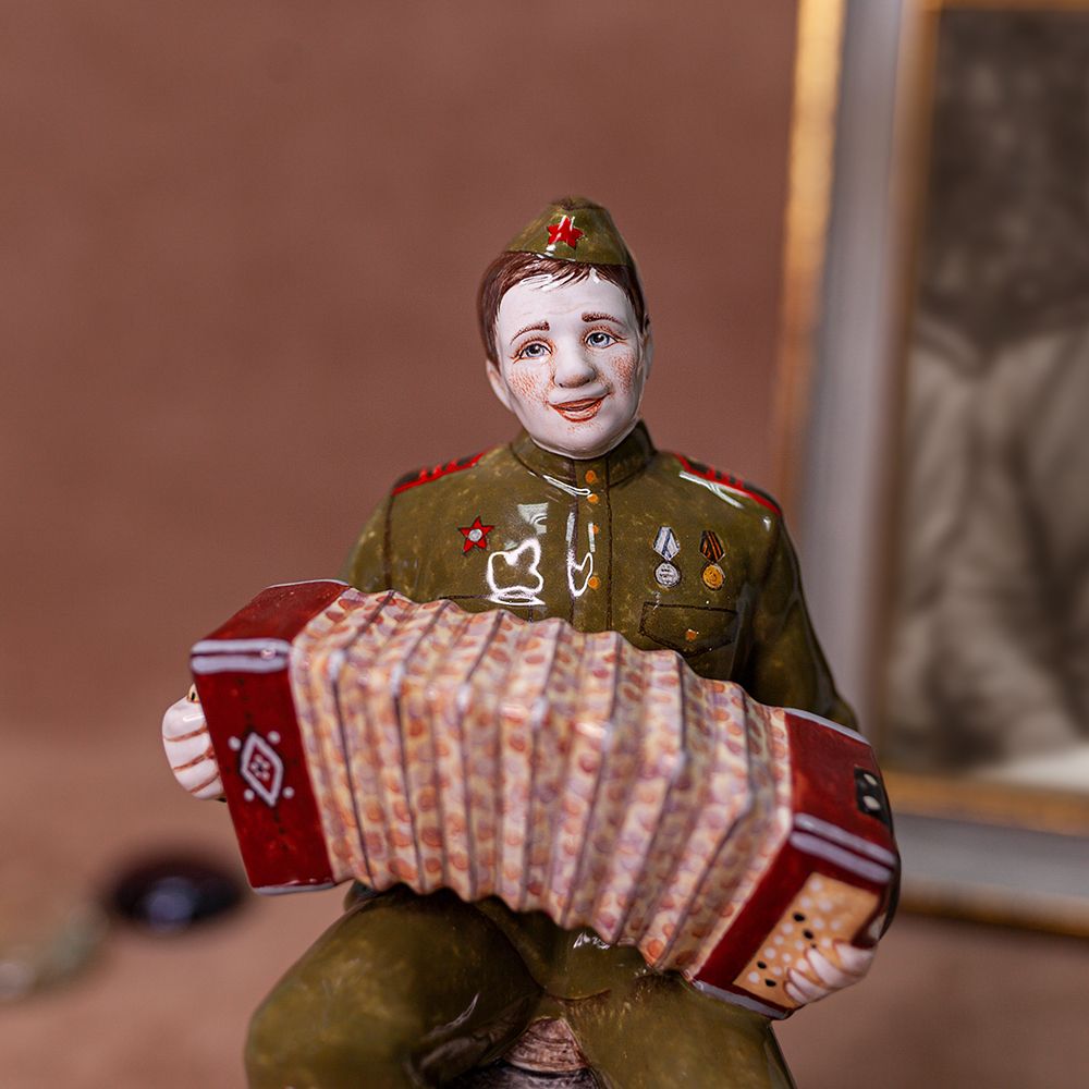Это изделие ручной работы представляет фигуру солдата в гимнастерке, играющего в минуту отдыха на гармони. На войне от музыки гармони становилось теплее солдатам на душе. Гармонь согревала сердца, горестно скорбела, сопереживала, поддерживала людей, потерявших в бою товарищей. Композиция будет выразительным акцентом в интерьере, станет эксклюзивным подарком к Дню Победы и к Дню Защитника Отечества, к дням рождения Ветеранам войны.