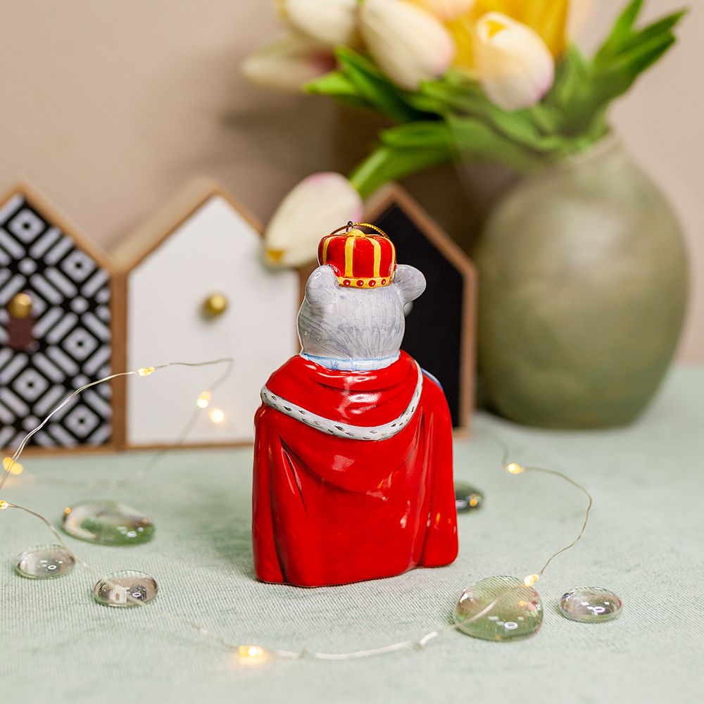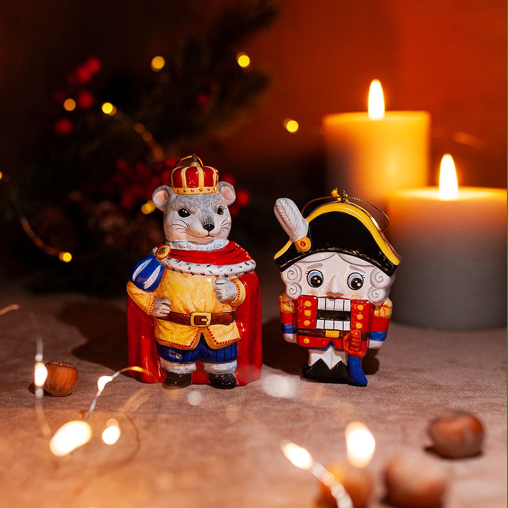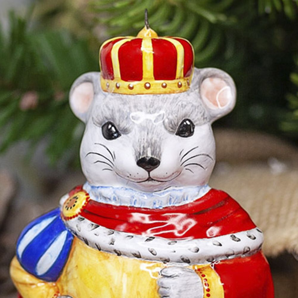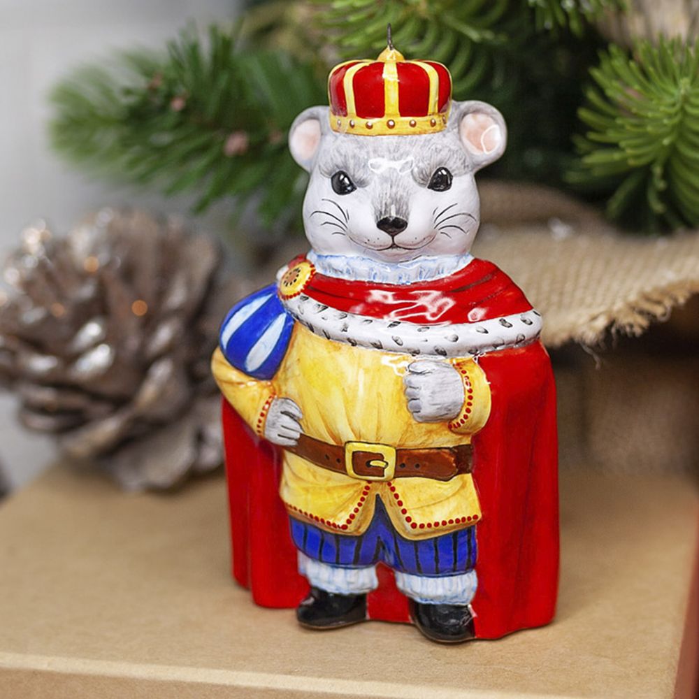 Эффектное изделие ручной работы представляет собой фигуру Мышиного короля в пурпурной мантии, отделанной горностаем, с короной на голове. Этот жестокий и коварный повелитель мышиного королевства, герой рождественской сказки про Щелкунчика знаком нам с детства. Яркая керамическая игрушка будет чудесным украшением новогодней елочки, праздничной композиции, гирлянды для украшения лестницы и дверей, станет запоминающимся подарком.