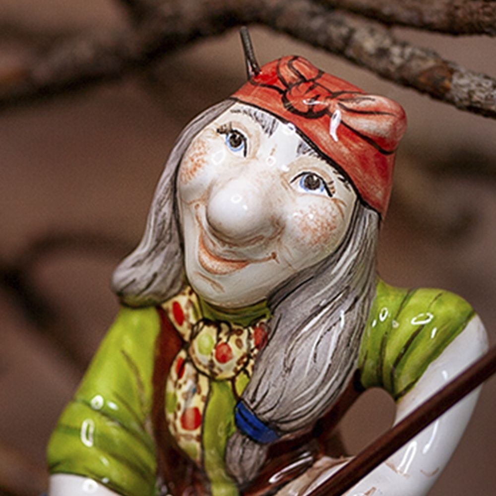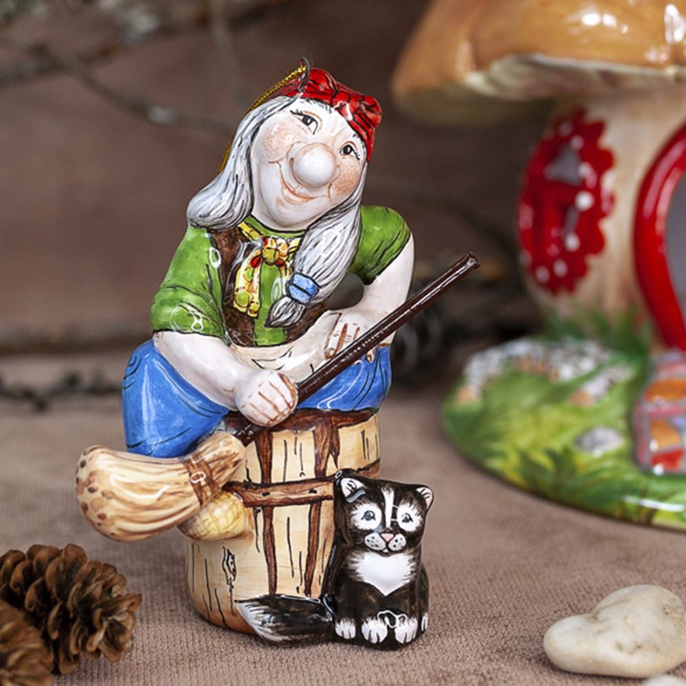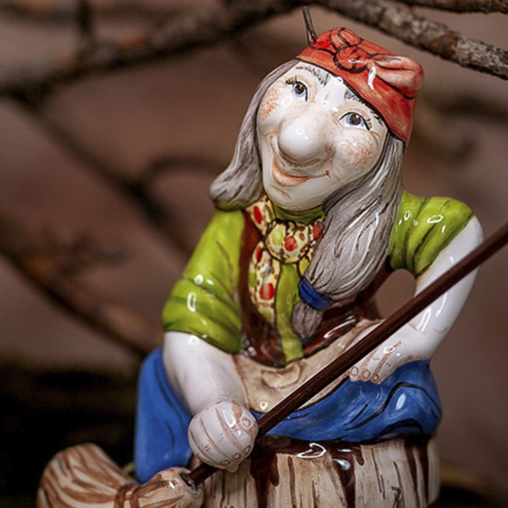 Фигурка “Баба Яга” изготовлена в технике майолика, украшена ручной художественной росписью и входит в эксклюзивную коллекцию “Сказки”. Экстравагантная лесная старушка с загадочной улыбкой на лице приглашает вас в мир сказок и приключений. Компанию ей составляет черный кот, а ступа и метла являются неотъемлемыми атрибутами ее образа, сопровождая ее в далеких путешествиях по загадочным местам. Эта фигурка “Баба Яга” станет оригинальным украшением интерьера, принося атмосферу волшебства и таинственности в ваш дом. Она также может стать уникальным подарком для любителей сказок и коллекционеров керамических изделий ручной работы, погружая их в удивительный мир фольклора и магии.