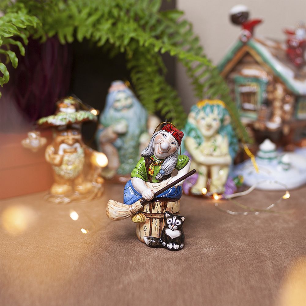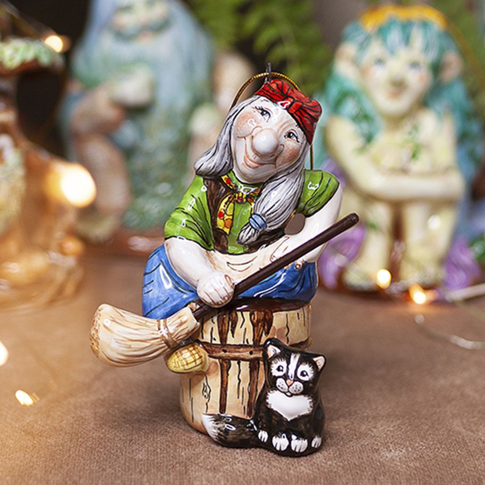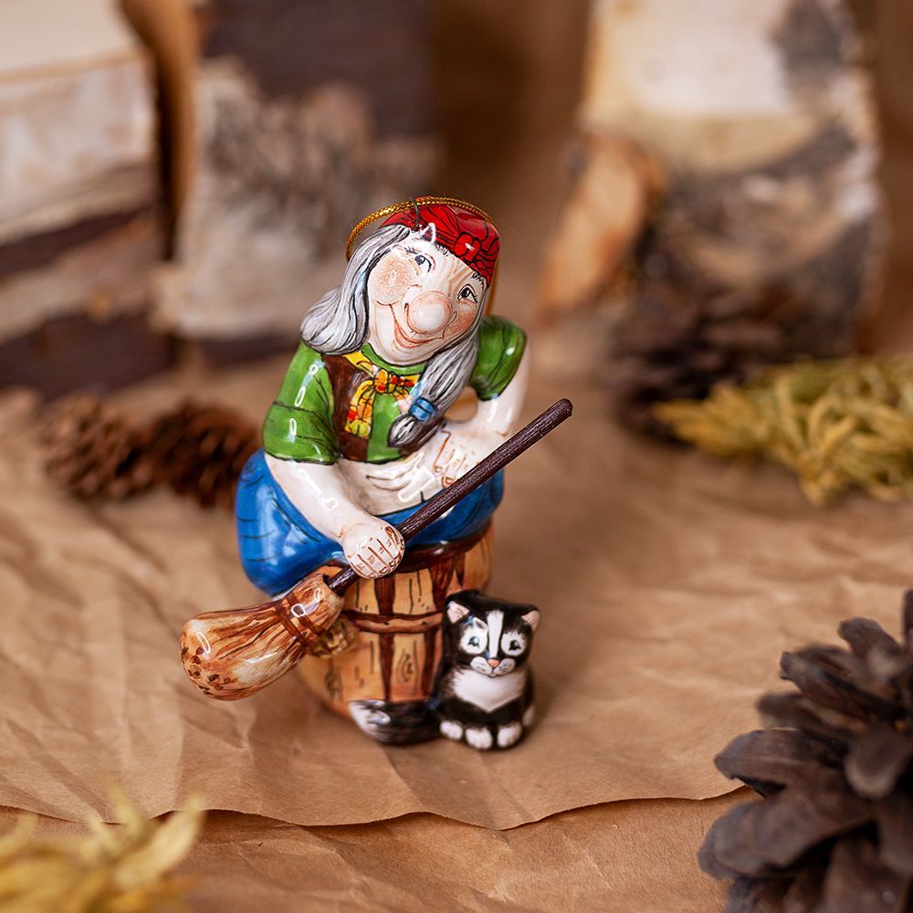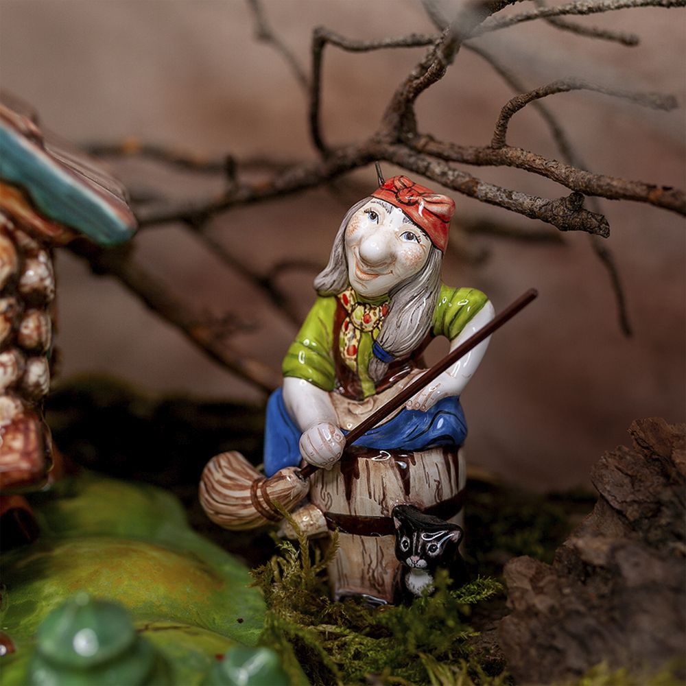 Фигурка “Баба Яга” изготовлена в технике майолика, украшена ручной художественной росписью и входит в эксклюзивную коллекцию “Сказки”. Экстравагантная лесная старушка с загадочной улыбкой на лице приглашает вас в мир сказок и приключений. Компанию ей составляет черный кот, а ступа и метла являются неотъемлемыми атрибутами ее образа, сопровождая ее в далеких путешествиях по загадочным местам. Эта фигурка “Баба Яга” станет оригинальным украшением интерьера, принося атмосферу волшебства и таинственности в ваш дом. Она также может стать уникальным подарком для любителей сказок и коллекционеров керамических изделий ручной работы, погружая их в удивительный мир фольклора и магии.