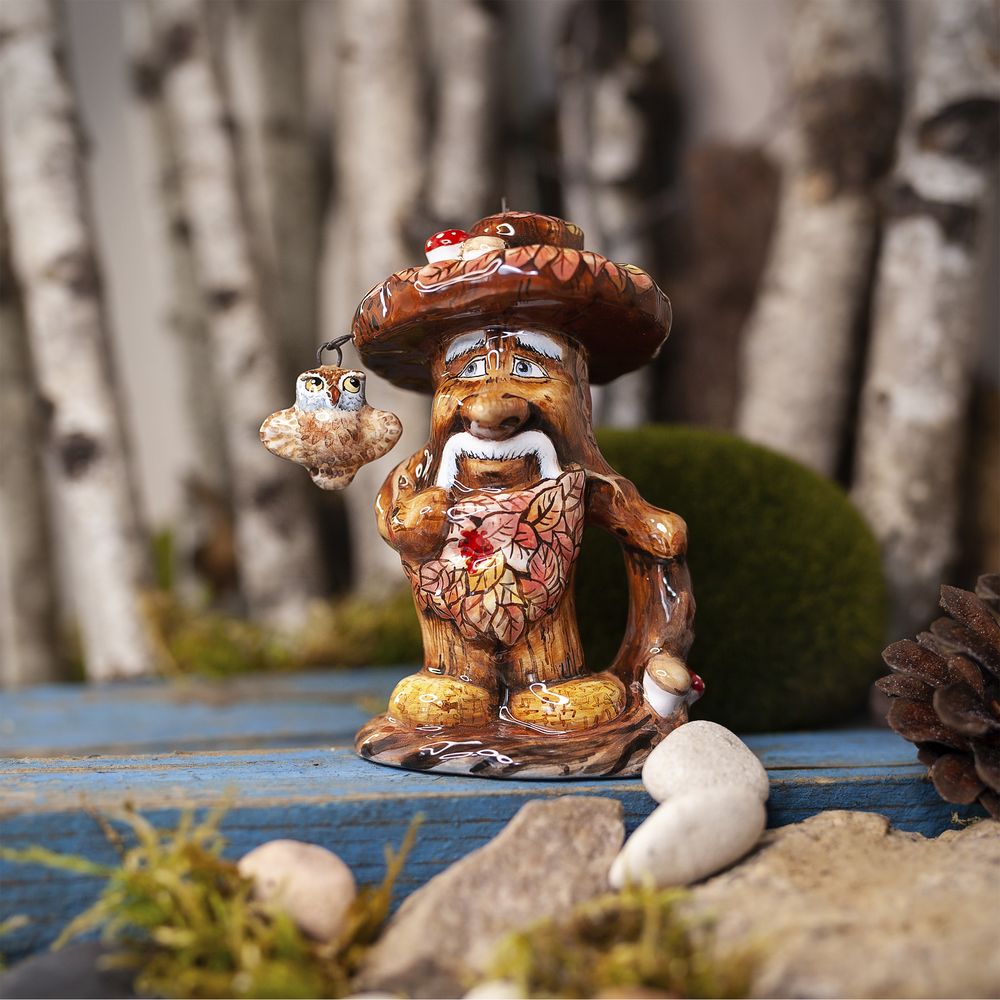 Изделие входит в коллекцию Сказки и представляет фигурку большого лесного затейника Лешего, который ради шутки может обернуться в сосну, пень, кочку, грибок и распластаться мхом белым, стать и птицей и зверем. Дух и Хозяин леса, воплощенный в керамике никого не оставит равнодушным. Чудесное изделие для оформления интерьеров, милый подарок, порадует оно любителей сказок и коллекционеров.