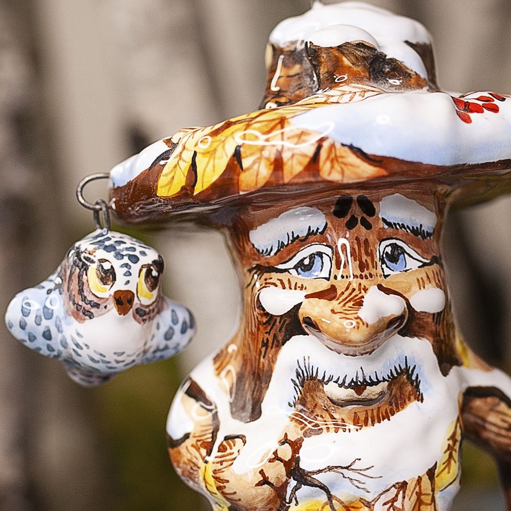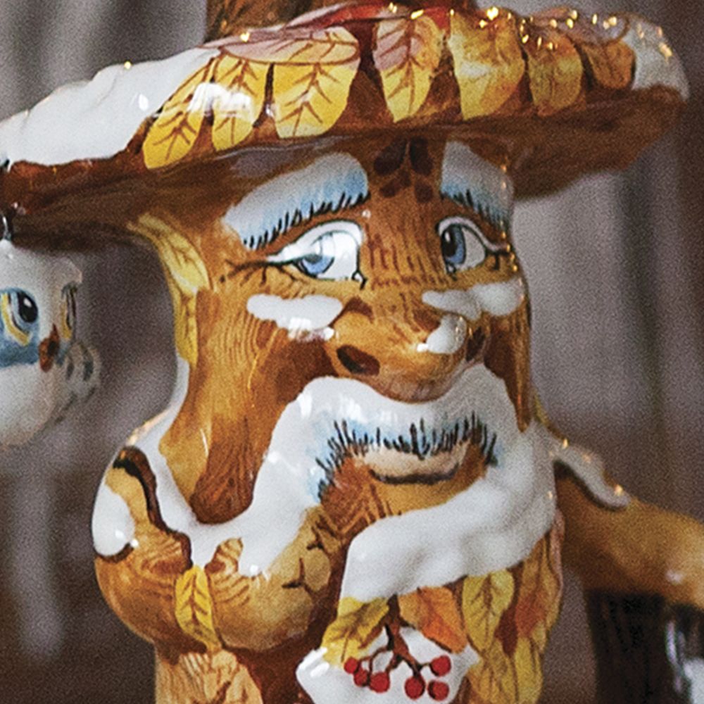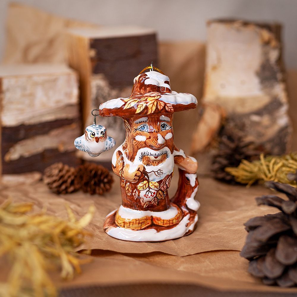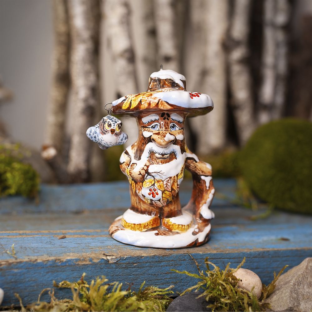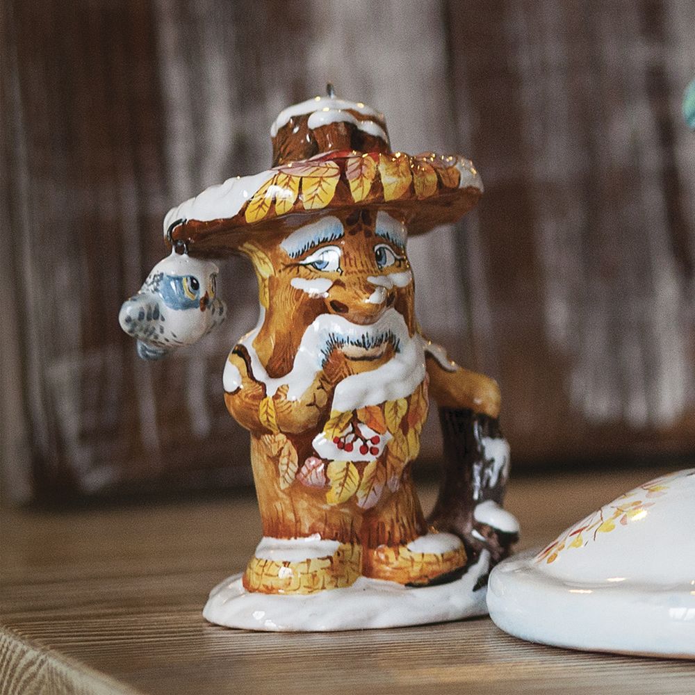 Изделие входит в коллекцию Сказки и представляет фигурку большого лесного затейника Лешего, который ради шутки может обернуться в сосну, пень, кочку, грибок и распластаться мхом белым, стать и птицей и зверем. Дух и Хозяин леса, воплощенный в керамике никого не оставит равнодушным. Чудесное изделие для оформления интерьеров, милый подарок, порадует оно любителей сказок и коллекционеров.
