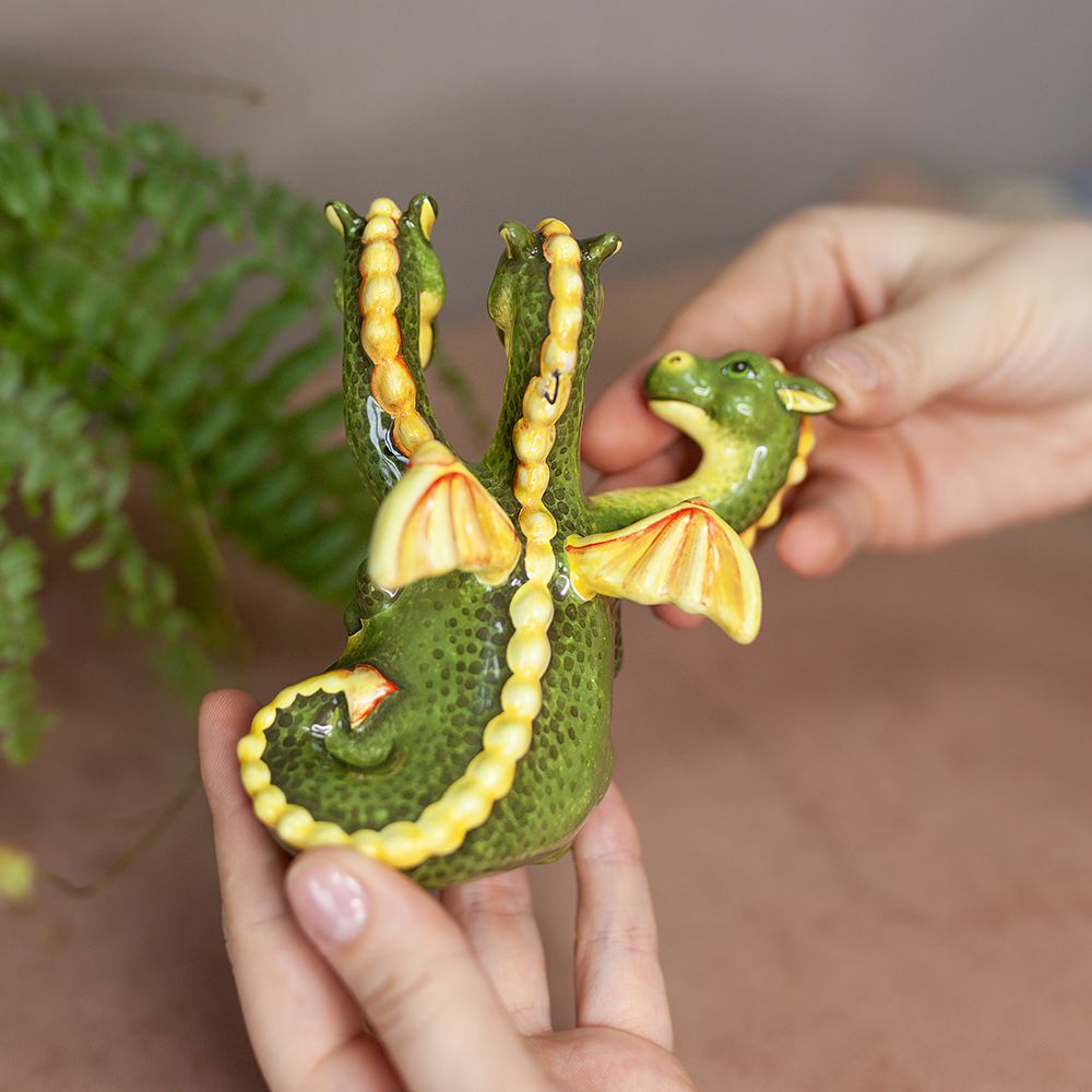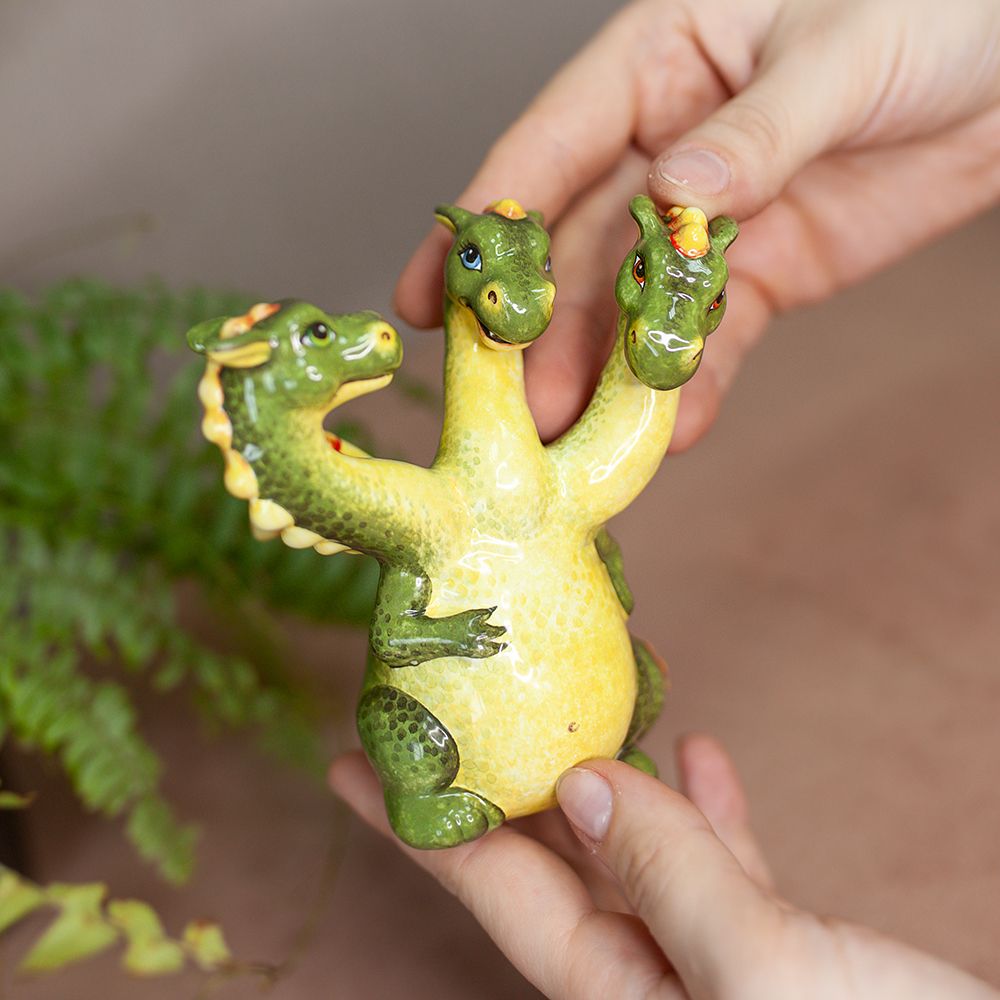 Подвес входит в коллекцию Сказки и представляет фигуру обаятельного Змея Горыныча – яркого персонажа славянского фольклора. Добродушный обжора переносит нас в мир сказок и волшебства, а переданные в керамике характер и эмоции никого не оставят равнодушными. Изумительное изделие для новогодней елки, эксклюзивный подарок, также порадует оно любителей сказок и коллекционеров.