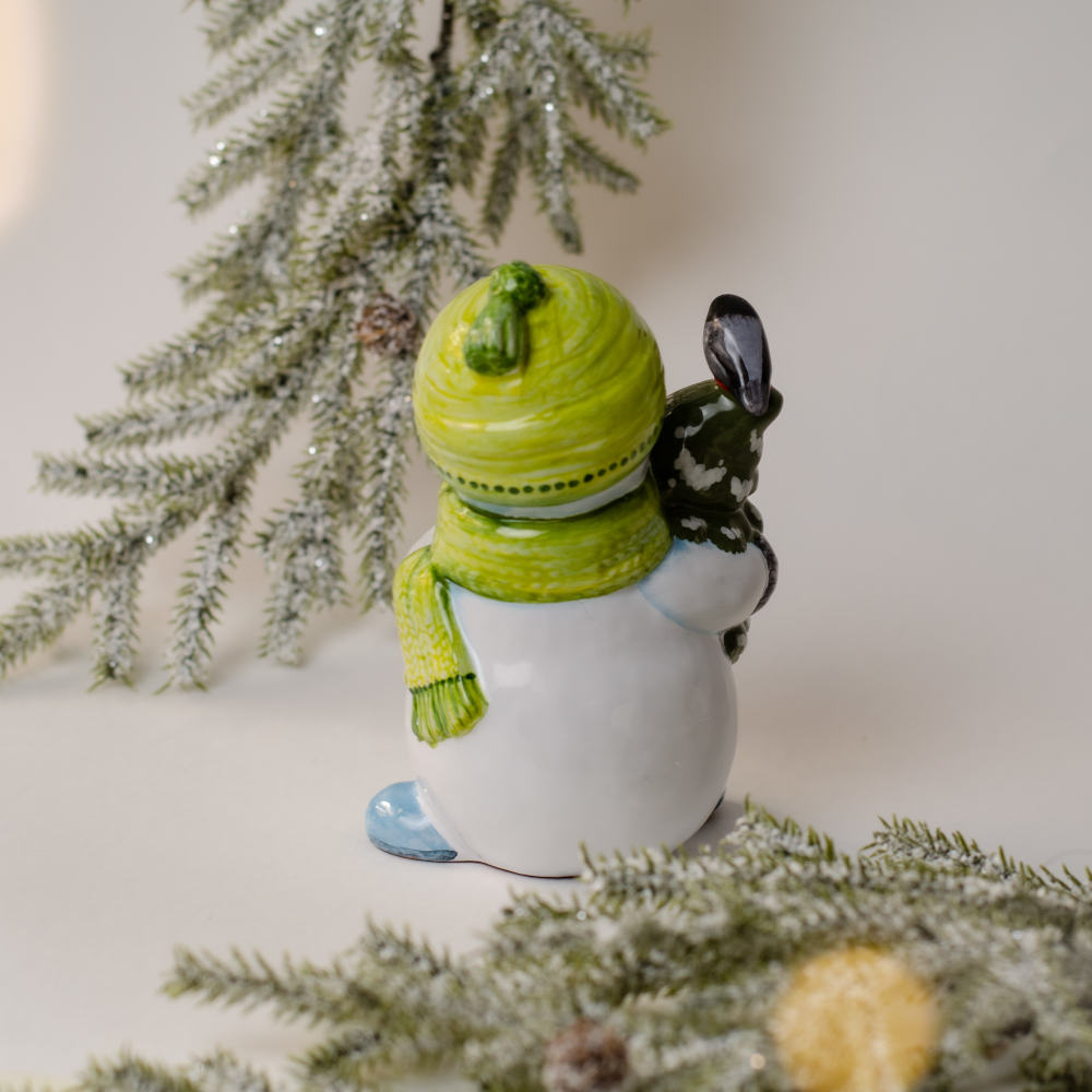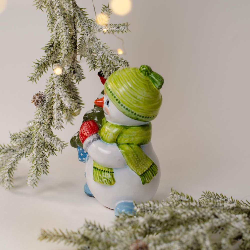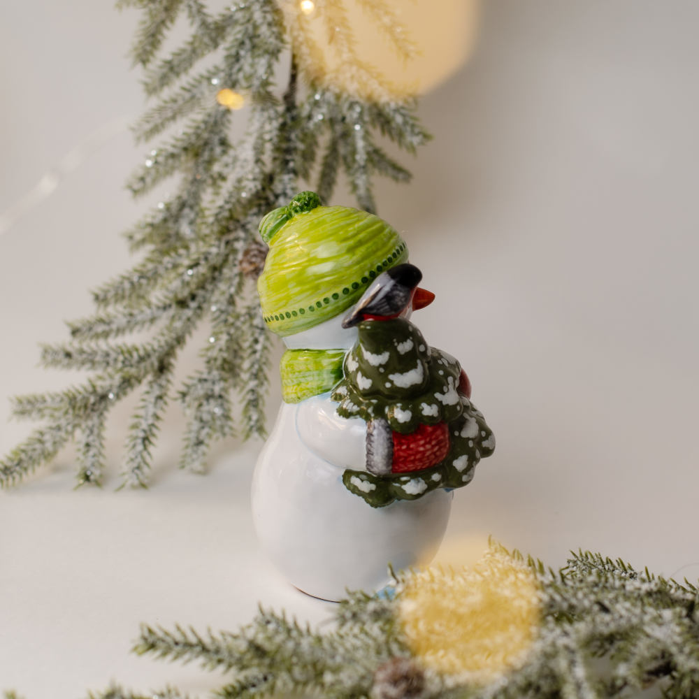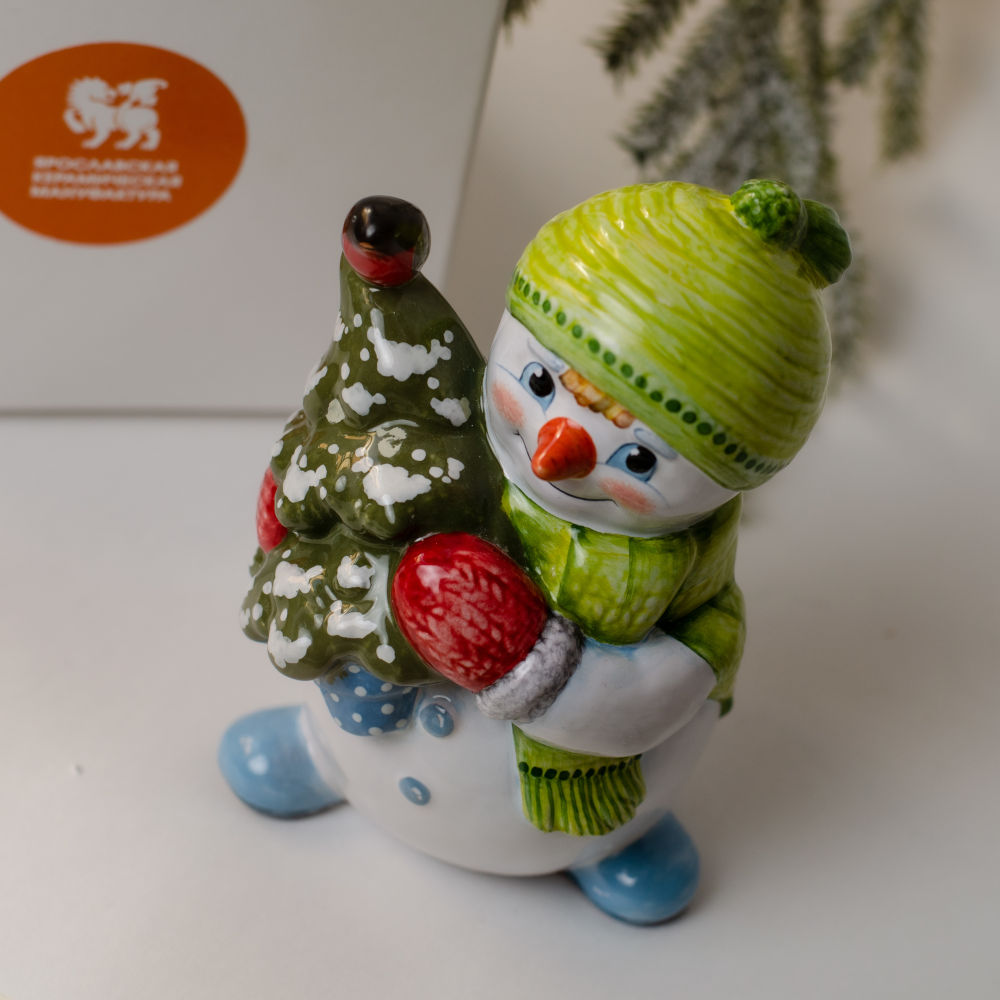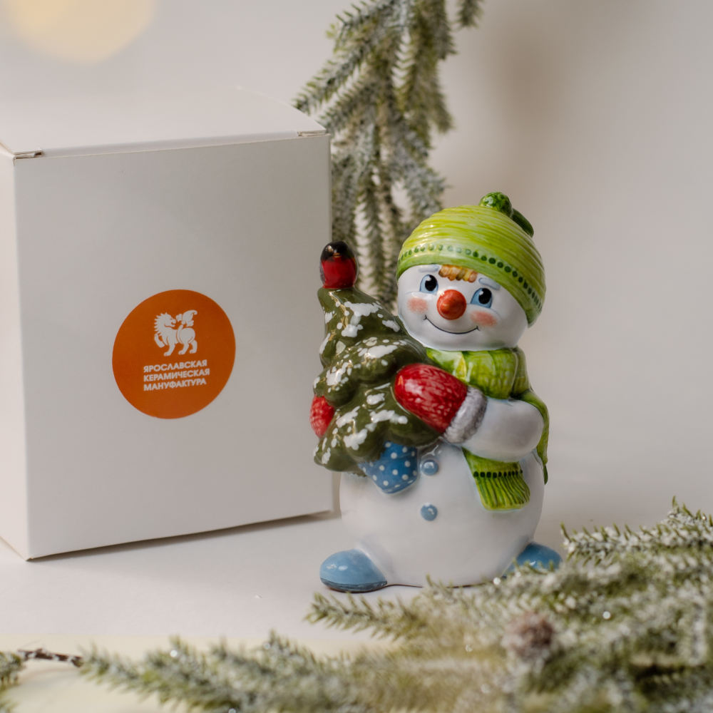 Фигурка “Снеговик с елкой” выполнена в технике майолика и украшена ручной художественной росписью.