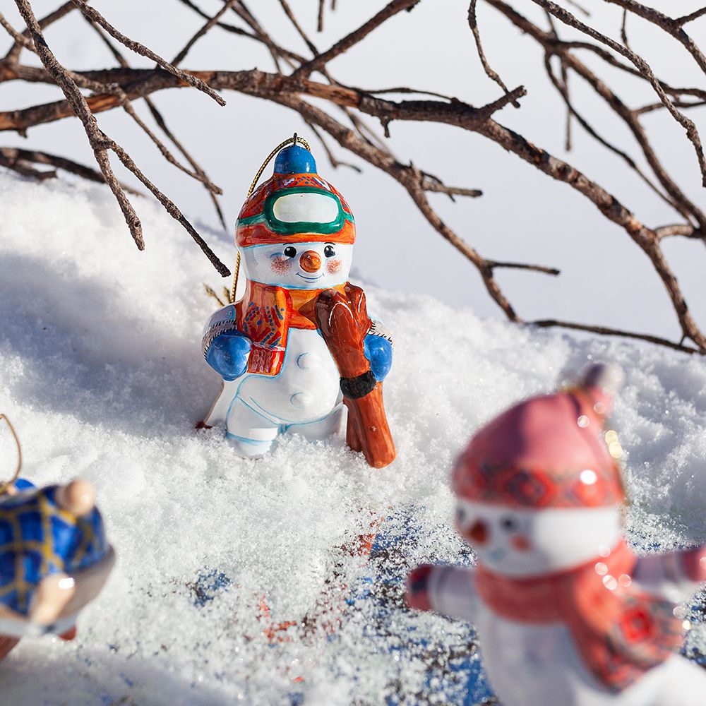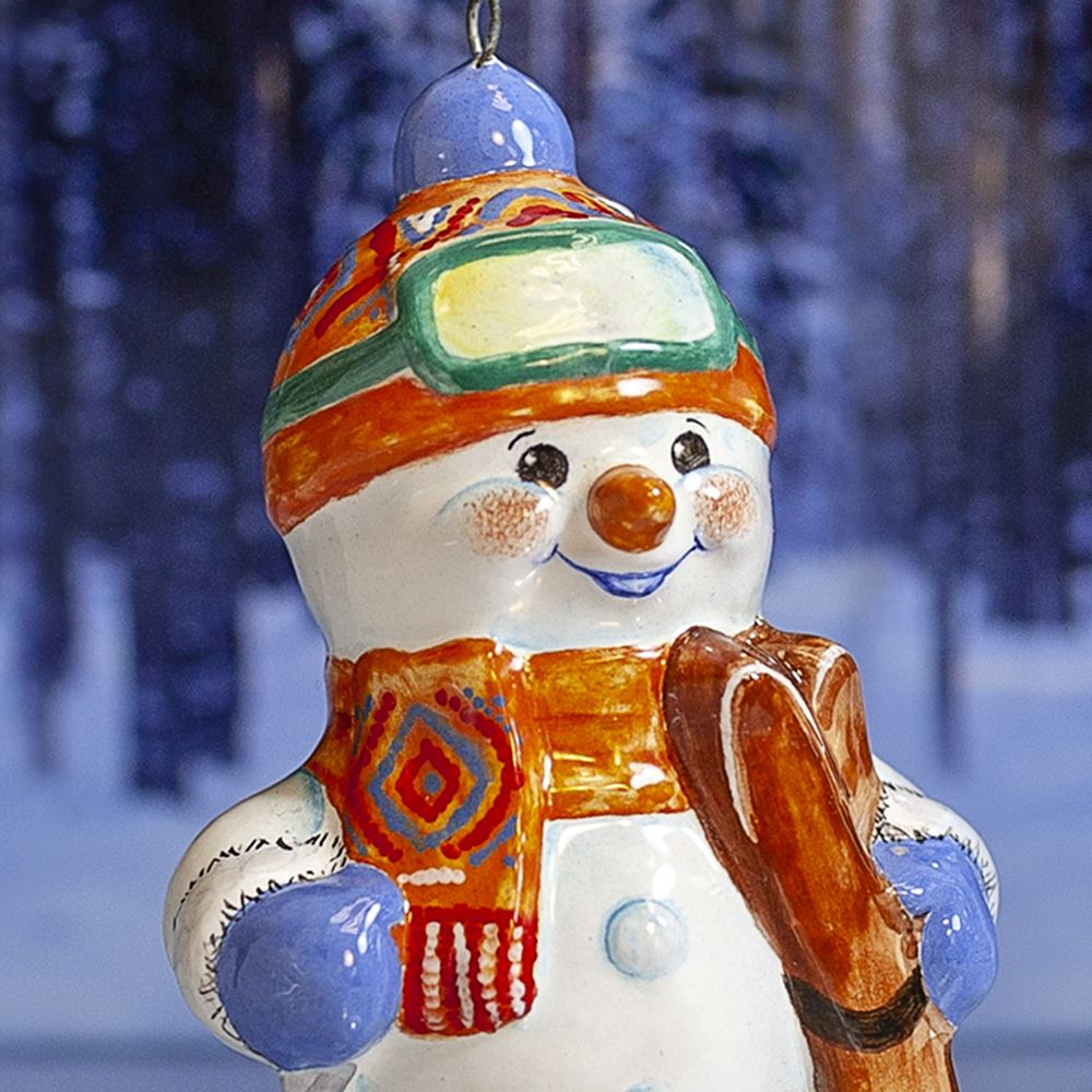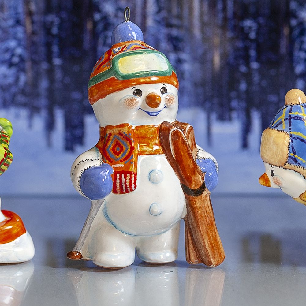 Фигурка “”””Снеговик-лыжник”” изготовлена в технике майолика и украшена ручной росписью. Художником искусно переданы эмоции маленького спортсмена – он чемпион. Яркая шапочка снеговика украшена цветным узором и помпоном, защитная маска, теплый узорчатый шарф и варежки – снеговик готов к спортивным рекордам. Такая фигурка станет чудесным украшением для новогодней елки, милым подарком для всех любителей ручной работы и оригинальных новогодних украшений.”””