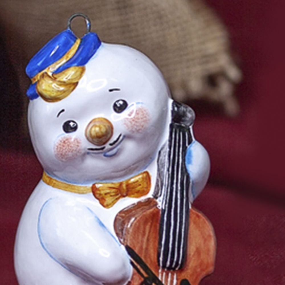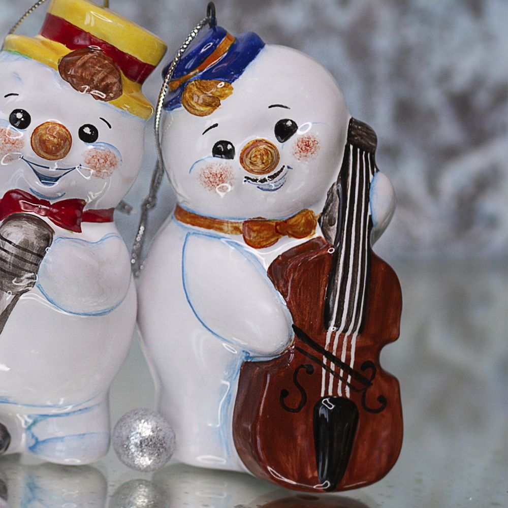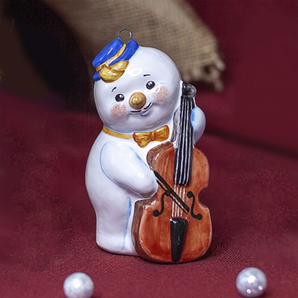 Фигурка “”Снеговик-музыкант с контрабасом”” изготовлена в технике майолика, украшенная ручной художественной росписью и входит в коллекцию “”Снеговички – музыканты””. Яркая экстравагантная шляпа, красный галстук-бабочка и микрофон в руке придают изделию выразительный вид. Такой снеговичок будет оригинально смотреться на новогодней ёлочке или в рождественской интерьерной композиции и станет отличным подарком для близких и любителей музыки.”