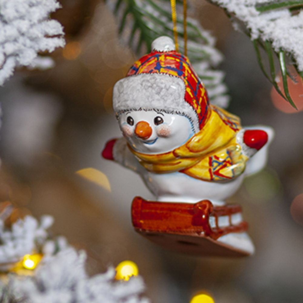 Ёлочная игрушка Снеговик на санках (Коллекция «Снеговики-спортсмены»)