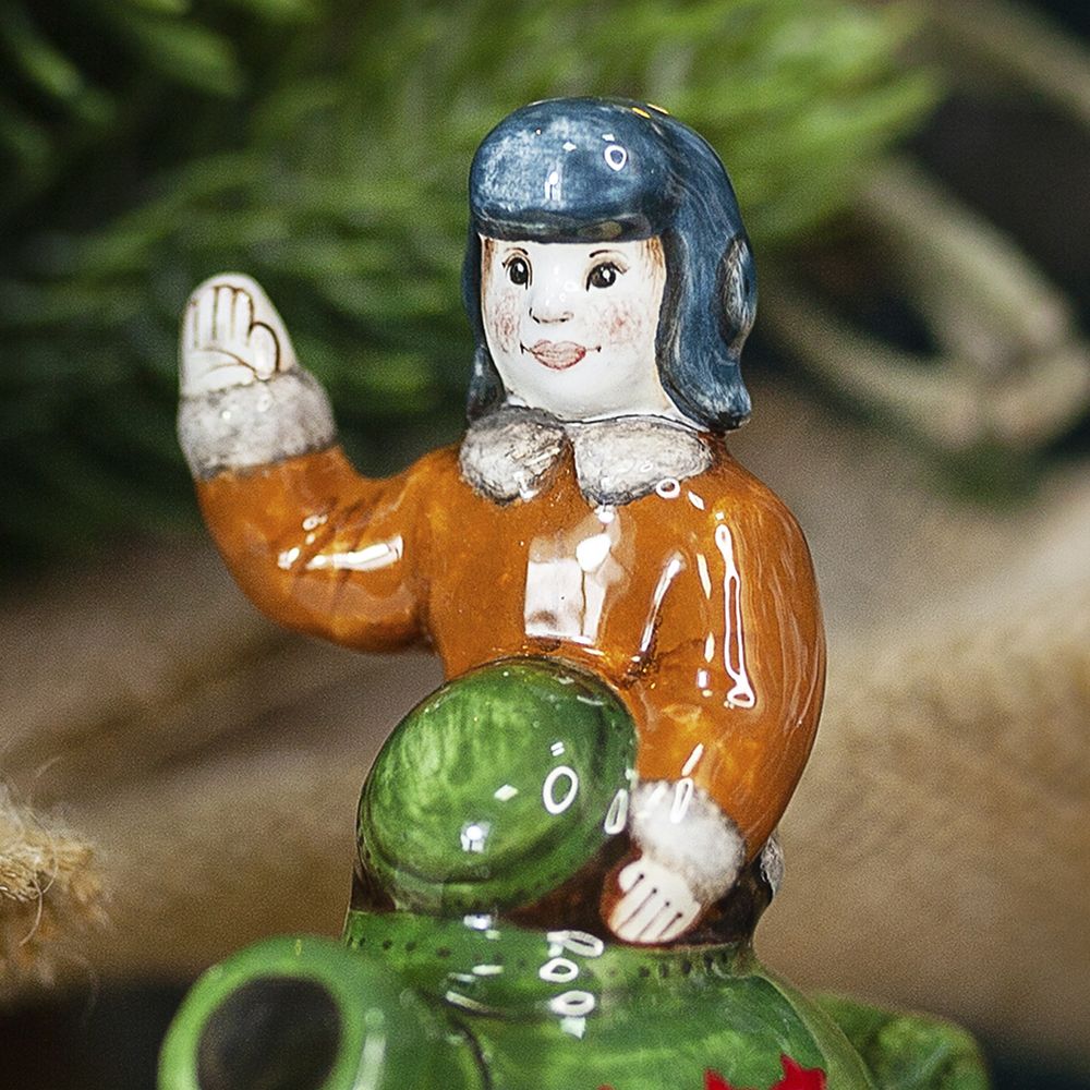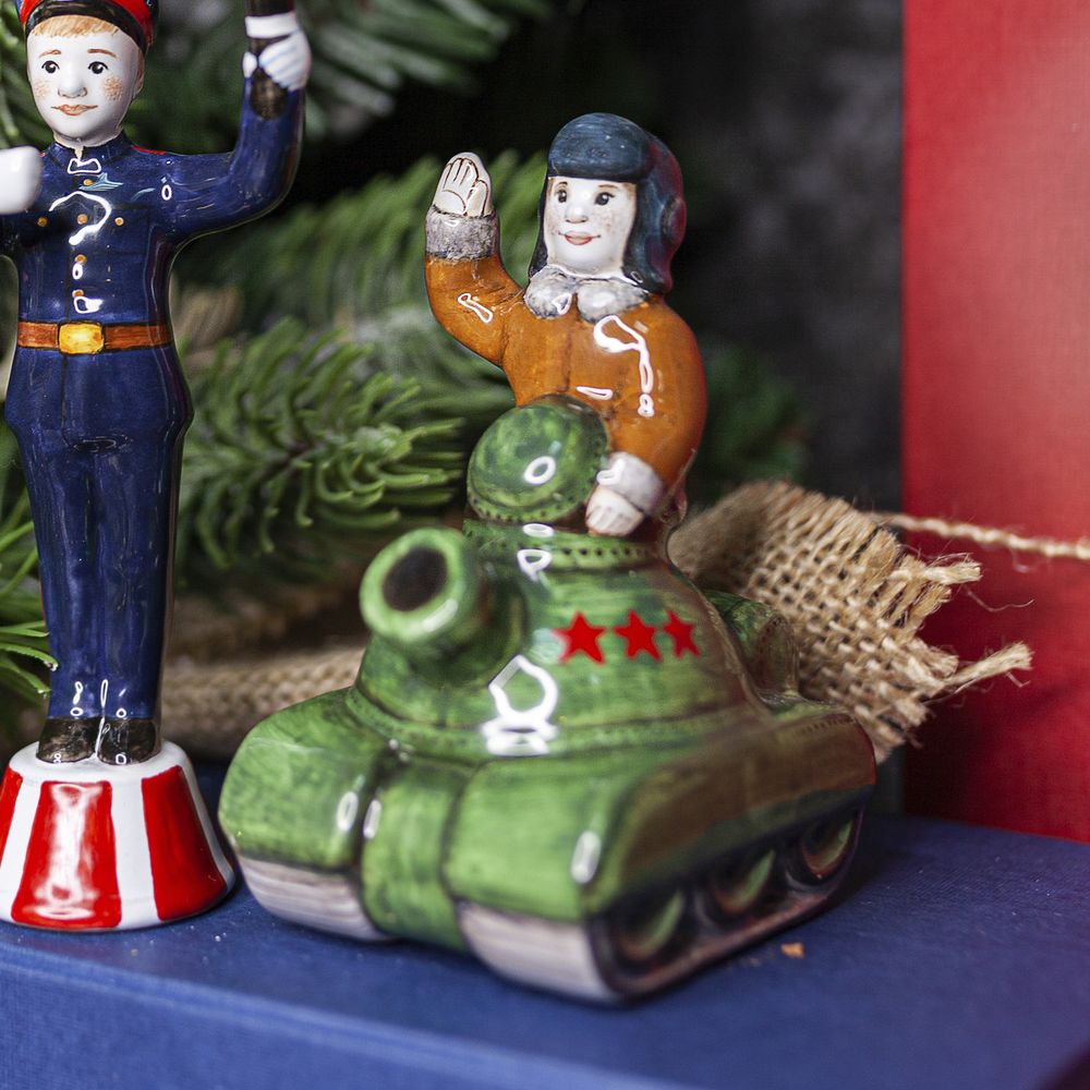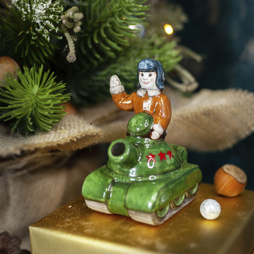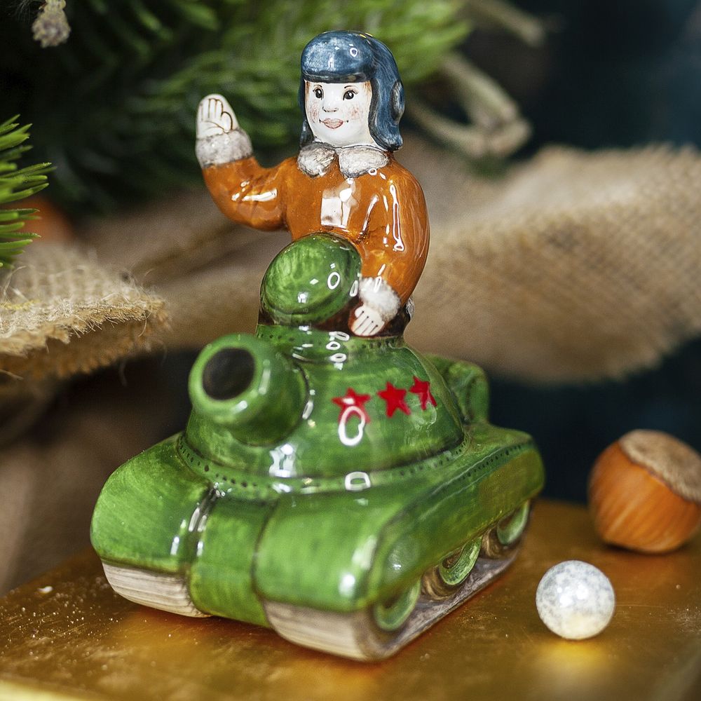 Это изделие ручной работы входит в коллекцию “Выбор профессии”. Боевая машина – это символ героического подвига для будущих защитников отечества и олицетворение мужества. Сувенир можно подарить на Новый год, 23 февраля, а также на любой другой праздник. Художник нарисовал на танке яркие звезды как символ побед. Фигурка маленького воина поможет передать пожелания быть сильным, достигать поставленных целей.