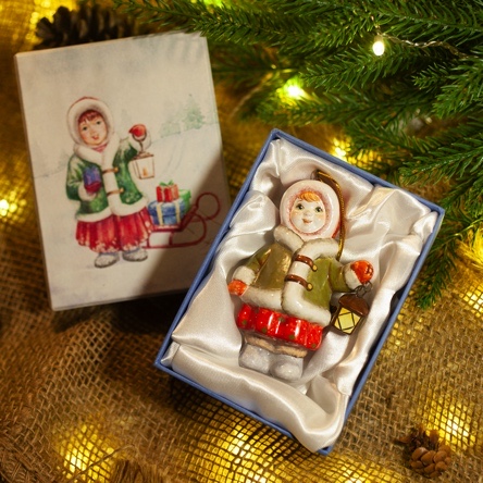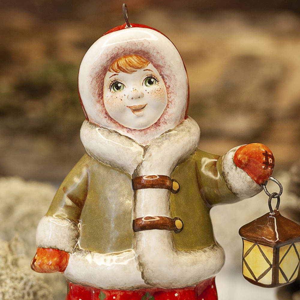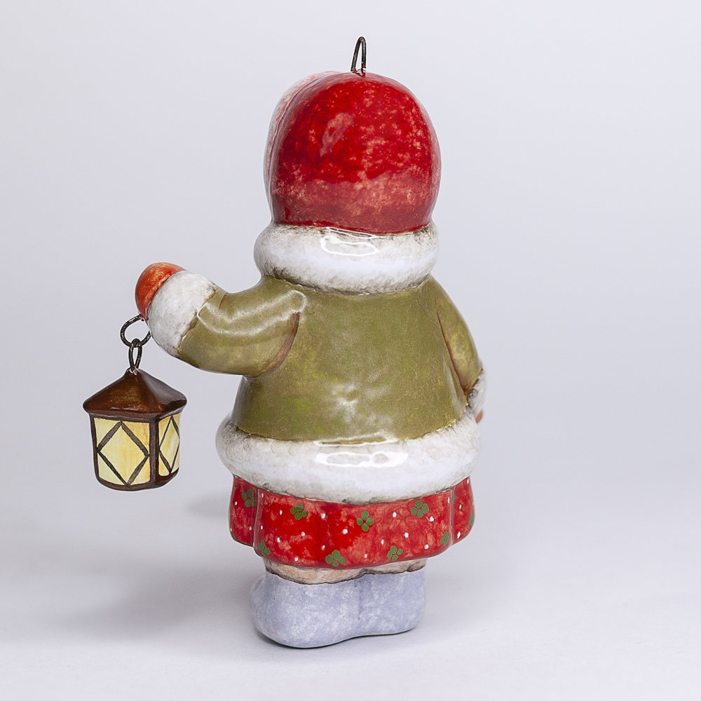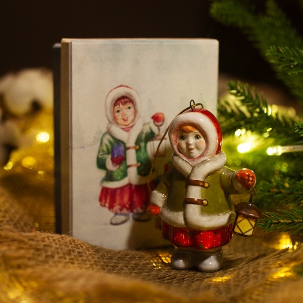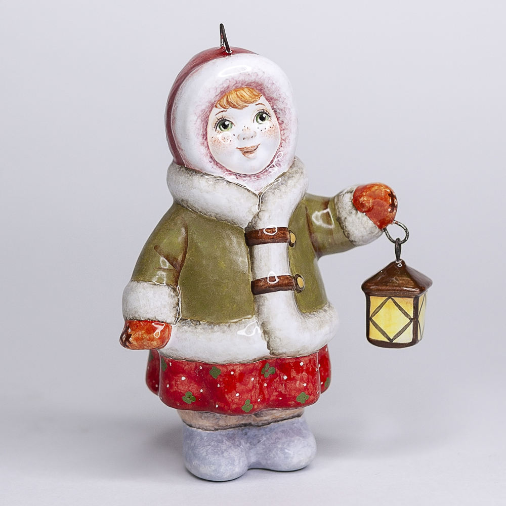 Эксклюзивное изделие ручной работы входит в коллекцию «Зима пришла» и представляет собой фигурку девочки, вышедшей на зимнюю улицу, в коротком, но теплом полушубке, валенках, меховой шапке, с фонарем в руке. Видно, что малышке не страшны ни темнота, ни мороз. Широко распахнутые глаза полны любопытства. Игрушка смотрится ярко и непосредственно, будет чудесным украшением новогодней елочки, милым подарком и замечательно подойдёт для оформления интерьеров, порадует коллекционеров.
