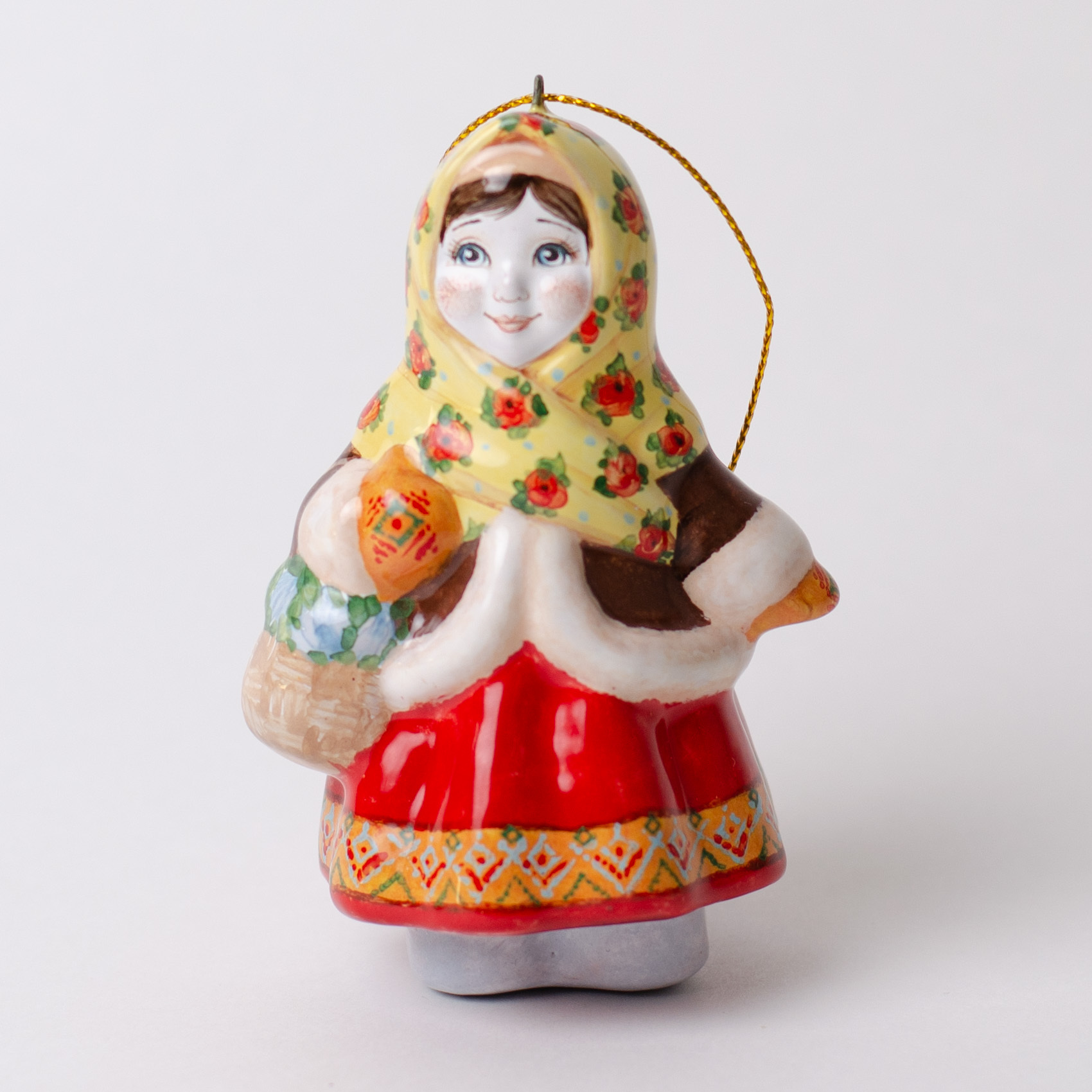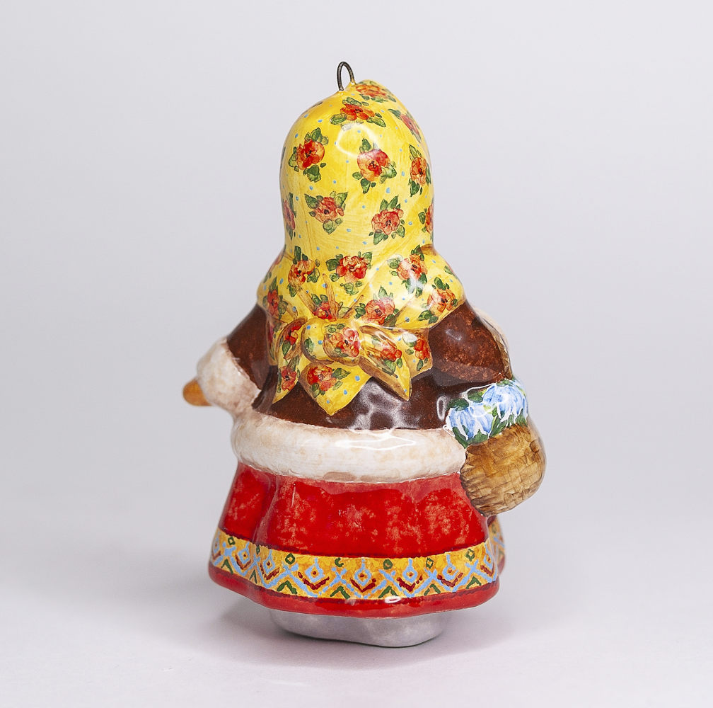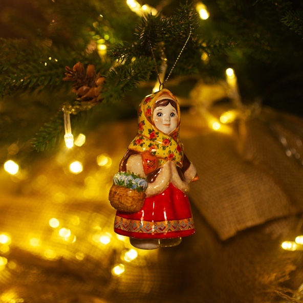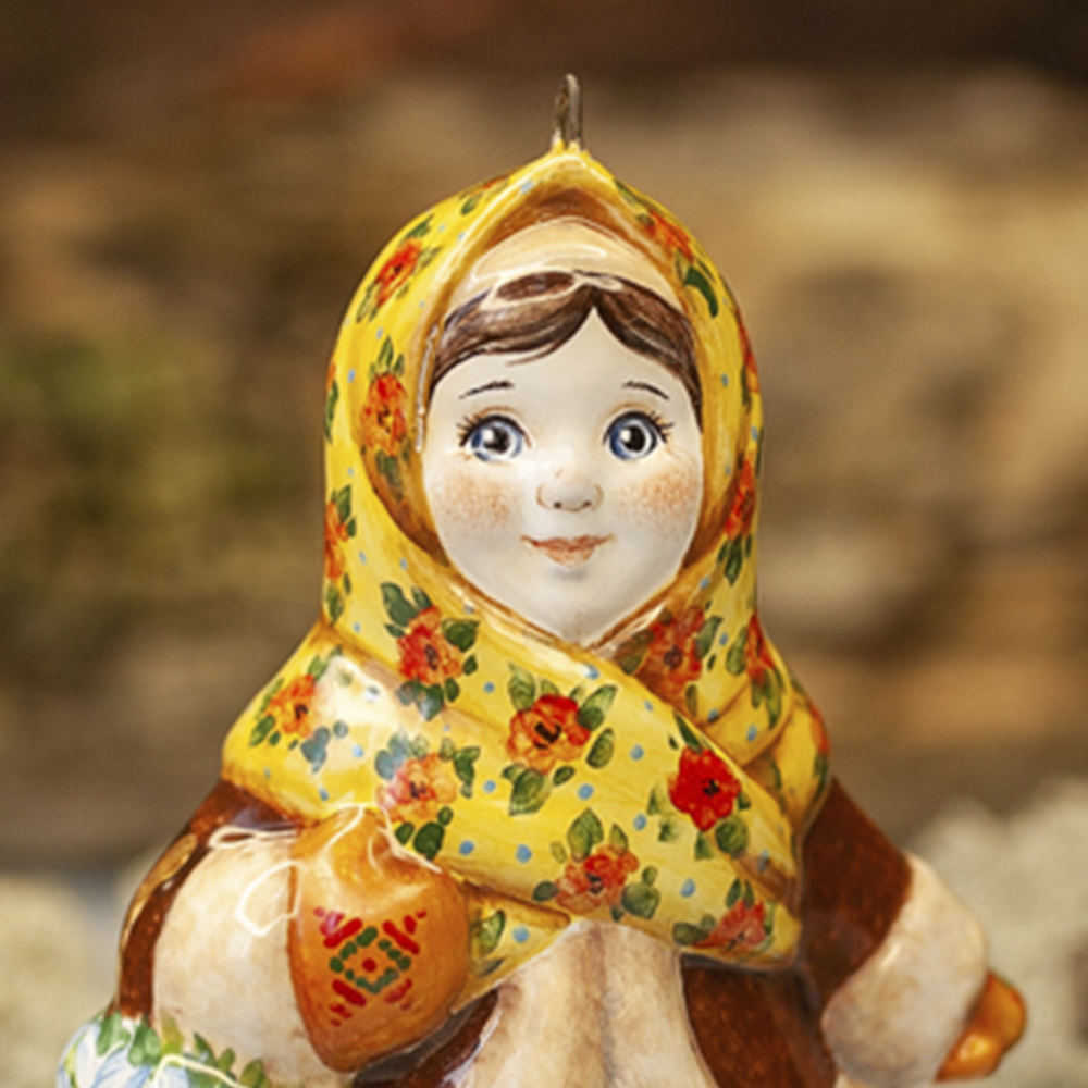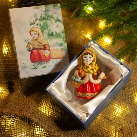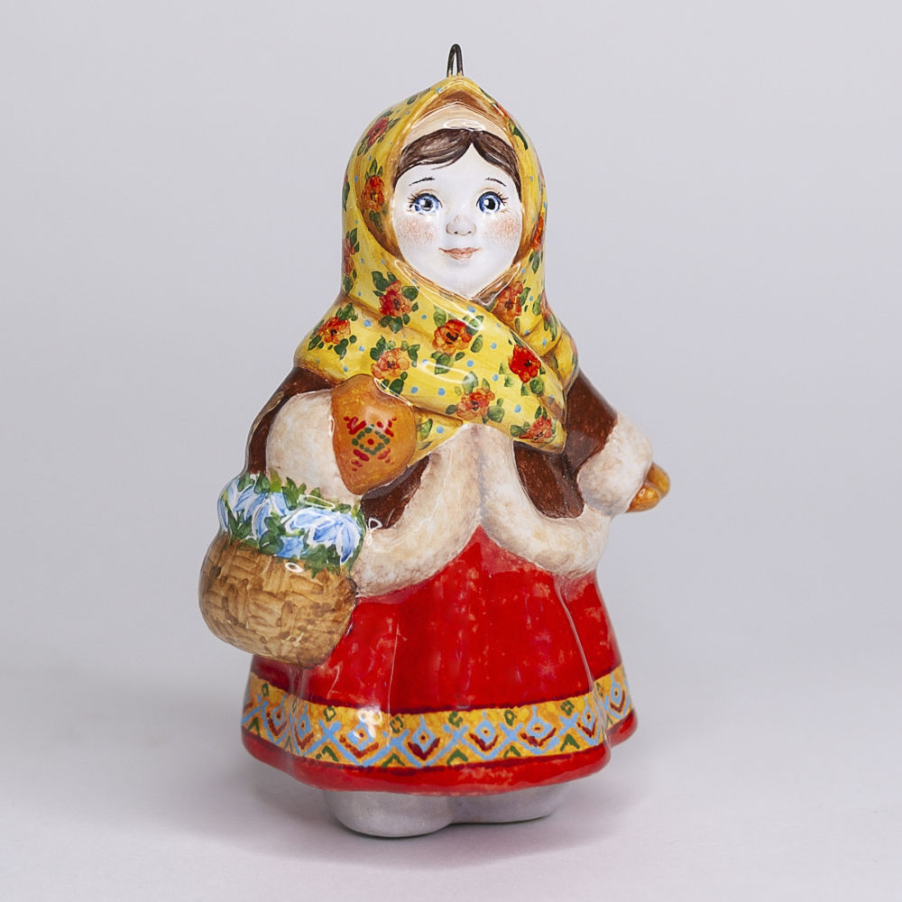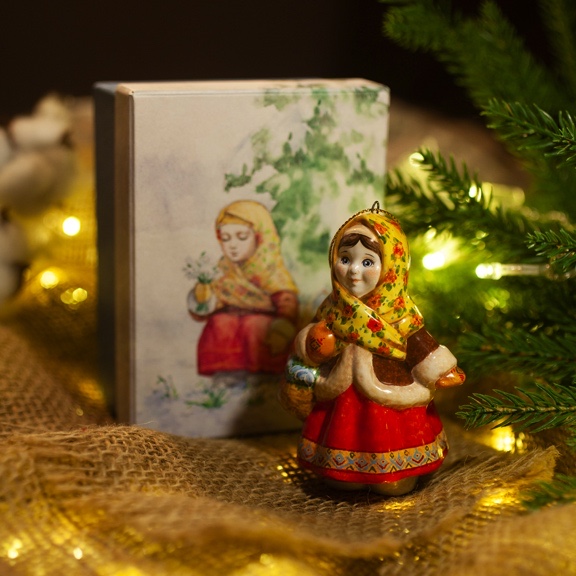 Эксклюзивное изделие ручной работы входит в коллекцию «Зима пришла» и представляет собой фигурку деревенской девочки, в ярком цветастом платке, повязанном крест накрест поверх короткого полушубка, в красной юбке с рисунком по подолу, в рукавичках с вышивкой, с корзинкой подснежников в руке. Это будто всем полюбившаяся Настенька из волшебной сказки 12 месяцев. Игрушка смотрится ярко и непосредственно, будет чудесным украшением новогодней елочки, милым подарком и замечательно подойдёт для оформления интерьеров, порадует коллекционеров.