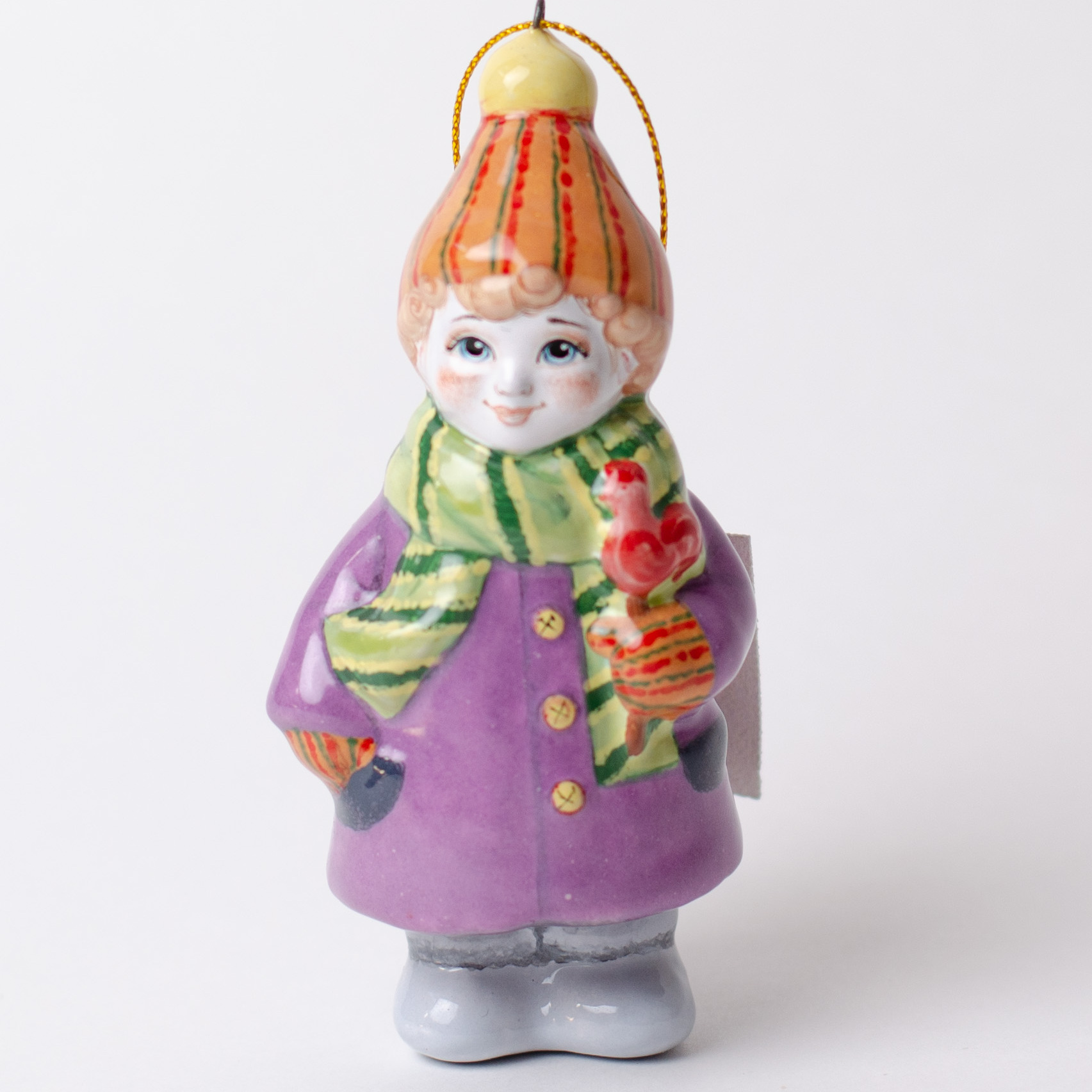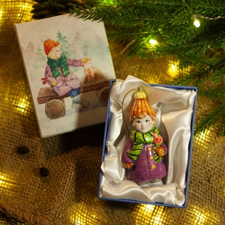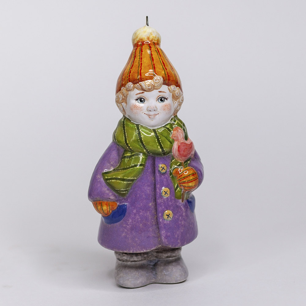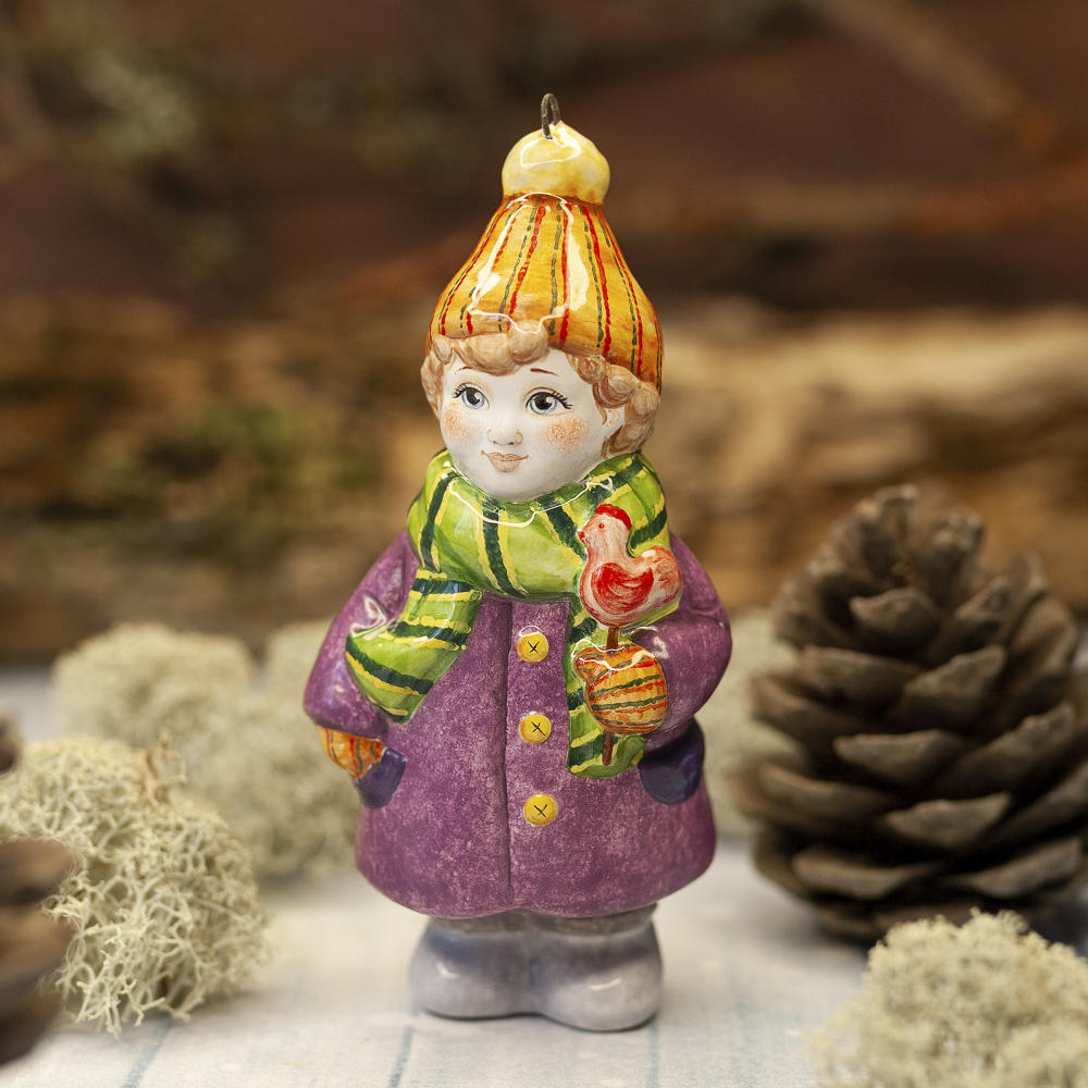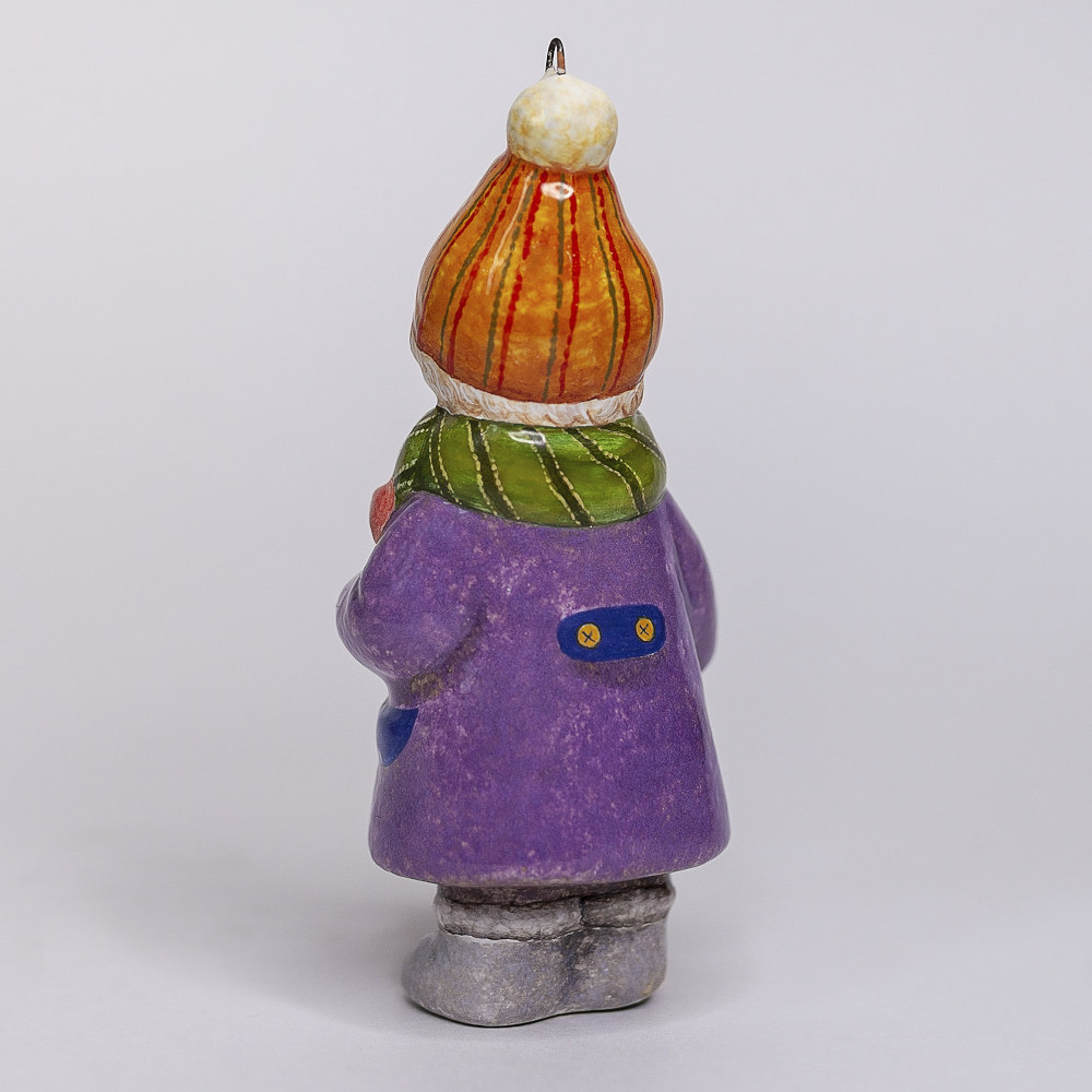 Эксклюзивное изделие ручной работы входит в коллекцию «Зима пришла» и представляет собой фигурку девочки, со смешными, непослушными кудряшками, выбивающимися из под оранжевой шапки с помпоном, в ярком фиолетовом пальто, с зелёным шарфом на шее и ледянцом в руке. Игрушка смотрится ярко и непосредственно, будет чудесным украшением новогодней елочки, милым подарком и замечательно подойдёт для оформления интерьеров, порадует коллекционеров.