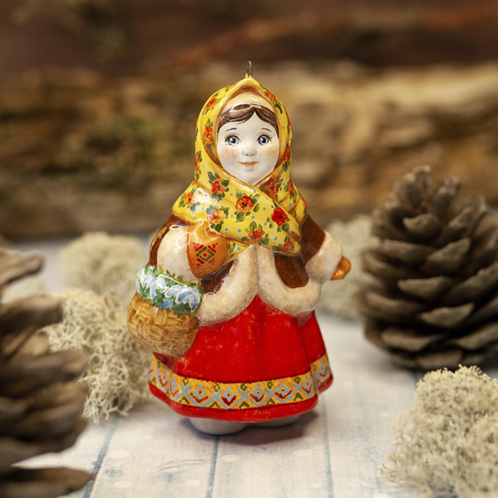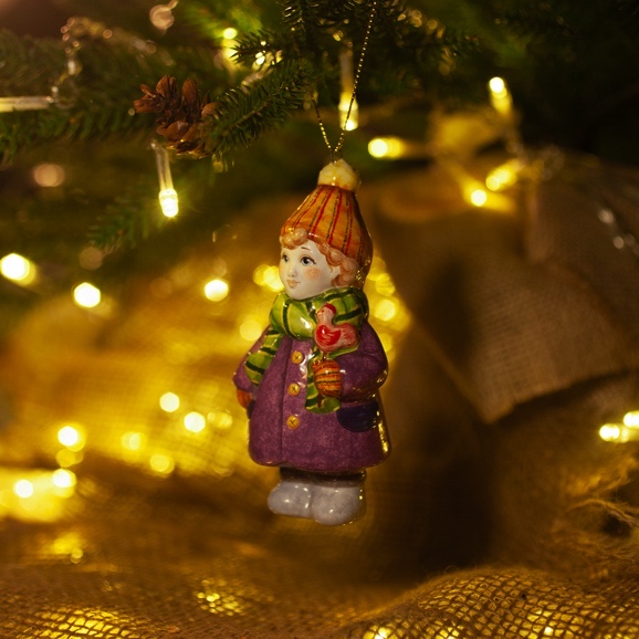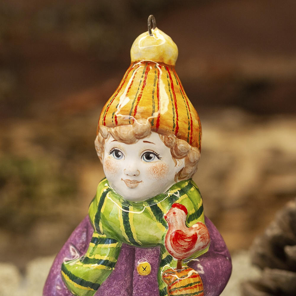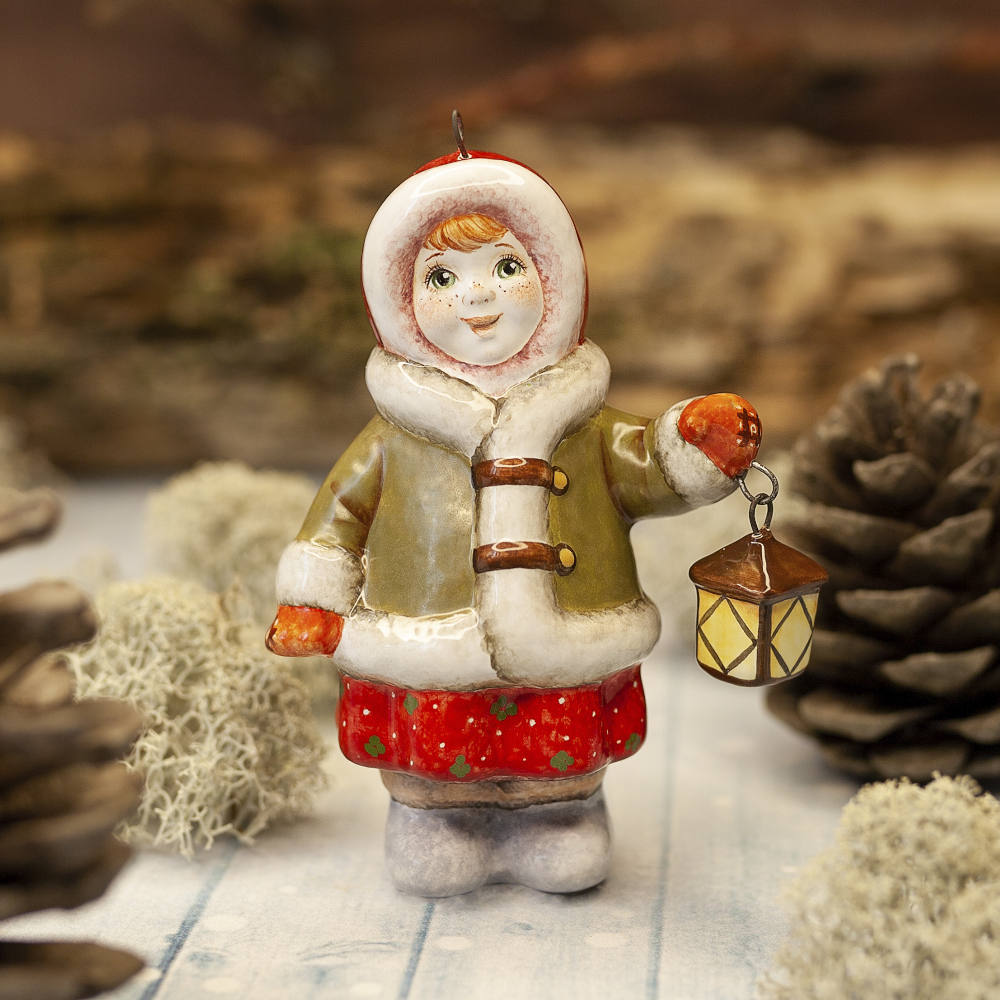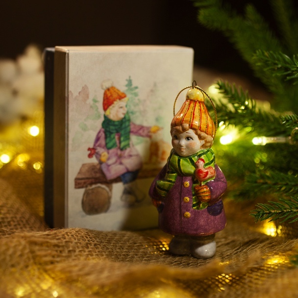 Эксклюзивное изделие ручной работы входит в коллекцию «Зима пришла» и представляет собой фигурку девочки, со смешными, непослушными кудряшками, выбивающимися из под оранжевой шапки с помпоном, в ярком фиолетовом пальто, с зелёным шарфом на шее и ледянцом в руке. Игрушка смотрится ярко и непосредственно, будет чудесным украшением новогодней елочки, милым подарком и замечательно подойдёт для оформления интерьеров, порадует коллекционеров.