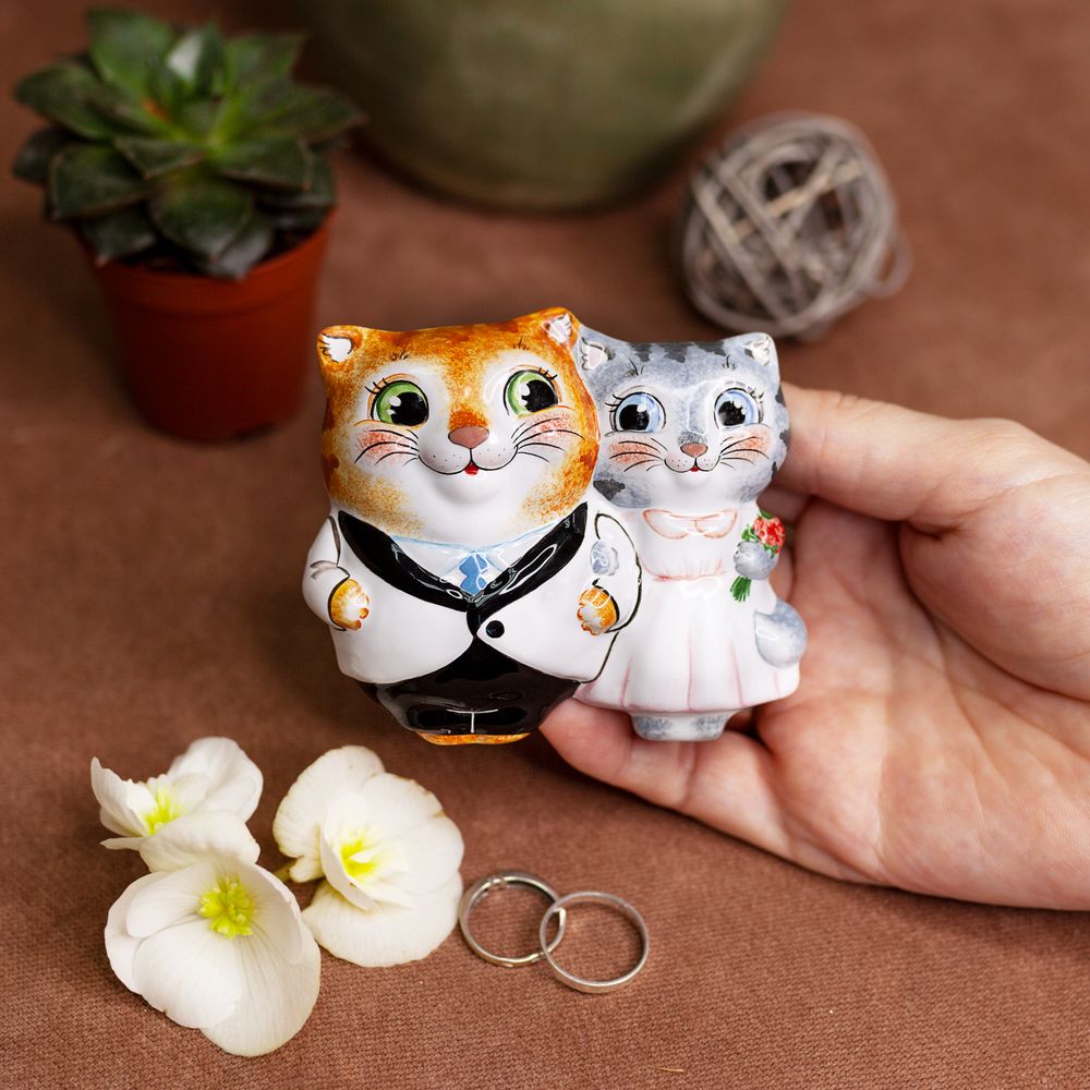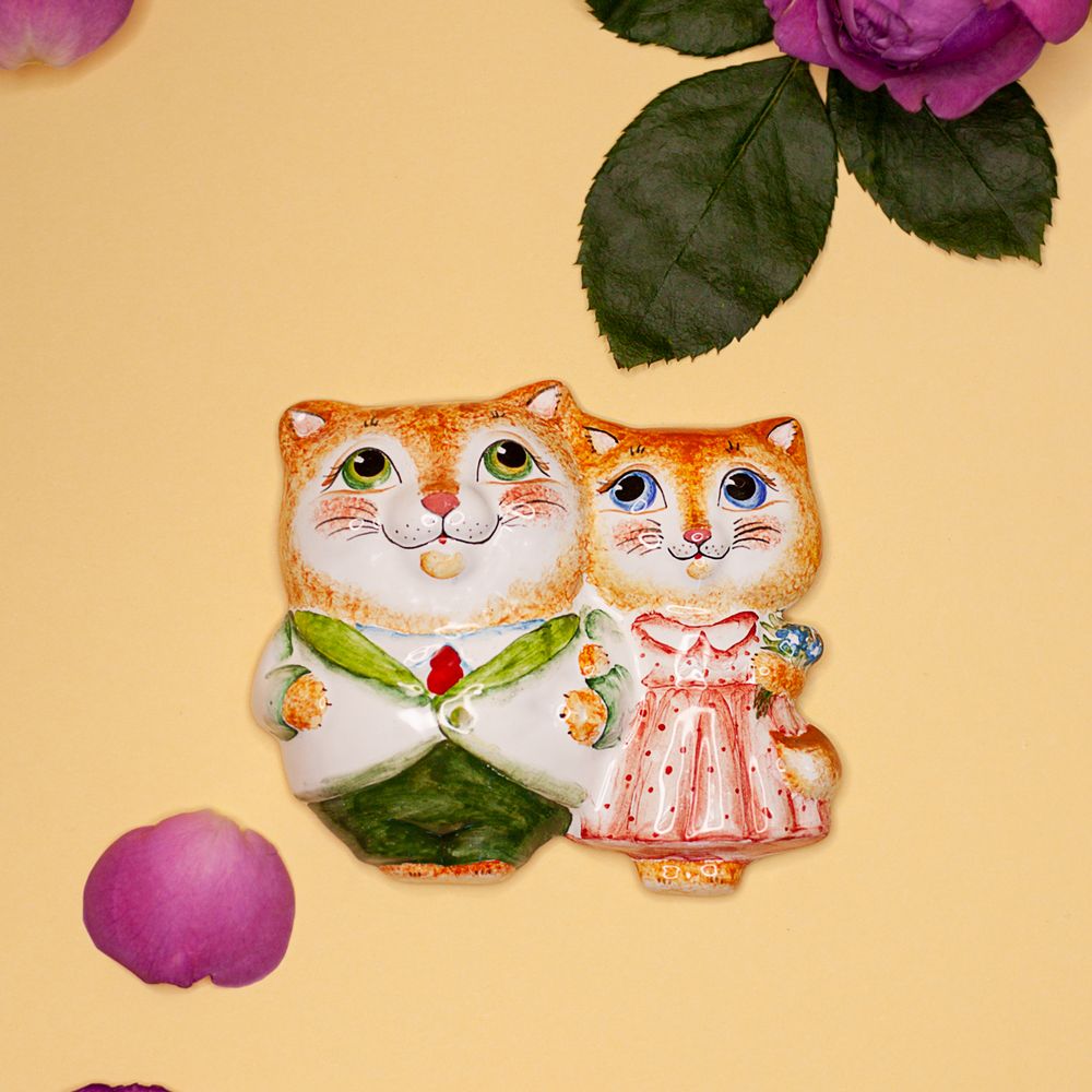 Изделие ручной работы представляет элемент декора, сувенир на магнитной основе, выполненный в виде фигурок уверенного в себе джентельмена – кота, который держит под руку счастливую подругу с букетом цветов. Данное изделие украсит интерьер, создаст настроение, будет замечательным подарком на все случаи жизни.