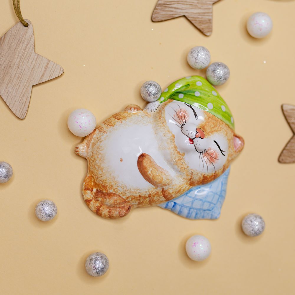 Изделие ручной работы представляет элемент декора, сувенир на магнитной основе, выполненный в виде плоской фигурки блаженствующего пухлого котика, довольно устроившегося соснуть на мягкой подушке после сытного обеда. Данное изделие украсит интерьер, создаст настроение, будет замечательным подарком на все случаи жизни.