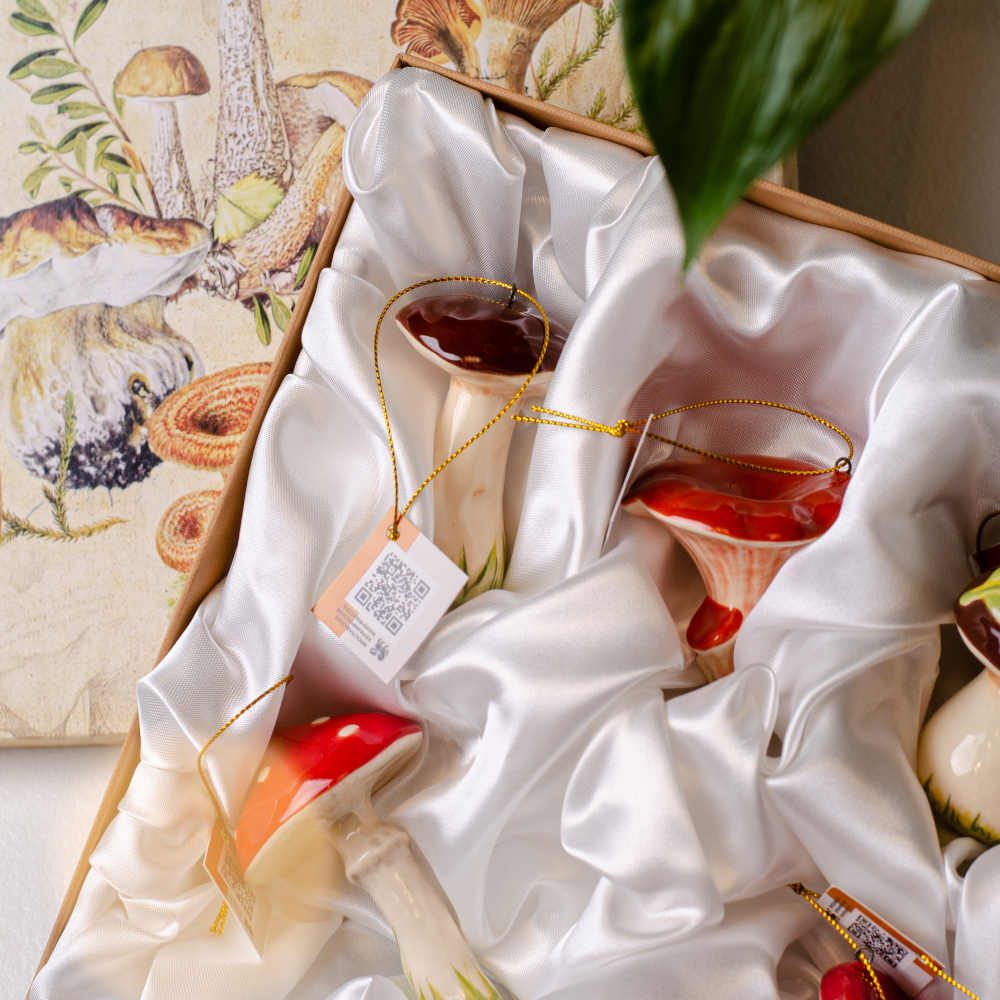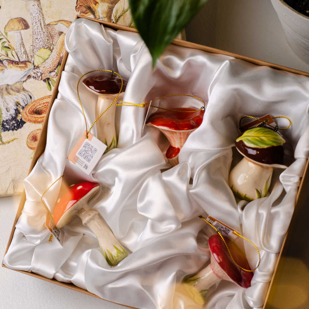 Набор керамических подвесов “Грибы” включает пять фигурок: мухомор, белый гриб, лисичка, подберезовик, волнушка