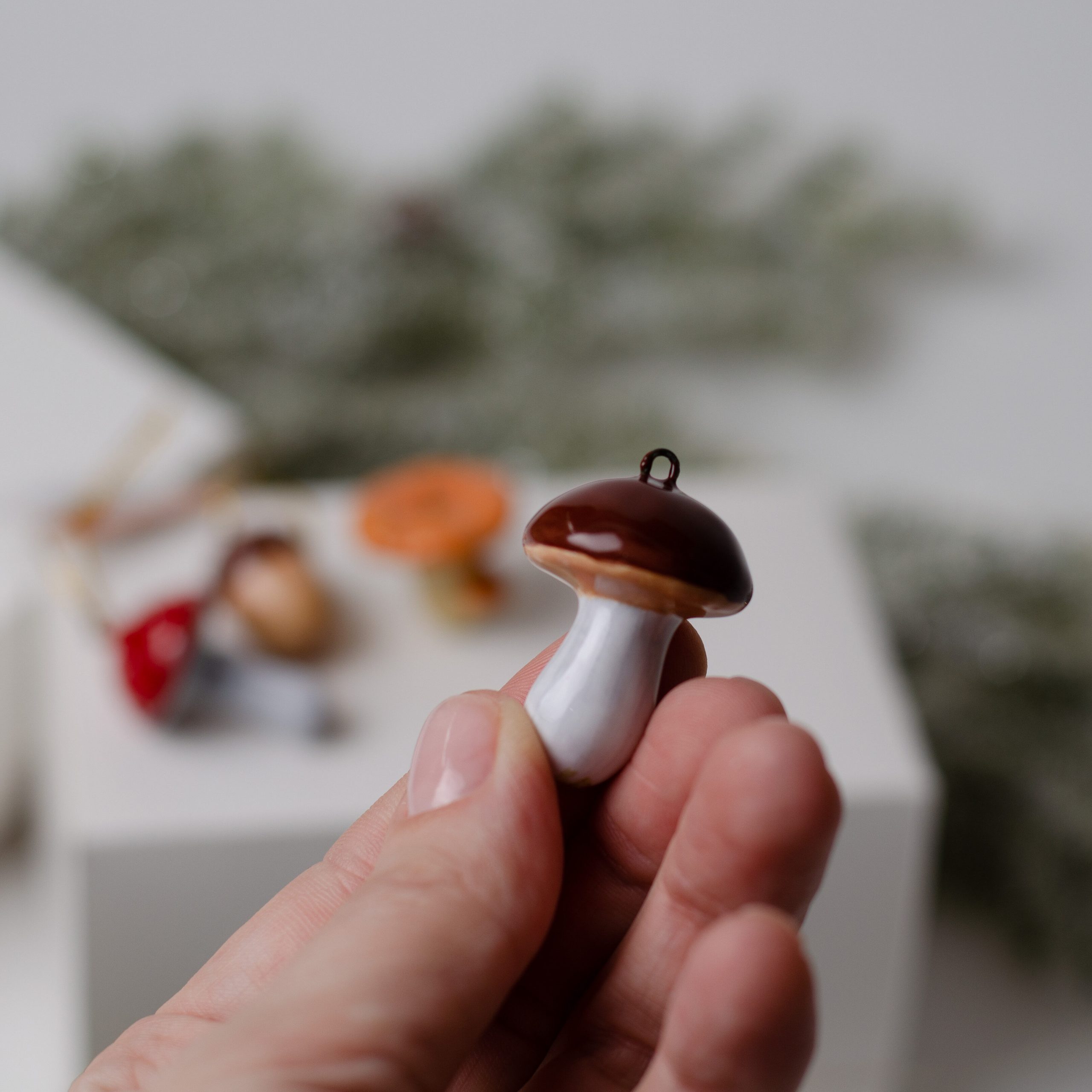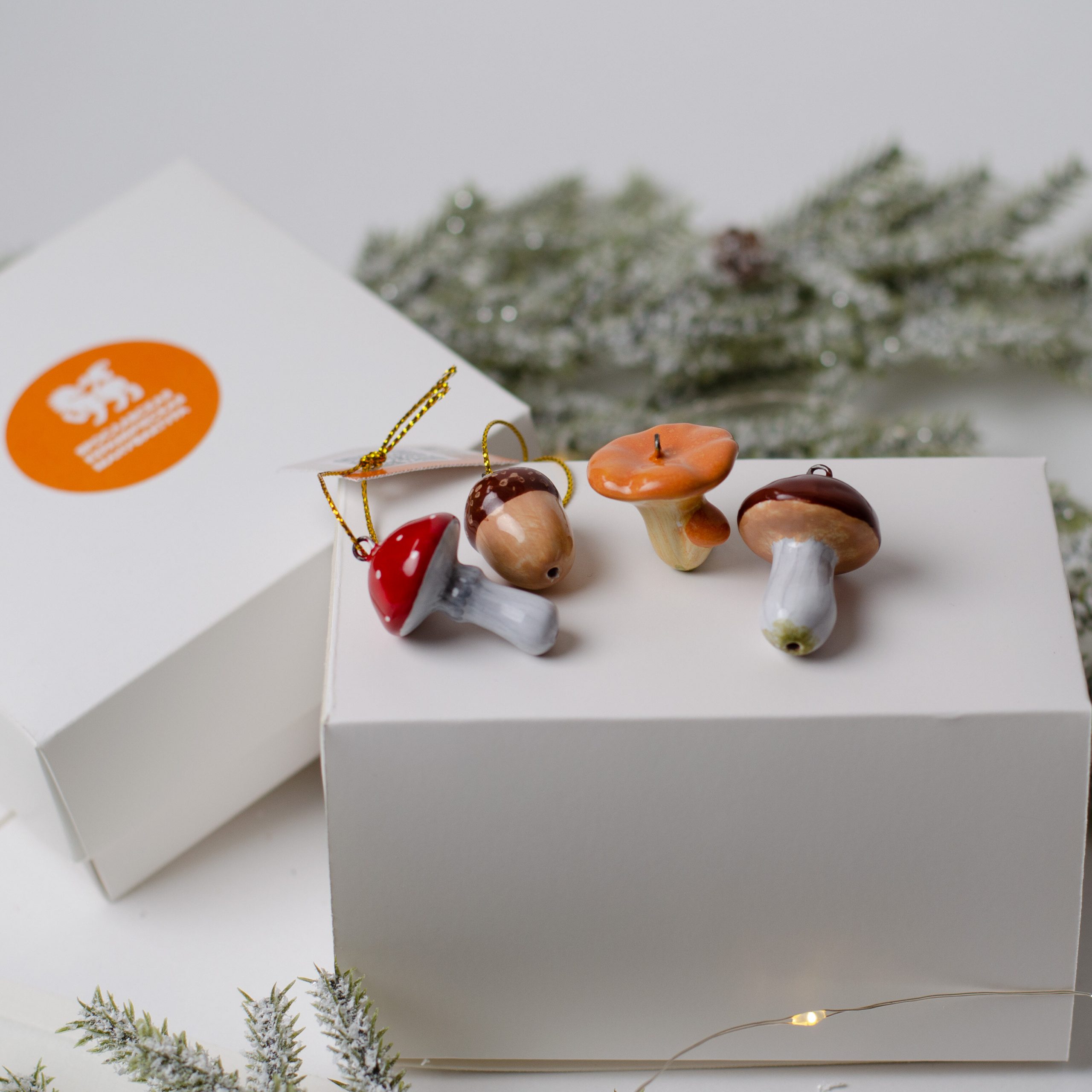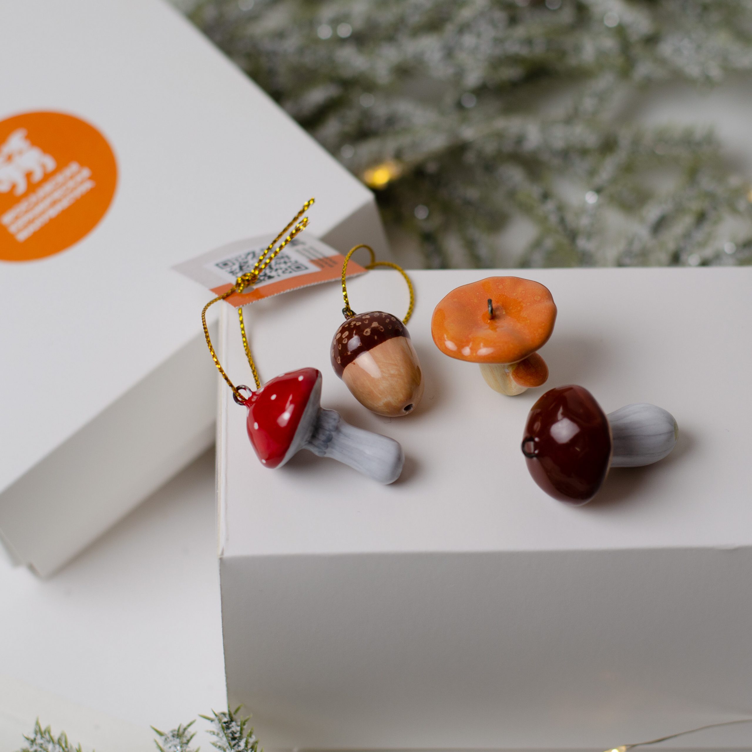 Погрузитесь в атмосферу зимнего волшебства с нашим изысканным набором елочных украшений №6. Этот комплект включает в себя четыре миниатюрные фигурки: Гриб лисичка, Подберезовик, Мухомор, Желудь и является частью коллекции миниатюрных новогодних украшений “Игрушки для маленькой елочки”.