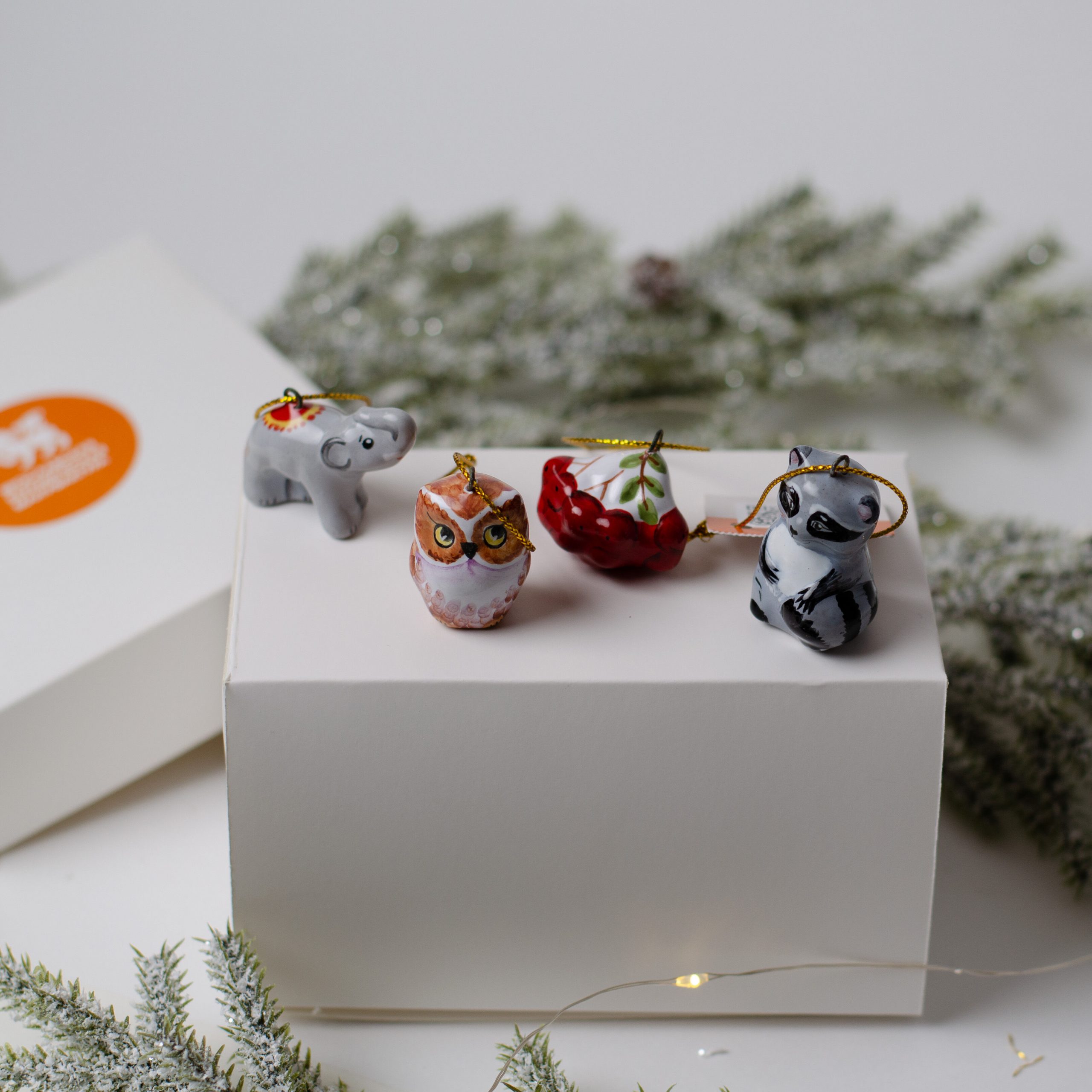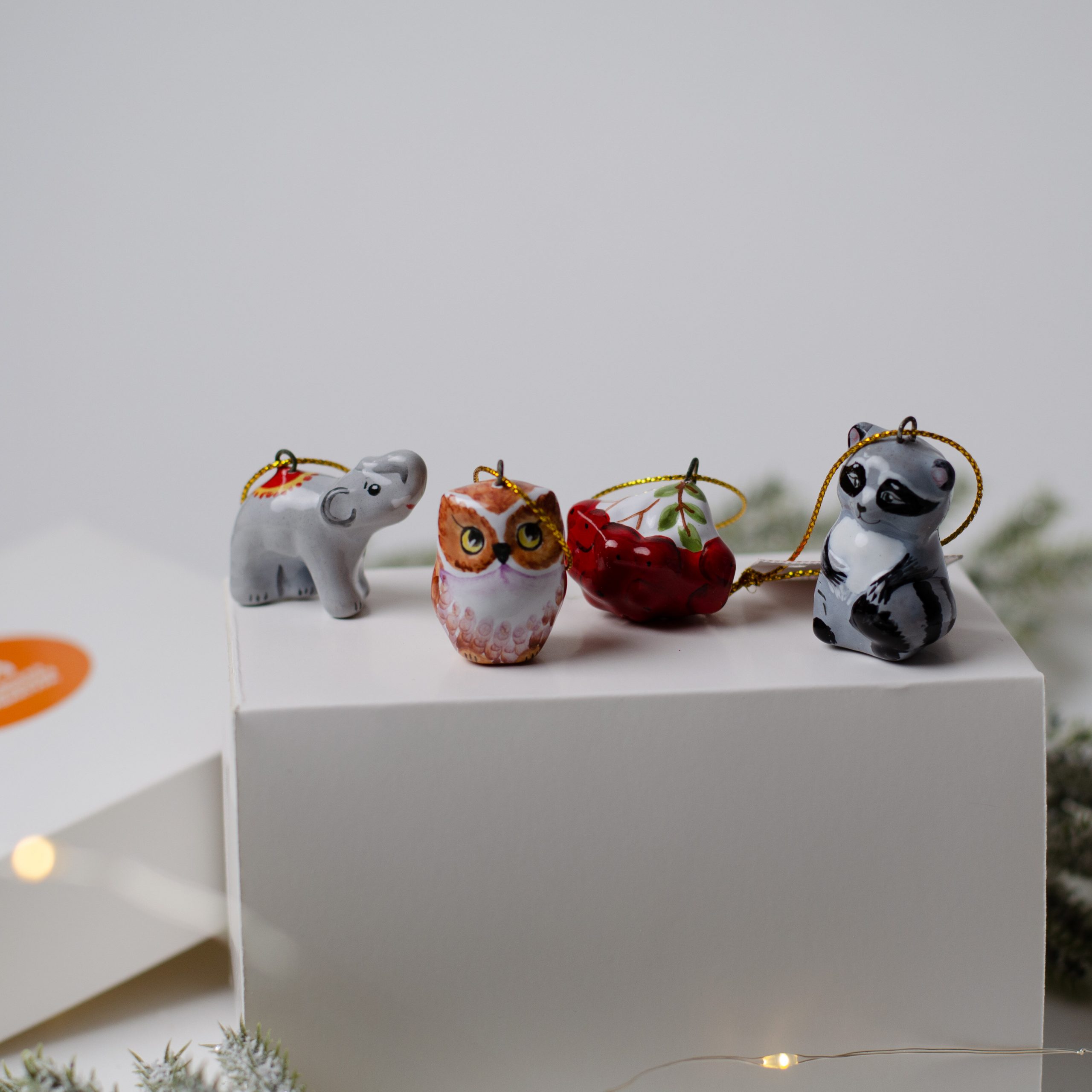 В наборе елочных украшений №8 вы найдете четыре миниатюрные фигурки: Веточка рябины, Филин, Енот и Слоник. Эти небольшие новогодние игрушки из коллекции “Игрушки для маленькой елочки” наполнят ваш дом атмосферой уюта и праздничного чуда.