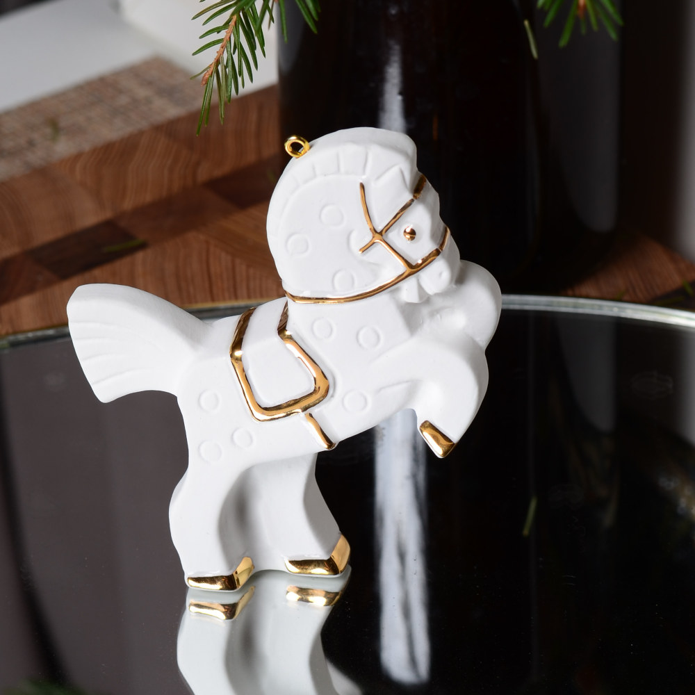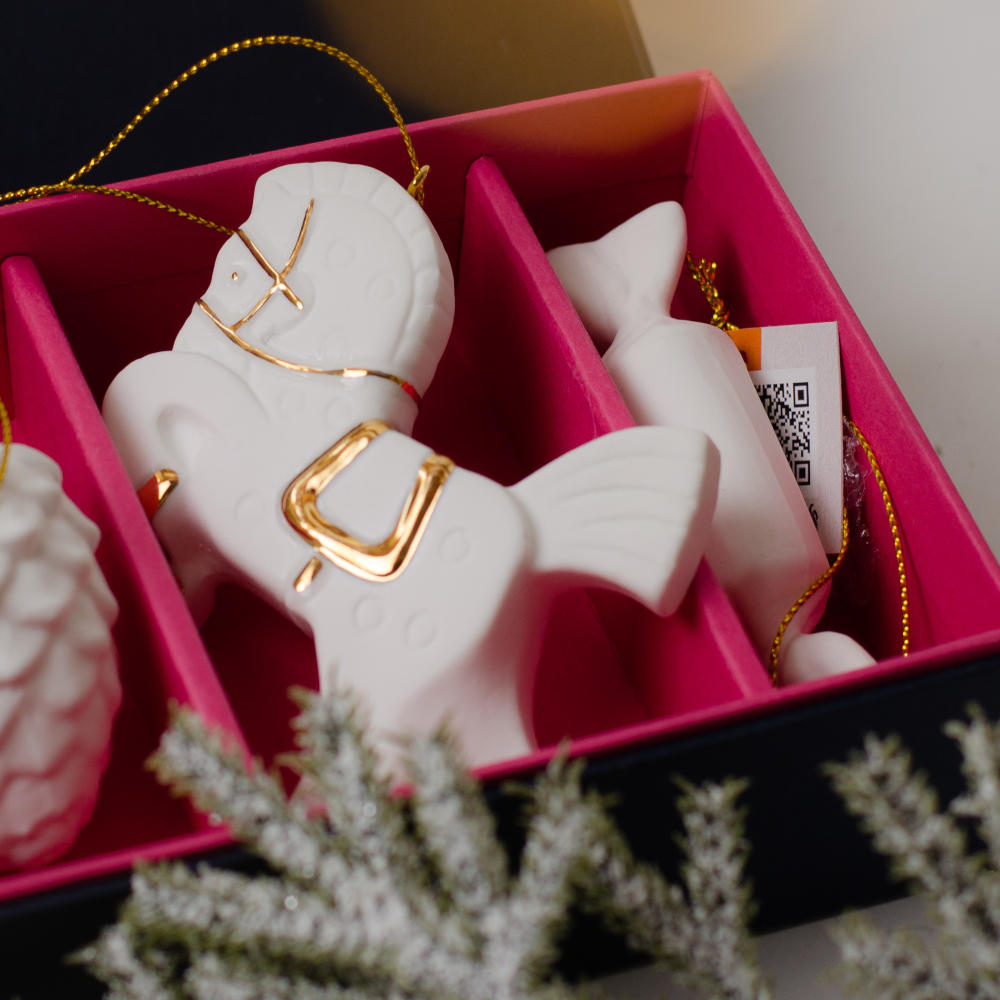 Подвесы в наборе “Шишка, Лошадка, Конфета”, вручную изготовлены из фарфора бисквита и украшены ручной росписью золотом. Текстура фарфора бисквита придает им мягкий матовый оттенок, который прекрасно сочетается с золотом, создавая эффект благородства и изысканности.