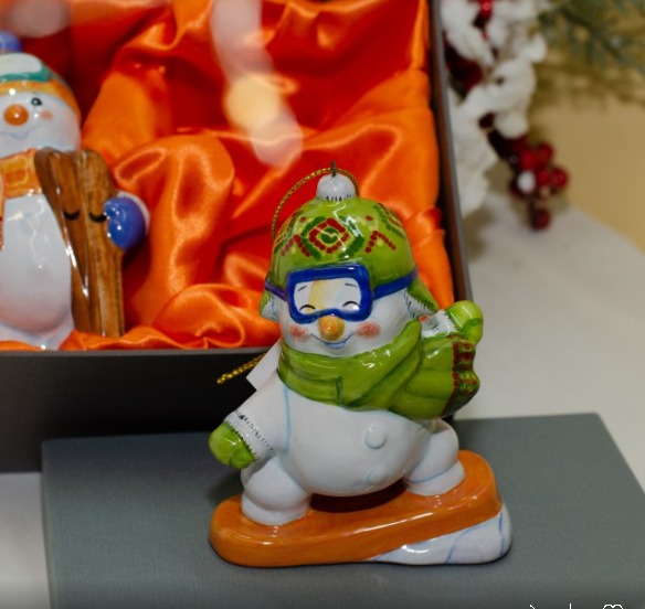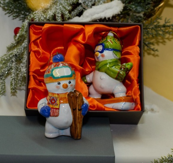В набор елочных игрушек из коллекции “Снеговики спортсмены” входят 2 снеговика: “Снеговик лыжник” и “Снеговик сноубордист”. Подвесы изготовлены вручную в технике майолики.